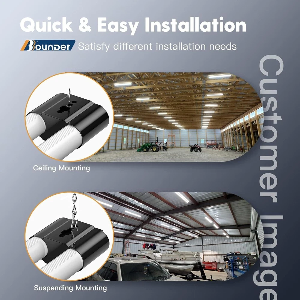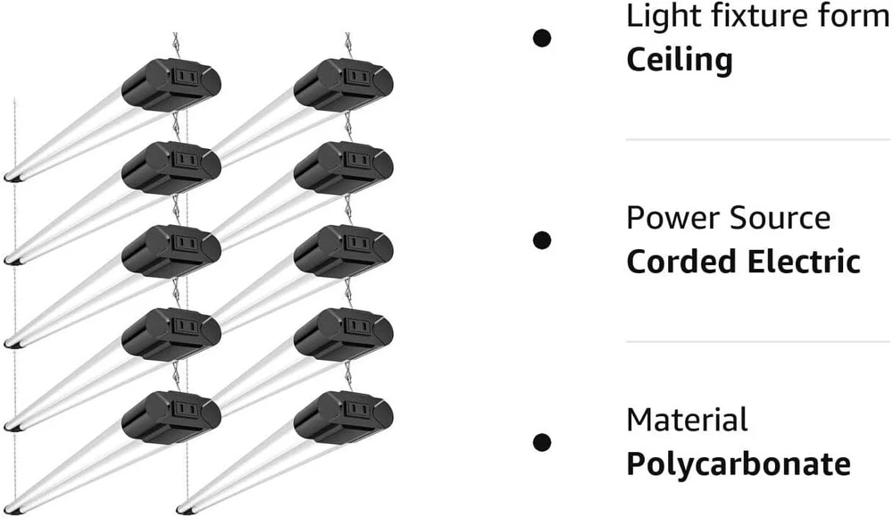 You may also like LED Garage Light 4 Pack 120W Ultra Bright LED Shop Light with 4 Adjustable Panel 50.69 USD Free shipping 2 Pack LED Workshop Garage Shop Light 4FT Plug in Linkable Utility Light Fixture 51.99 USD Free shipping 4ft LED Shop Light 10,000 Lumen with Motion Integrated Motion Sensor Linkable 53.97 USD Free shipping 10 Pack Linkable LED Utility Shop Light, 4400 LM, 6500K Cool Daylight, 4 FT Integrated Fixture for Garage, 40W Equivalent 250W, Surface + Suspension Mount, Black Color 6500k Black Shape Linear Material Polycarbonate (PC) Finish Type Powder Coated Light Source Type LED Super brightness: With 4400 lumens brightness at 6500K cool daylight white, these 4ft led shop lights only consume 40W while provide the bright illumination with 250W (6 times more than conventional fluorescent lights). It is an amazing LED Efficiency of 110 lm/w, which can save the electricity expense for you. "D" shaped tube for durability: This Bbounder shop lighting adopts brand new and creative "D" shaped design aiming to solve 3 major problems that customers encounter most, respectively bending tubes, dark spots and dead lights. Simple installation: Follow our installation guide for a quick and easy setup with included mounting hardware (56in Power Cord with Plug)! Directly mount to the ceiling or suspend from the ceiling for instant bright shop light in your garages, basements, warehouses, and storage area. Daisy-chain linkability: 4ft linkable led shop light can seamlessly connect up to 4 lights with plug connections for energy savings in your home, office or any workspace. Wide application: Bbounder led shop lights can be applied in multiple areas, such as home garages, barns, attics, workshop, workbench, utility room, shed, equipment room, tool room, etc. Let there be light! You may also like Welder Extension Cord Heavy Duty 25 Feet 6-50 Nema R Plug Lighted Welding Cord 45.49 USD Free shipping Rock Tumbler Media Rock Polishing Supplies Kit 4 Stage Bulk Grit for 8 Years Up 49.39 USD Free shipping 75 Ft 12/3 Outdoor Extension Cord Waterproof Heavy Duty W/ Lighted Indicator End 60.08 USD Free shipping Camo Tripod Shooting Rest with Lightweight Aluminum High Density Foam Grips 68.21 USD Free shipping Leg Flat Panel Office Desk Space Heaters Dog House Cat Kitty Pet Heated Warmer 51.99 USD Free shipping Mobile TV Stand with Wheels Adjustable Rolling TV Cart for 32 to 75 inch LED TV 87.98 USD Free shipping LED Gold Capiz Star Christmas Tree Topper Spiral Base Holiday Decoration New 30.97 USD Free shipping 6 Tier Shoe Storage Cabinet 24 Pair Plastic Shoe Shelves Organizer Entryway 51.99 USD Free shipping Nelly Entertainment Center TV Stand Columbia Walnut/Black Living Room Furniture 53.81 USD Free shipping Letter/Legal File Tote Box Storage Bin Tote Organizer with Durable Latching Lid 55.35 USD Free shipping 2 Pack LED Workshop Garage Shop Light 4FT Plug in Linkable Utility Light Fixture 51.99 USD Free shipping Emergency Food Rations Vanilla Poundcake Bar Supply for Disaster Less Sugar New 78.36 USD Free shipping