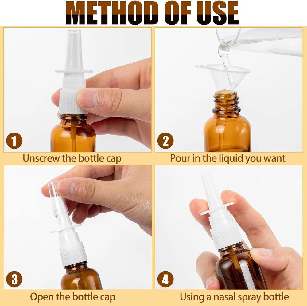 VALUE PACK: Package include 6 Pcs glass amber nasal spray bottles for your nose, 2Pcs label and 2Pcs funnels, that you could write on, so you could identify what was inside COMFORTABLE: The glass nasal spray bottles refillable is designed to be gentle and comfortable, making it easy to use even for those with sensitive nasal passages CONVENIENT SIZE: The empty amber nasal spray bottles come in a compact size, making them easy to use on the go or while traveling, with you wherever you go ECO-FRIENDLY: These glass empty nasal spray bottle are reusable and can be refilled, making them an eco-friendly alternative to disposable nasal spray bottles PRECISE DOSAGE: The fine mist nasal spray nozzle ensures a precise dosage each time, ensuring that you get the right amount of saline solution Product Description