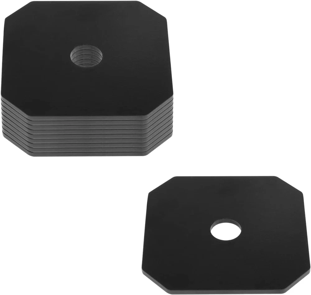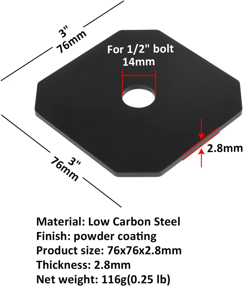 Carbon steel + Powder coating Prepunched hole size: 9/16"/14mm, fits 1/2" bolt Size: 3" x 3", Thickness: 2.8mm/12 Gauge Weight: 0.25lb/116g-1 pc, 2.73lb/1240g-1 pack Square plates washer can be used on a variety of wood materials Specification: Carbon steel + Powder coating Size: 3" x 3" Thickness: 2.8mm/12 Gauge Prepunched hole size: 9/16"/14mm Color: black Package size: 9x8x4cm Weight: 0.25lb/116g-1 pc, 2.73lb/1240g-1 pack Package include: 10 x Decorative Washer Plate