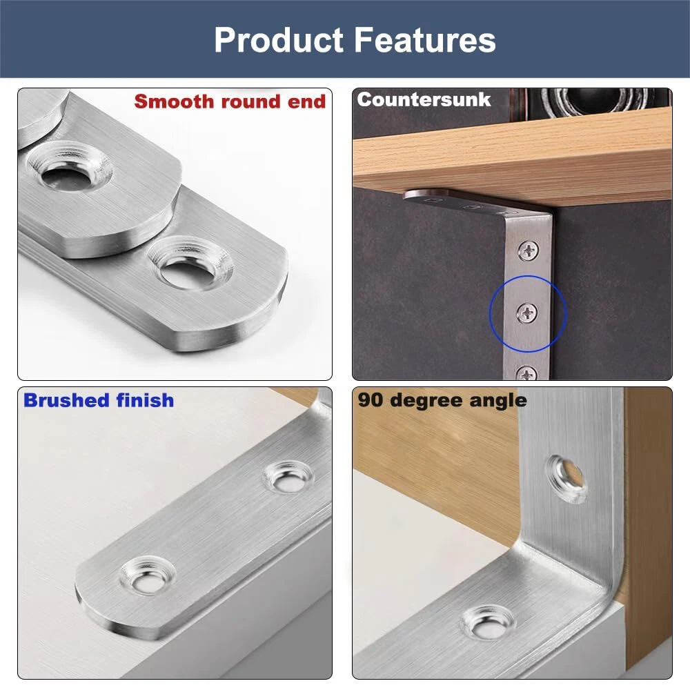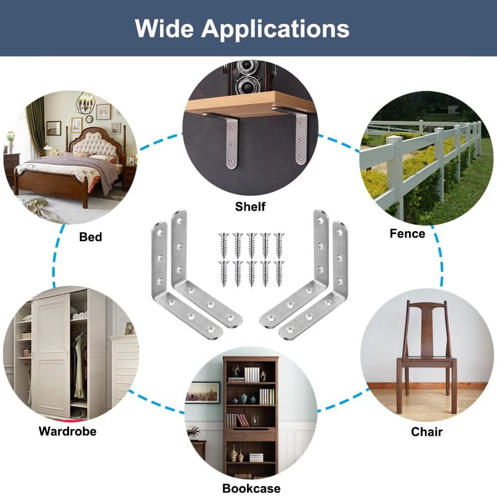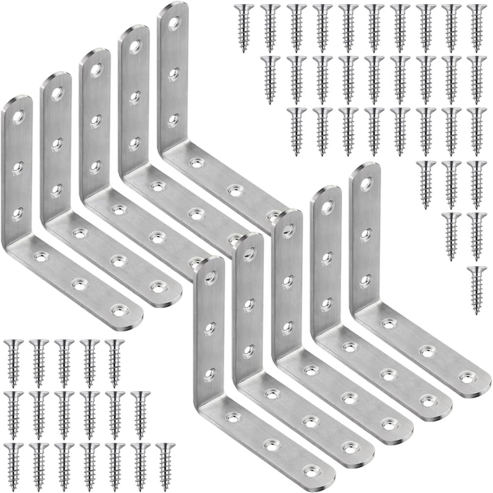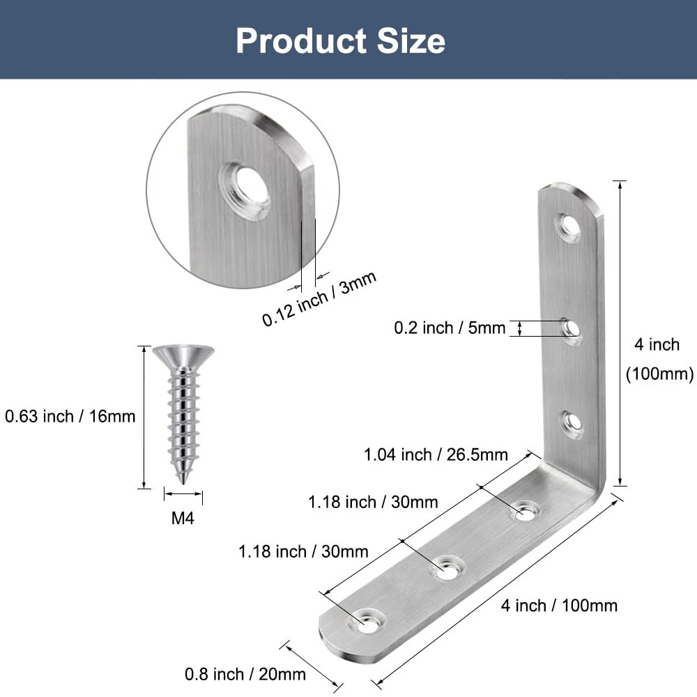 Feature: L brackets are made of high quality stainless steel. Excellent workmanship, rust-resistant, round end, brushed finish, no burrs, countersunk hole. Size: 4" x 4"/ 100 x 100mm, Thickness: 0.12"/ 3.0mm, Hole Dia: 0.2"/ 5mm. Package Include: 10 pcs corner brackets, 60 pcs stainless steel screws. Wide Applications: Corner braces can fasten 90 degree joints, wooden bed, table, chair, planter box, window, frame, cabinet, and any furniture. Easy to Install: The metal repair fixing braces comes with mounting screw, Just use screwdriver or drill to fix the hardware bracket in a breeze. Angle braces are perfect for repairing furniture, If your wooden table always shaking and buzzing, Ours support brackets can help you resolve this problem well.