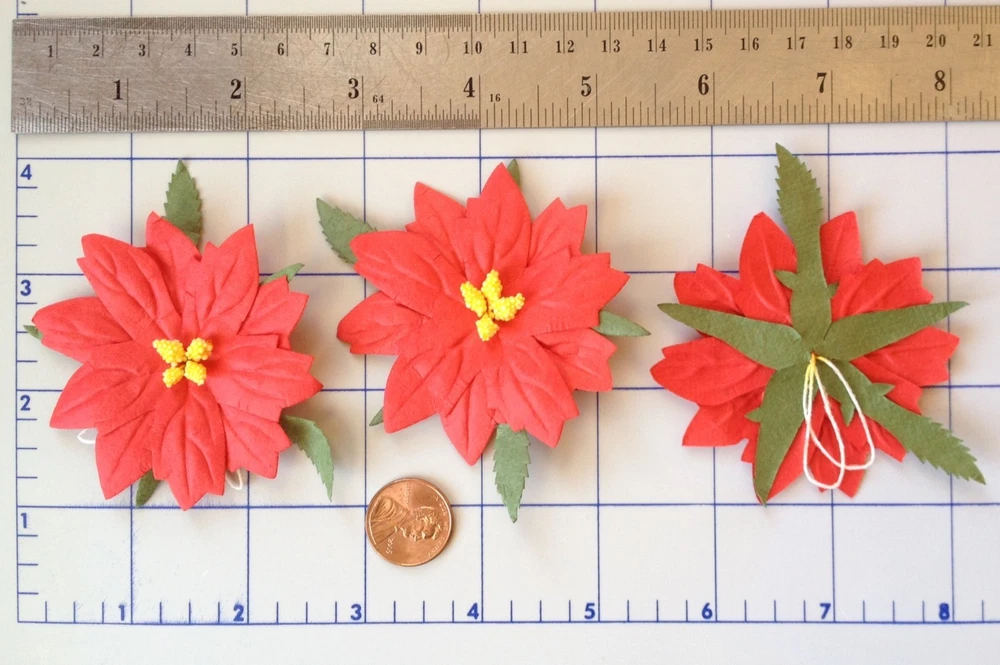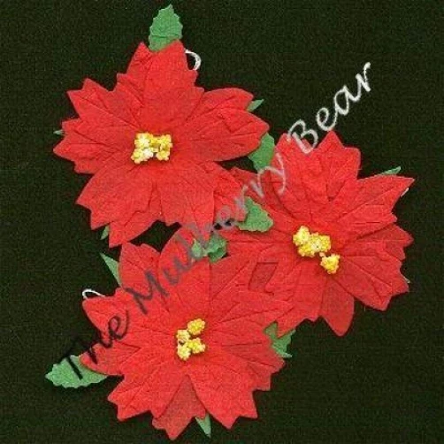 This listing is for 10 large, red mulberry paper Poinsettias. The pollen is three dimensional. These beautiful, winter flowers are approximately 2 1/2" (63 mm) in diameter not including the leaves. There is a short loop on the back for easy attachment to your project. These will be wonderful for embellishing your holiday cards, tags, gift bags, and packages. These are available in a smaller red (Photo 5), white, yellow and variety pack(Photo 6). See my store, Mulberry Bear 2. Powered by eBay Turbo Lister The free listing tool. List your items fast and easy and manage your active items.