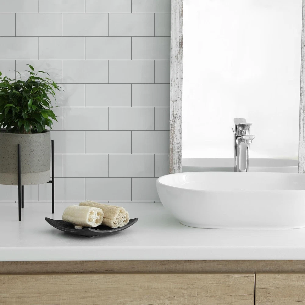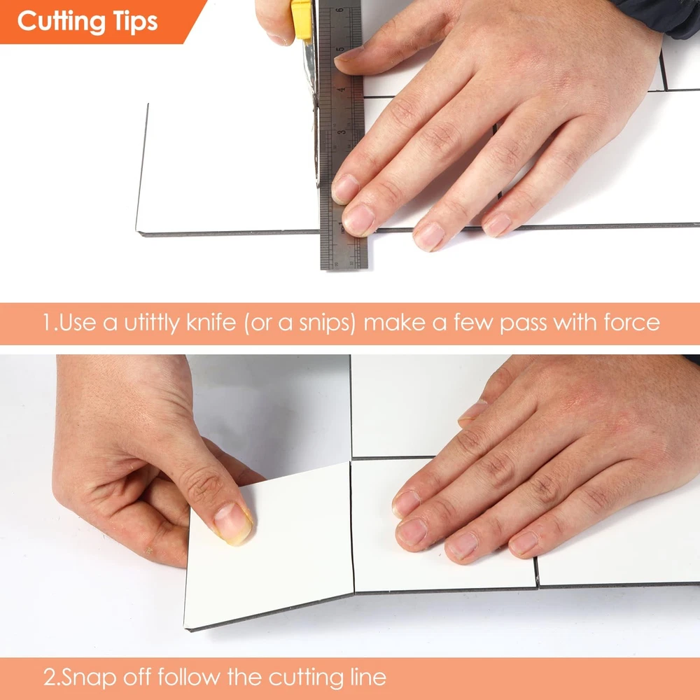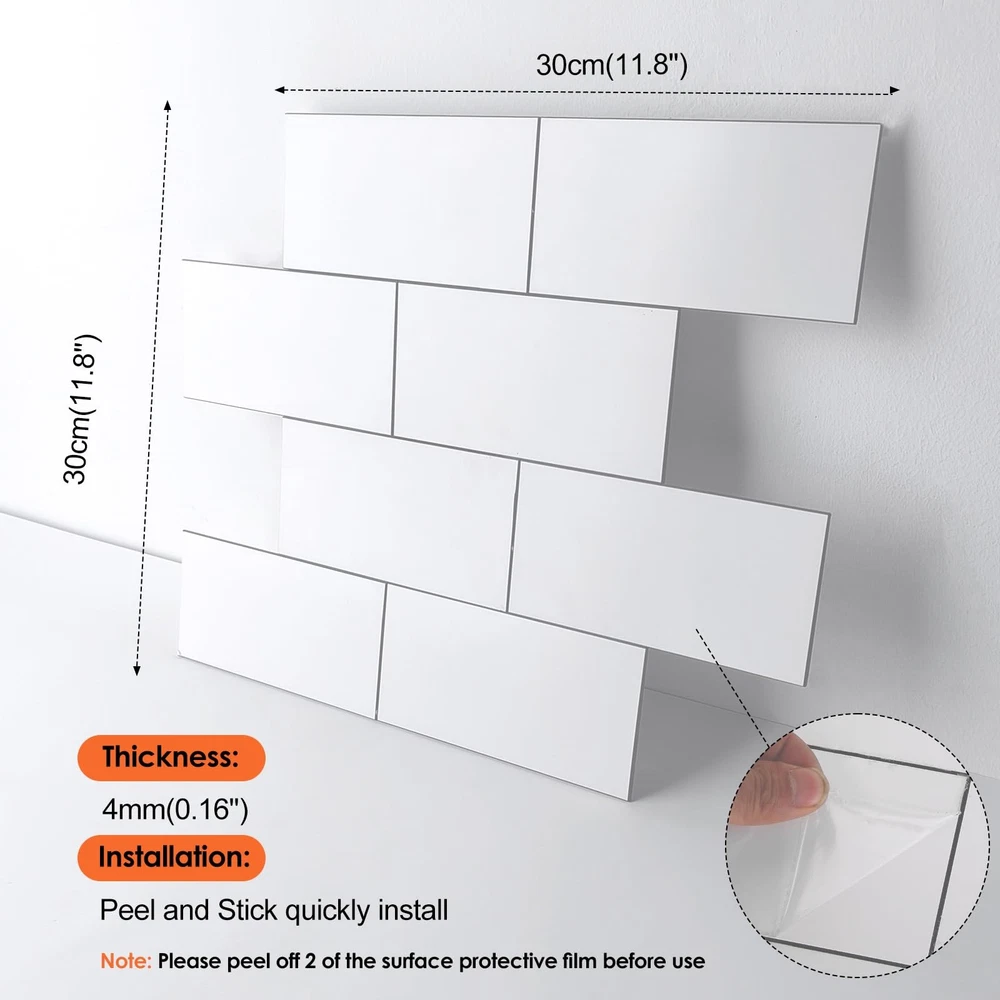 Used widely in house decoration This stainless steel backsplash is used widely for house decoration(kitchen backsplash,bathroom,wall,house decor even for bill board) Just "Peel and Stick" You shall peel off the backing stickers then stick it on the clean and smooth surface without any techical tools cutting the tiles.So you can save your time and money on labor. If there is a need to cut to fit in, use utility knife, just following the seam between the individual pieces. But if you need to cut through the pieces, please use the extermely sharp knife or industrial scissors. Grease can be clean up Used for kitchen blacksplash, grease can be clean up.It's light and solid, easy to install and clean off, resists heat and moisture. 10 Sheets in a safe packing There are 10 sheets in a box with foam bag, covering 10 square feet. Warning: The sticker is strong,once you stick it on the wall or any surface,it won't be easy to peel it off. Please keep the wall surface clean and smooth before sticking, moreover, it can not always suit to the wall which is uneven. 【𝗧𝗶𝗺𝗲𝗹𝗲𝘀𝘀 𝗖𝗹𝗮𝘀𝘀𝗶𝗰 𝗗𝗲𝘀𝗶𝗴𝗻】Classic Pure White Subway Tile Design.The peel and stick subway tile with a semi-gloss finish balance a matte finish and a high-gloss look,which is a great way to add a touch of sophistication to any kitchen or decor place, without being too flashy. At the same time, this finishs is more resistant to fingerprints and dirt than gloss finishes. 【𝗣𝗿𝗶𝗺𝗲 𝗣𝗲𝗿𝗳𝗼𝗿𝗺𝗮𝗻𝗰𝗲】Our peel and stick backsplash is made of stone plastic composite material. Thicker and more durable than peel and stick vinyl tiles and wall pannel. Also the backsplash tiles offers perfect performance with waterproof and heat-resistant properties,scratch and dust resistant surfaces, color fadeless, and strong adhesive for long-lasting attachment. 【𝗨𝘀𝗲𝗿-𝗙𝗿𝗶𝗲𝗻𝗱𝗹𝘆 𝗜𝗻𝘀𝘁𝗮𝗹𝗹𝗮𝘁𝗶𝗼𝗻】The backsplash tile Installation is quick, requiring no grouting, no special tools or skills, allowing you to update your space in a fraction of the time compared to conventional tiling methods. 【𝗙𝗹𝗲𝘅𝗶𝗮𝗯𝗹𝗲 𝗛𝗼𝗺𝗲 𝗘𝗻𝗵𝗮𝗻𝗰𝗲𝗺𝗲𝗻𝘁】Perfect for kitchen backsplashes, bathrooms, laundry rooms, RVs, campers, pantries, fireplaces, living room walls, and beyond, self adhensive wall tiles will infuse elegance and style into every nook and cranny of your home. 【𝗦𝗶𝘇𝗲 & 𝗣𝗮𝗰𝗸𝗮𝗴𝗲】Each tile is 12''x12''x0.16'', and each package contains 𝟭𝟬 𝗽𝗶𝗲𝗰𝗲𝘀, with a total area of 𝟵.𝟳 𝘀𝗾𝘂𝗮𝗿𝗲 𝗳𝗲𝗲𝘁. We always recommend taking 5~10% more for installation losses concern.