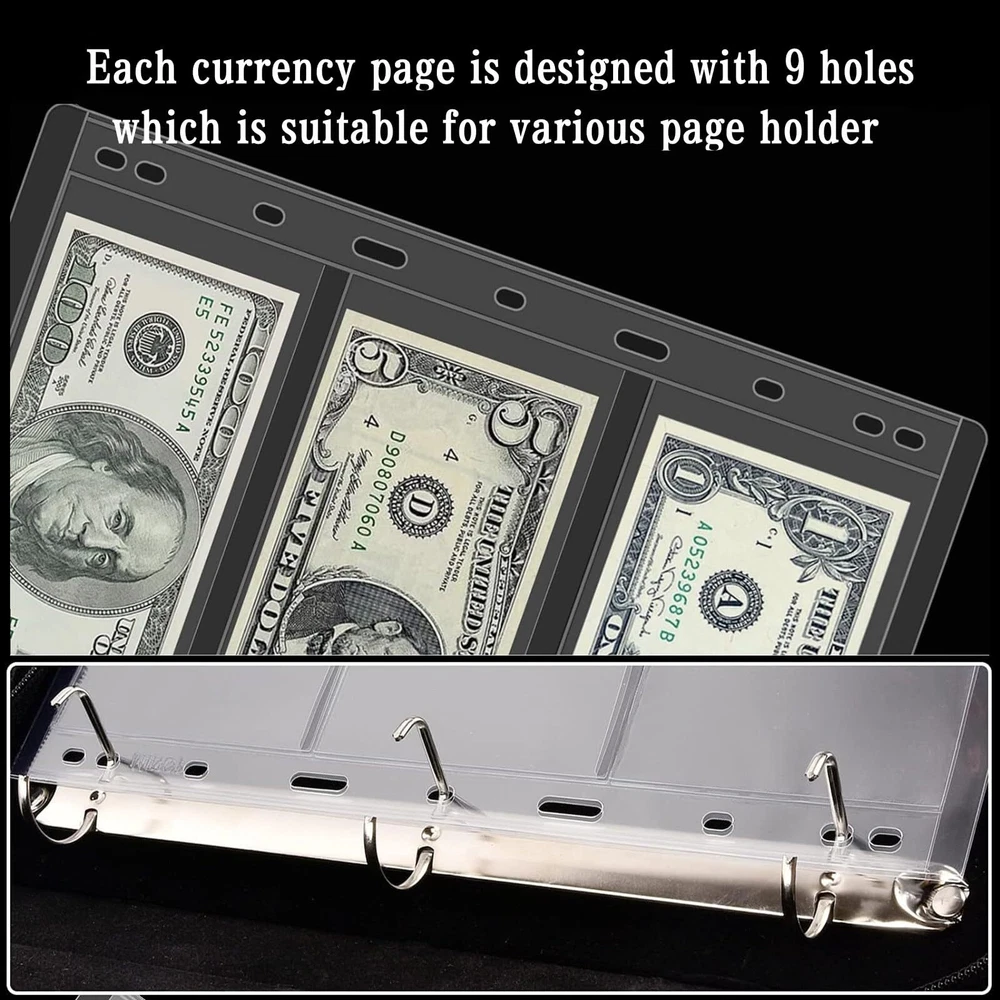 【10 Sheets Currency Collection Page】 -- The package includes 10 sheets paper money collecting pages, 3 Pockets per sheet. Pocket Size: 7.83x3.43 inch. Suitable for storing most sizes of paper money, bill, banknote, stamp, souvenirs etc. 【Professional Design】-- There is a transparent protective film over the page, please remove the protective film before use. 【Thickened Pages with High Transparency on Both Sides】-- ①.28c thick collecting pages, much thicker than most pages on the market. ②.Highly transparent on both sides, can clearly show your paper money both sides, facilitate to view and exchange. A wonderful way to store and display your collection. 【Premium Material】-- Made of acid free PVC without softener, no harm to paper money/currency, dust-proof and non-toxic, perfect for displaying currency and keeping them clean as well. 【9 Holes Design】-- The premium page with 9 holes,suitable for many sizes of binder, especially for US standard 3-ring binder. Page size: 28 x 21cm/11 x 8.3 inch(L*W).