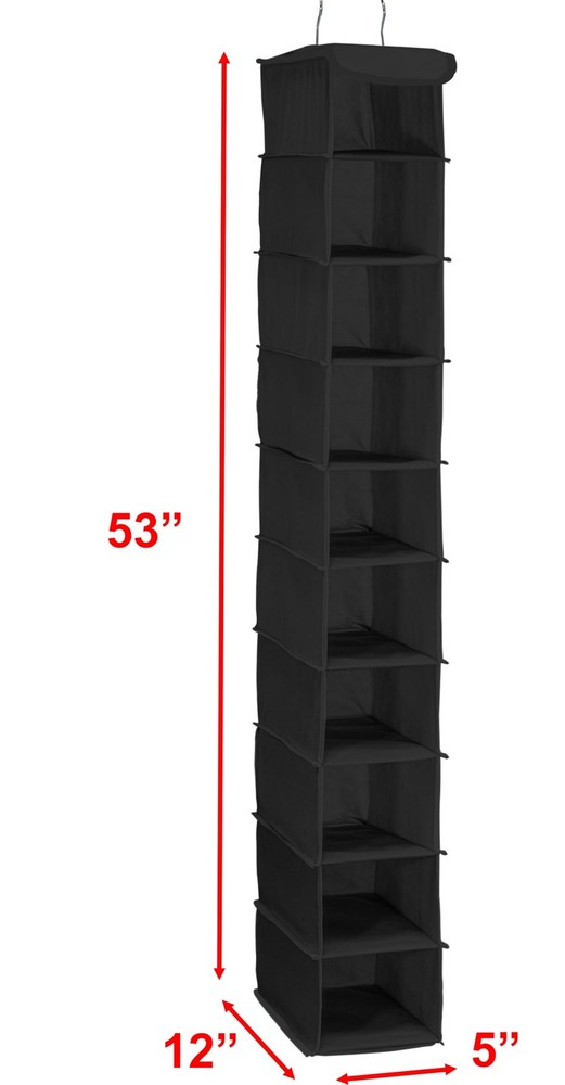 Dimension: 5" W x 12" D x 53"H Hangs on standard closet rod, wired closet rack 10 Fabric Shelves, dimension of each bin is 5'' W x 12''D x 5.25''H 2 Hooks hanging system works in closet rod or wired closet rack