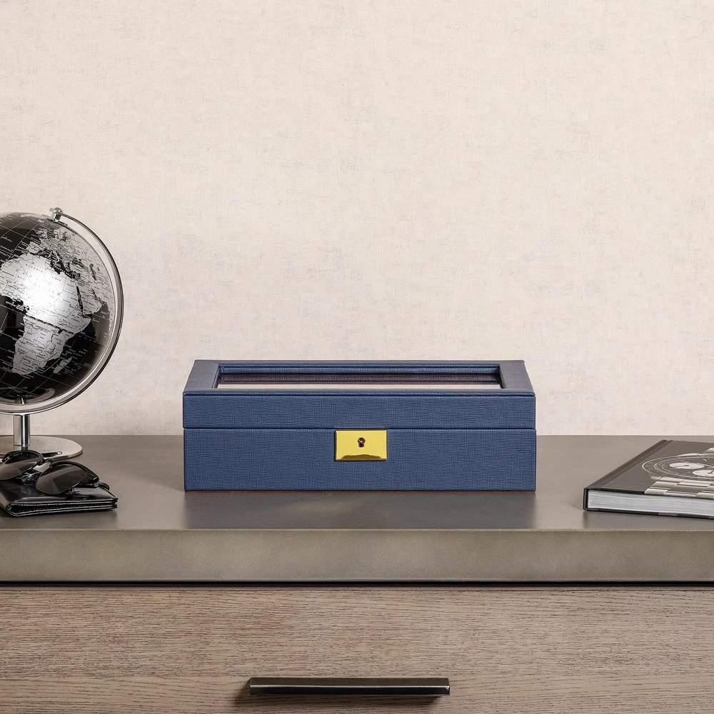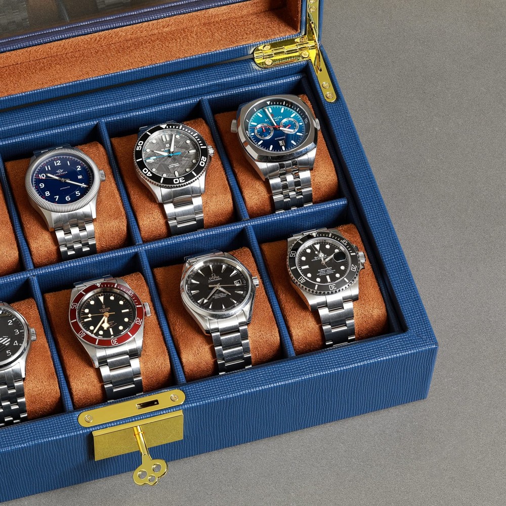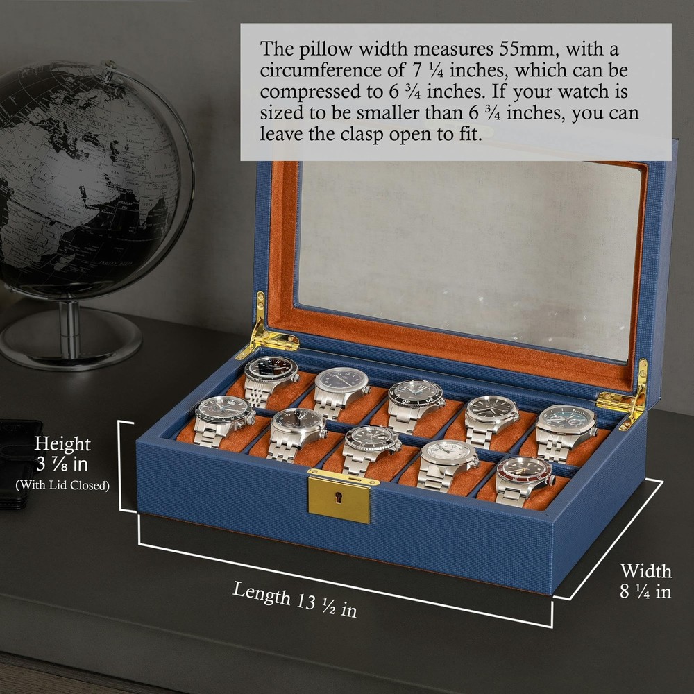 "Our watch organizer is the perfect gift for anyone who loves watches. With ten slots, it can hold all of your timepieces neatly in place next to each other. Our watch storage case boasts a unique, modern design that is the perfect combination of class and functionality. Each watch box uses a wooden frame wrapped in premium quality PU leather. The inside of each watch storage box is covered in elegant black micro suede fabric. Each cushion in our watch organizer holds a small or large watch (up to 60mm) neatly in place next to each other. Plus, there is plenty of space between the lid and cushions of our watch holder to accommodate watches of all sizes. Whether it's Christmas, a birthday, an anniversary, or just because, you're sure to delight even the hardest to please recipient with our watches box. The unisex design of our jewelry boxes is perfect for any of the watch collectors in your life or even yourself. Your watches deserve it! Our watch storage case boasts a unique, modern design that is the perfect combination of class and functionality. Each watch boxes use a wooden frame wrapped in premium quality PU leather. " WATCH DISPLAY CASE FOR MEN AND WOMEN: Each cushion in our watch organizer holds a small or large watch (up to 60mm) neatly in place next to each other. Plus, there is plenty of space between the lid and cushions of our watch holder to accommodate watches of all sizes. watch boxes are perfect gifts for Father’s Day, Mother's Day, birthdays, anniversaries, Valentine's day, graduations, holidays, retirement, and corporate events. DIMENSIONS: The exterior of our glass display box with lock measures 13 1/2 inches long, 8 1/4 inches wide, and 3 7/8 inches high with a weight of 4.5 pounds. The pillow circumference is 7 1/4 inches and compressible to 6 3/4 inches. If your watch is sized to be smaller than 6 3/4 inches you can leave the clasp open to fit. TEN SLOTS: With ten (10) slots, our glass box offers you plenty of room to store your entire collection of watches. Our watches holder organizer looks simply terrific while acting as a gorgeous and stunning storage case. UNMATCHED QUALITY AND SOPHISTICATED DESIGN: Our watch storage case boasts a unique, modern design that is the perfect combination of class and functionality. Each watch boxes use a wooden frame wrapped in premium quality PU leather. The inside of each watch storage box is covered in elegant black micro suede fabric. THE PINNACLE OF WATCH STORAGE: Our mens watch box looks stylish, elegant, and holds your watches securely, sturdily, and safely. Display your collection of expensive watches with total and complete confidence - Our glass display case is the perfect storage and display option for any watch collector!