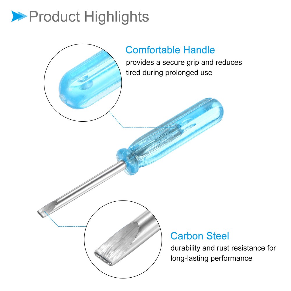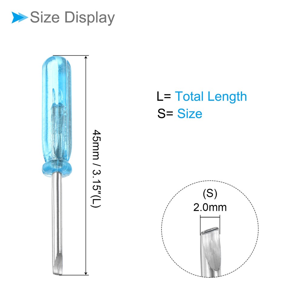 Document Attributes:* Size: 2.0mm* Total Length: 45mm / 3.15-inch* Shaft Material: Carbon SteelWhat Is Included:* 10 Pieces x Micro ScrewdriversApplications & Features:--- This screwdriver is a multifunctional tool suitable for a variety of electronic devices and appliances and can be used on laptops, computers, game consoles, pocket knives, doorbells, dishwashers, routers, and more.--- The screwdriver features a comfortable handle that provides a secure grip and reduces tired during prolonged use--- The screwdriver is made from carbon steel material ensuring strength, durability and rust resistance for long-lasting performance.Useful Tips:--- Please confirm the screwdriver size before buying. 10 x Small Slotted Screwdriver 2.0mm 45mm Flat Screwdriver W Anti-slip Handle Attributes: * Size: 2.0mm * Total Length: 45mm / 3.15-inch * Shaft Material: Carbon Steel What Is Included: * 10 Pieces x Micro Screwdrivers Applications & Features: --- This screwdriver is a multifunctional tool suitable for a variety of electronic devices and appliances and can be used on laptops, computers, game consoles, pocket knives, doorbells, dishwashers, routers, and more. --- The screwdriver features a comfortable handle that provides a secure grip and reduces tired during prolonged use --- The screwdriver is made from carbon steel material ensuring strength, durability and rust resistance for long-lasting performance. Useful Tips: --- Please confirm the screwdriver size before buying. Hot Item Payment 1.We accept eBay payment . 2.Payment must be received within 7 business days of auction closing. Shipping 1.We ship to your eBay or Paypal address. Please make sure your eBay and Paypal address is correct before you pay. 2.Items will be shipped within 1-3 business day when we received payment. 3.Delivery time depends on destination and other factors. Description Policy 10 x Small Slotted Screwdriver 2.0mm 45mm Flat Screwdriver W Anti-slip Handle Attributes: * Size: 2.0mm * Total Length: 45mm / 3.15-inch * Shaft Material: Carbon Steel What Is Included: * 10 Pieces x Micro Screwdrivers Applications & Features: --- This screwdriver is a multifunctional tool suitable for a variety of electronic devices and appliances and can be used on laptops, computers, game consoles, pocket knives, doorbells, dishwashers, routers, and more. --- The screwdriver features a comfortable handle that provides a secure grip and reduces tired during prolonged use --- The screwdriver is made from carbon steel material ensuring strength, durability and rust resistance for long-lasting performance. Useful Tips: --- Please confirm the screwdriver size before buying. Hot Item Payment 1.We accept eBay payment . 2.Payment must be received within 7 business days of auction closing. Shipping 1.We ship to your eBay or Paypal address. Please make sure your eBay and Paypal address is correct before you pay. 2.Items will be shipped within 1-3 business day when we received payment. 3.Delivery time depends on destination and other factors.