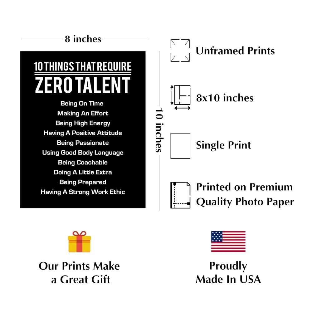 Store New Arrivals Add to Favorite View Feedback Contact 10 Things That Require Zero Talent - Motivational Wall Art Print | Inspirational Quote Decor for Home, Office, Classroom, or Gym | Leadership and Encouragement Gift | 8X10 Inches, Made in USA. UNFRAMED Description Color Black, White Material Paper Country of Origin USA Package Dimensions 11.38 x 8.86 x 0.16 inches; 2.65 ounces Size 8 x 10 Inch 1. Motivational Design That Inspires Transform your space with the "10 Things That Require Zero Talent" motivational wall art print, a powerful reminder to stay positive and hardworking. Perfect for homes, offices, classrooms, and gyms. 2. Versatile Decor for Any Space Enhance your environment with inspirational wall art that fits seamlessly into modern, rustic, or traditional decor styles. A thoughtful choice for teachers, students, coworkers, and fitness enthusiasts. 3. Ideal Gift of Encouragement Give the gift of motivation with this unframed 8x10-inch art print, perfect for birthdays, graduations, or professional milestones. An excellent choice for leaders, mentors, and friends who inspire greatness. 4. High-Quality Print, Ready to Frame Printed on premium-quality, archival paper with vivid colors and crisp details. The UNFRAMED design gives you the flexibility to choose a frame that matches your style. 5. Made in the USA – Quality You Can Trust Proudly designed and printed in the USA, ensuring exceptional quality. Support small businesses with this high-quality, handcrafted product. Product Description ABOUT US We offer the best prices around on high quality products. Our E-store includes media such as books, movies, music and games while offering electronics, toys, sporting apparel, clothing, tools, general home, garden items and more. SHIPPING We are always working hard to ensure your package arrives as soon as possible. Please understand that some factors like weather, high postal traffic, and the performance of shipping companies are outside of our control. We offer free shipping to the lower 48 states and ship within 2 business days of payment, usually sooner. We do not accept P.O. Boxes. Please provide a physical address. For shipping outside of the continental USA, we only use eBay's Global Shipping Program.The item is shipped to KY and then sent to the rest of the world. International customers are responsible for all duties and taxes. Continue to check out in order to calculate costs for shipping the item to your country. Messages regarding eBay's Global Shipping Program MUST be directed at eBay EXCLUSIVELY. RETURNS We offer a 30-Day Return Policy on items which you are not completely satisfied with. You have the option for a full-refund or an exchange of the item. No returns are available on items shipped outside of the USA. PAYMENT We accept PayPal. CONTACT US This page content is yet to come Please ad us to your favorite seller and visit again later Thank You CUSTOMER SATISFACTION We try our very best to make sure every customer is completely satisfied. If there's a problem, message us! We're happy to help. WE ACCEPT Copyright © 2021 AutoDS. | All Rights Reserved