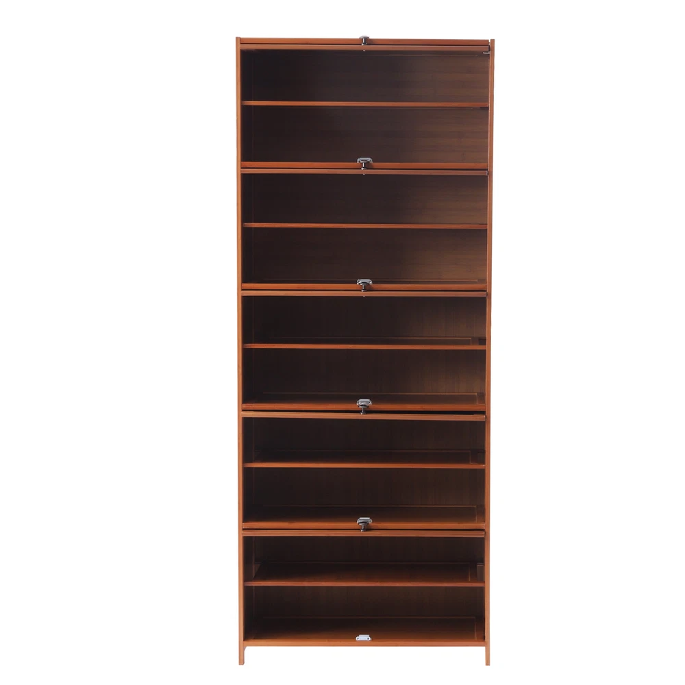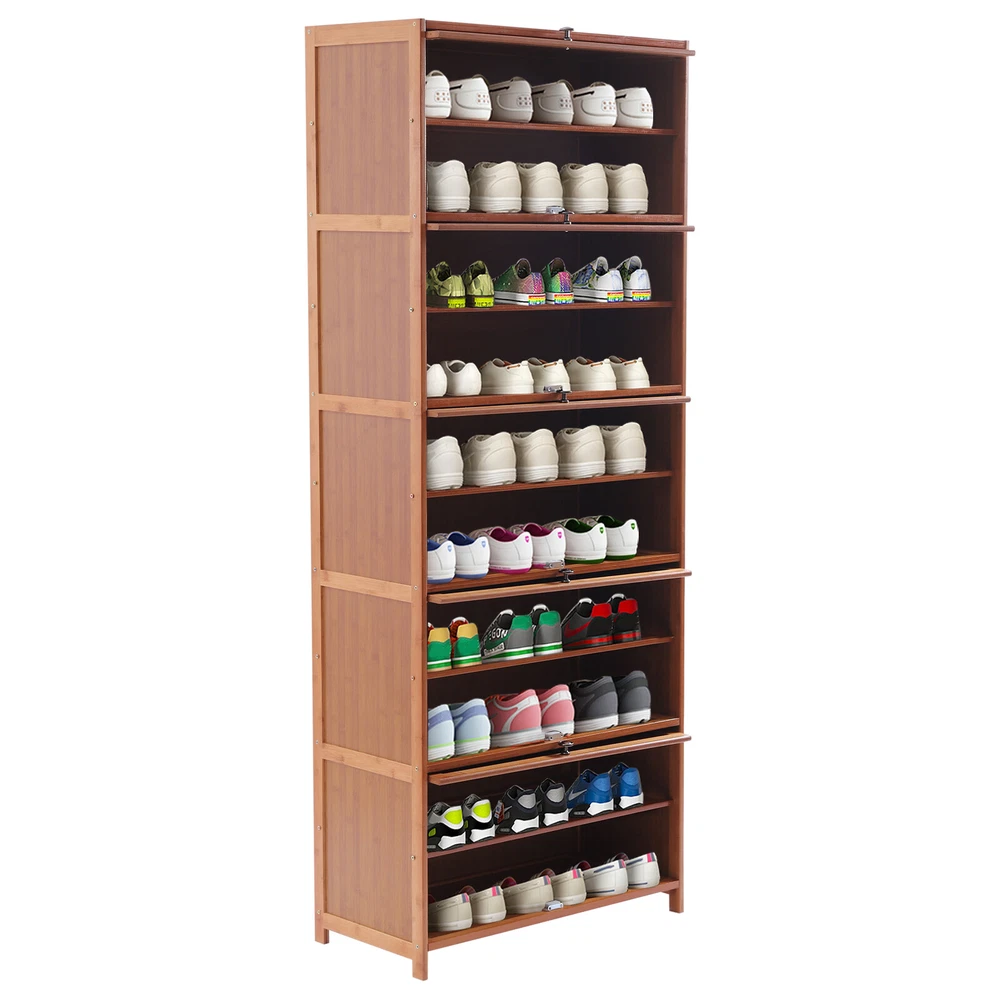 Specification Material: Nan Bamboo and Laminate Finish: Varnished Color: Brown Doors Included: Yes Shoes Capacity: 30 Pairs Assembly Required: Yes Mount Type: Floor Mount Shape: Rectanglar Packing Size: 181*36.2*16.5cm/71.25*14.25*6.49in Each Tier Height: 15cm/5.91in Product Size: 70*32*172cm/27.58*12.60*67.72in Gross Weight: 18kg/39.68lbs Net Weight: 17kg/37.47lbs Bearing Weight of Each Tier: 20kg/22lbs Package Included 1 x Shoe Cabinet 1 x Chinese User Manual All Accessories for Installation WELCOME 10-Tier Bamboo Shoe Rack Cabinet Wooden Shelf Stand Storage Book Shelf Organizer How to assmeble? Remember to override the side of the door suction with the iron plate 1. Remove the door suction laminate and the small screws for the door suction 2. Fix the door suction laminate to the side brackets with the large screws 3. Take out the back plate and insert it along the groove of the bracket. Remember to insert the metal strip into the hole, not into the groove Do not screw the front screws yet 4. Remove the door suction laminate and the back panel in turn 5. Take out the top laminate and the inner door laminate and install them with large screws 6. Remove the metal strip and insert it into the side brackets in turn. Door puller, door spacer with medium screws The metal strips are inserted into the recesses of the brackets As the screws are not screwed in step 5, the side brackets can be gently broken open Insert the metal strips into both ends of the door 7. Remove the door panel, door gasket, door pull ring and metal tabs and install them as shown in the picture 8. Break off the side brackets to the right, then snap the door panel into the brackets 9. Install the remaining door panels in sequence and tighten the screws. 1.Description Are you still troubled by the messy entryway? Are you still looking for a suitable entryway shoe rack? This shoe cabinet can not only give you a neat door but also meet your shoes storage needs. Its fully enclosed design protects against dust and moisture, while you can open the door to ventilate and disperse the smell, giving your shoes a dry, clean storage environment. It will be the ideal choice for you! Specification Material: Nan Bamboo and Laminate Finish: Varnished Color: Brown Doors Included: Yes Shoes Capacity: 30 Pairs Assembly Required: Yes Mount Type: Floor Mount Shape: Rectanglar Packing Size: 181*36.2*16.5cm/71.25*14.25*6.49in Each Tier Height: 15cm/5.91in Product Size: 70*32*172cm/27.58*12.60*67.72in Gross Weight: 18kg/39.68lbs Net Weight: 17kg/37.47lbs Bearing Weight of Each Tier: 20kg/22lbs 2.Package Included 1 x Shoe Cabinet 1 x Chinese User Manual All Accessories for Installation 3.Key Features High Good Material made of high-quality Natural Nan bamboo and laminate with a varnished surface, which is sturdy and waterproof to ensure a long service life Top Surface Platform can be used to place bags, keys, umbrellas, and other personal items , and you can also place some ornaments to decorate this shoe rack, which is pleasing to the eye Water-Resistant The smooth, waterproof surface makes it easy to clean. You can easily wipe off dust and stains with a damp rag. Durable Handle with a sophisticated rounded handle that fits comfortably in your hand and allows you to open and close the door with ease. Push-in Invisible has a concealed sliding design that slides up and pushes into the top for storage, so it won't take up external space. In addition, the magnetic iron tabs attach the doors more securely High Load-bearing Capacity The solid construction and thicker laminate ensure a strong load capacity of up to 20kg/44lbs per tier to meet your daily needs. Large Capacity: This 10-tier shoe cabinet can hold up to 3 pairs of adult shoes per tier, providing enough storage space to keep family members' shoes organized, and free from cluttering up the entryway for a cleaner and tidier room. All-around Protection: The back-sealed composite baffle will provide all-around protection for your shoes to avoid dust or being moistured. High-quality Material: It is made of high-quality Nan bamboo and laminate with a varnished surface, which is sturdy and waterproof to ensure a long service life. The natural bamboo is very healthy and environmentally friendly, which will not emit harmful gases or substances and makes it more secure for your family to use. Tiered Storage: Its multi-tiered design makes it easy to sort and store your shoes, either by type or by the owner, for easy selection and access. The intermediate laminates are also freely removable according to your needs, enabling the storage of tall boots or high heels. Versatile Decoration: The overall design of this shoe cabinet is simple and the color is vintage brown. Whether it is placed at the door or in the living room, it is very harmonious and brings a warm atmosphere to your space. Extra Storage Platform: The top platform can be used to place bags, keys, umbrellas, and other personal items, and you can also place some ornaments to decorate this shoe rack, which is pleasing to the eye. Easy to Assemble: The package includes installation instructions and the required accessories for your convenience. You can enjoy the pleasure of assembling it. Stable Placement: The wider tier plate provides better accommodation for larger sizes of shoes. At the same time, the raised strips on the front edge of the tier help to keep shoes securely in place and prevent them from falling out. High Load-bearing Capacity: The solid construction and thicker laminate ensure a strong load capacity of up to 20kg/44lbs per tier to meet your daily needs. Space Saving : This shoe cabinet makes full use of the vertical space and occupies a small area(27.58*12.60in), so it can be placed in every corner of the home without taking up too much space. Easy to Clean: The smooth, waterproof surface makes it easy to clean. You can easily wipe off dust and stains with a damp rag. 4.Details Raised Legs: The raised leg avoids direct contac