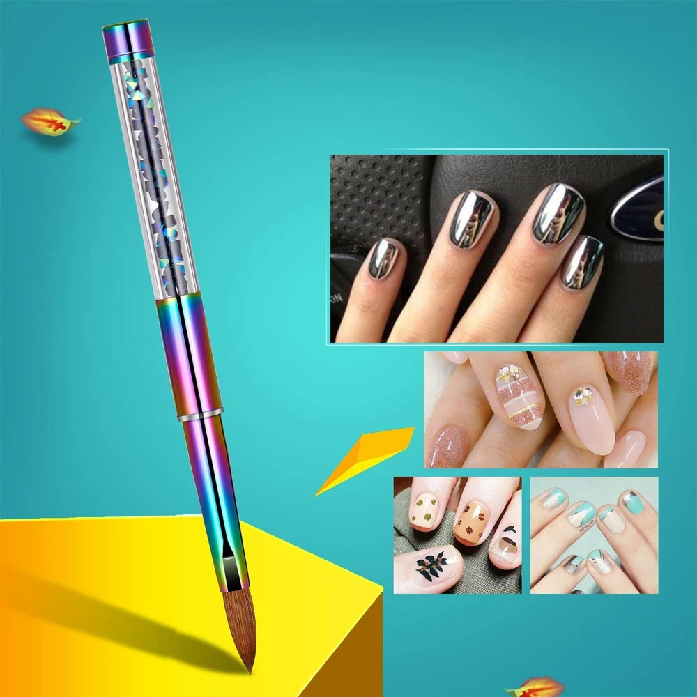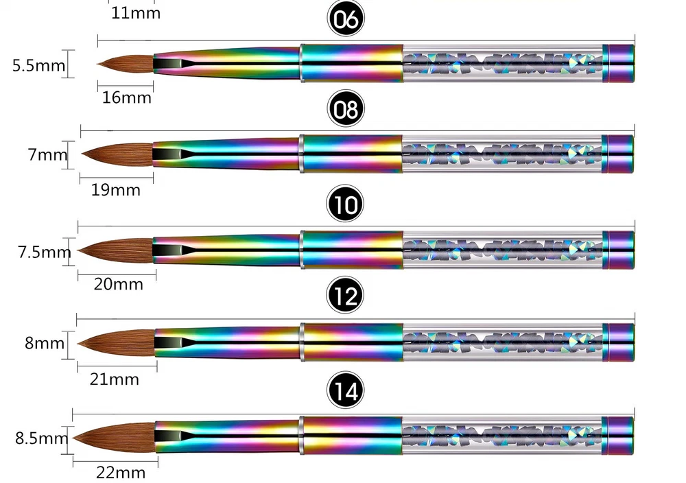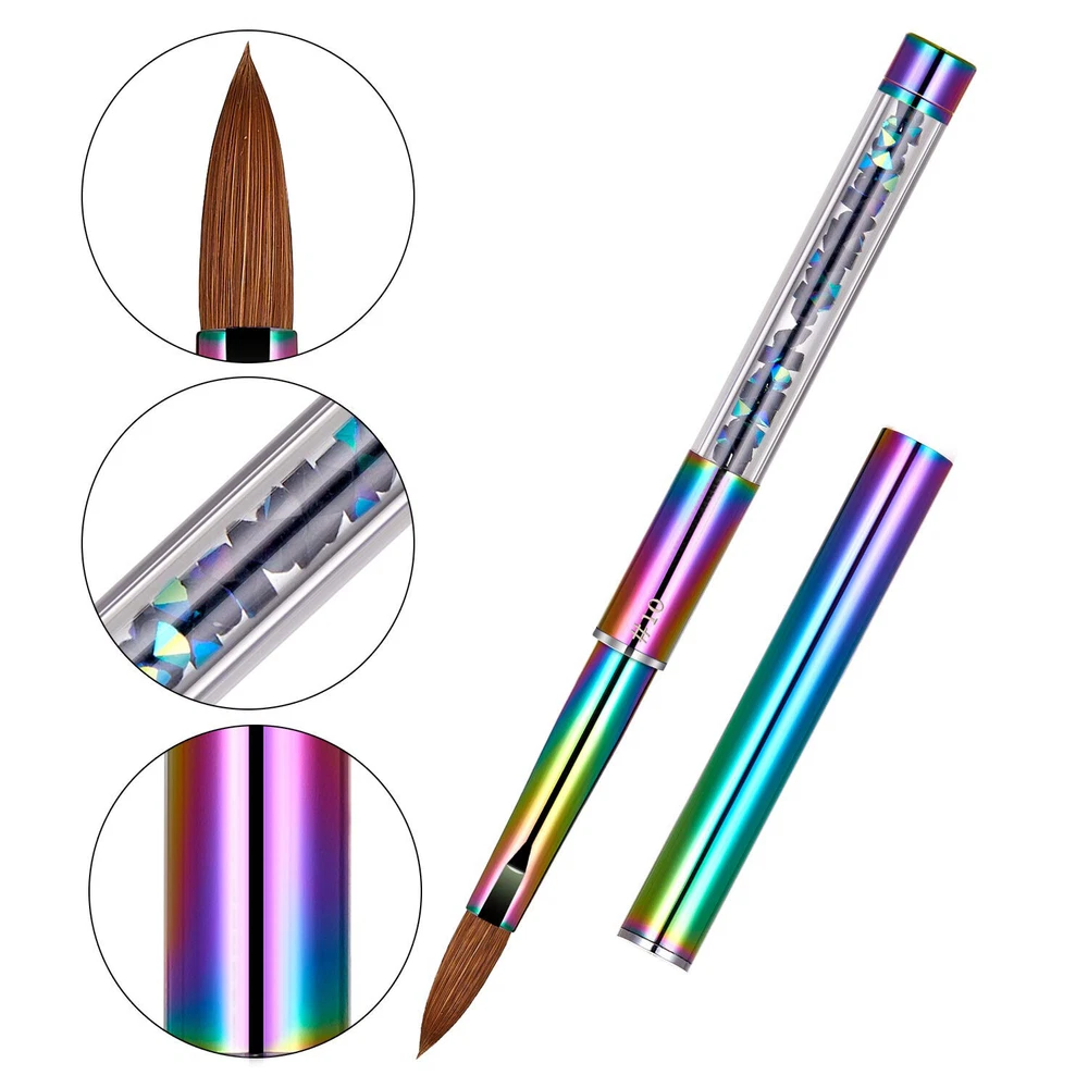 100% Kolinsky Acrylic Nail Brush Crimped High Quality Rainbow Metal Handle With Cap Sizes Available: Size 6 Size 8 Size 10 Size 12 Size 14 ❀ Always clean a good quality brush thoroughly after each processing session with brush cleaner or liquid monomer DO NOT USE ACETONE because Acetone will remove the shine from bristle make acrylic tacky and buildup residue. Remove as much moisture as possible with paper towel and reshape before storing. ❀.THE MOST STANDARD WAY TO USE A ACRYLIC BRUSH (must): AFTER EVERY APPLICATION ON EVERY SINGLE NAILS, make sure to clean the brush with brush cleaner/liquid monomer for preventing the acrylic powder on the brush from clumping .Or it will be hard to clean because acrylic powder quickly clumps in a short time. ❀【SHAPE】-Remove as much moisture as possible with paper towel ,reshape and whenever possible, in the upright position. 【AIR & SUNLIGHT】-Always Keep brushes out of direct sunlight & aired . Natural hair needs to breathe in order to prevent mould growth. ❀ Kolinksy hair part for perfect acrylic nail work New color design, rainbow color handle with Gradient crystal inside decoration, fashion and popular. ❀ 100% Brand new and high quality Non-deformation and non-corroding, durable for longer use Comfortable and easy to handle Perfect for home use and nail salon Package includes: 1pc 100% Kolinsky Brush With Cap