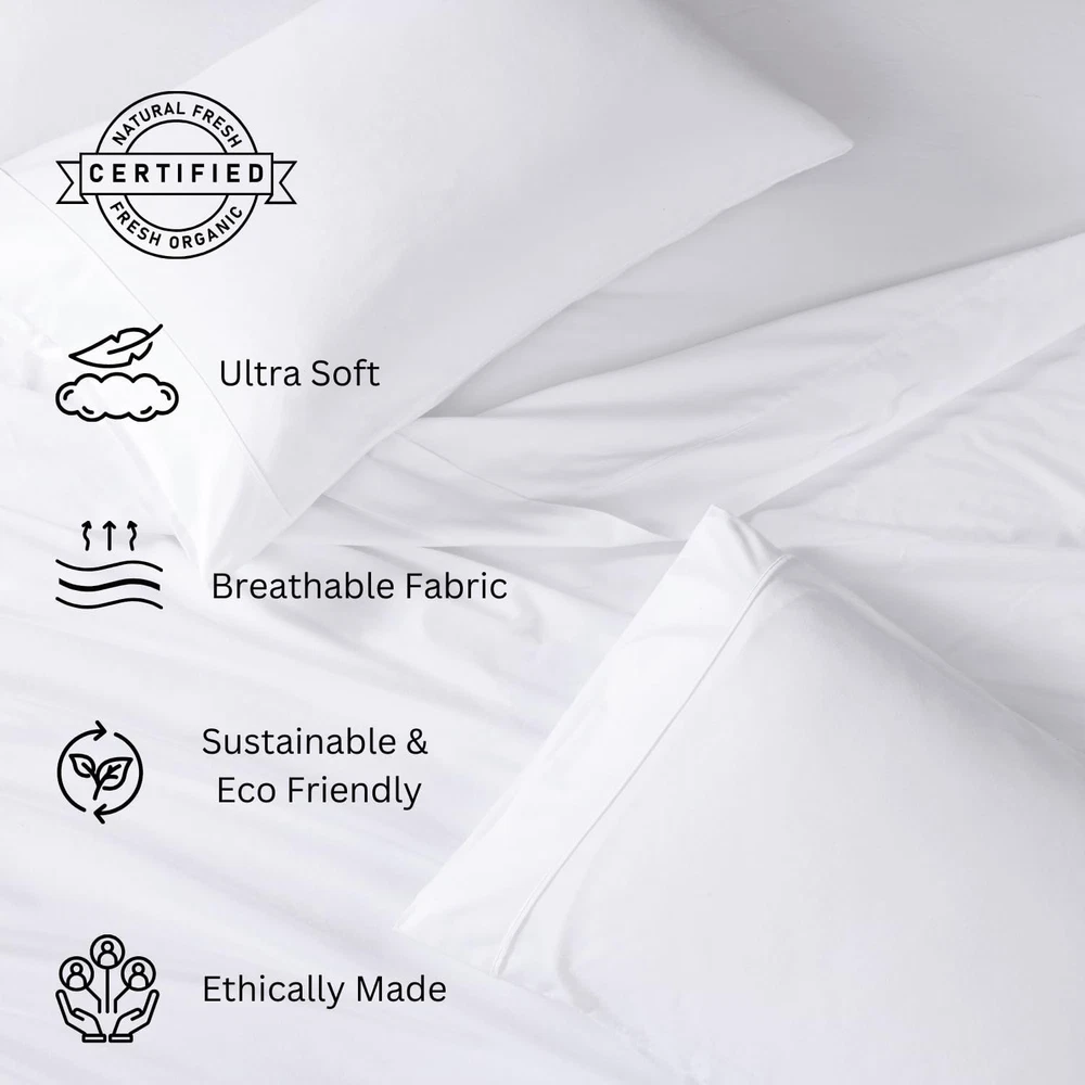 Store New Arrivals Add to Favorite View Feedback Contact Fast deliveries to the customer's home Quality customer service John Make the customers happy! 100% Organic Cotton Queen Sheet Set, 4Pc Cotton Sheets Queen Size Bed Set, Soft & Breathable Percale Weave, Deep Pocket Queen Sheets, Hotel-Quality Bed Sheets Queen Size - White Bed Sheets Description Pure Organic Comfort: Experience the luxurious comfort of our Lane Linen cotton sheets queen size set, meticulously crafted from OEKO-TEX certified 100% Organic Cotton. The crisp percale weave provides a hotel-quality feel—soft, yet durable—offering breathability and supreme comfort. Luxurious 4-piece bedding : Embrace luxury with our meticulously crafted 4-piece white queen sheets set. Our white sheets queen set includes 1 Flat sheet (90" W x 104" L)that offers ample coverage, 1 snug bottom Fitted sheet (60" W x 80" L) designed specifically for a queen mattress having 8"- 15" deep pocket with all-around elastic and 2 Standard Queen Size Pillowcases (20" W x 30" L). Eco-Conscious Packaging: At Lane Linen, we are committed to sustainability. Our queen bed sheets cotton come packaged in a reusable fabric bag, reducing unnecessary waste and promoting eco-friendly practices. Pure Quality Over Health Benefits: Organic cotton sheets stand superior to synthetic microfiber sheets queen size. While microfiber can disturb sleep and potentially lead to health concerns, cotton's natural breathability ensures optimal temperature control, promoting improved daytime performance Risk-Free Guarantee: We stand behind the quality of our Lane Linen sheets. To offer you peace of mind, we provide a 30-day return window and a satisfaction guarantee. If for any reason you're not completely satisfied with your purchase, simply reach out to us within 30 days for a hassle-free return, ensuring your satisfaction is our priority. Product Description 100% Organic Cotton Sleep soundly on ethically sourced, cotton that’s as soft on you as it is on the planet. Eco-Conscious Packaging Thoughtfully packed in a reusable fabric bag, minimizing waste for a greener future. Breathable Percale Weave Crisp, cool, and breathable—perfect for staying comfortable all night long. Long-Lasting Quality Softens with every wash, maintaining its strength and quality for years to come. 1 What's Included? 2 Naturally Airy 3 Deep Pockets 4 Envelope Pillowcases 1 Colors & Prints 2 Size Guide 3 Safety Certification 4 Care Instructions How do I care for these organic cotton sheets? Our sheets are easy to care for! Simply machine wash in cold water with like colors and tumble dry on low heat. They soften with every wash, ensuring long-lasting comfort without the need for special care. Will these sheets fit my mattress? Yes! Our fitted sheets feature deep pockets that accommodate mattresses up to 15 inches, ensuring a snug and secure fit. No more slipping corners or ill-fitting sheets. What makes these sheets better than synthetic options? Unlike synthetic fabrics, our organic cotton sheets are naturally breathable and free from harmful substances. This helps regulate your body temperature for a more restful sleep and ensures a healthier, toxin-free environment in your home. Do these sheets wrinkle easily? As with most natural fibers, some wrinkling can occur, but that’s a sign of the purity of the organic cotton. You can reduce wrinkles by promptly removing the sheets from the dryer or giving them a light iron if desired. Are these sheets made from 100% organic cotton? Absolutely! Our sheets are crafted from 100% organic cotton, certified by OEKO-TEX to meet high quality and safety standards, providing you with a pure and comfortable sleep experience. Item model number OGN160SS-QN-WHT Style Contemporary Weave Type Percale Pattern Solid Country of Origin India Theme summer Number of Pieces 4 Unit Count 1 Count Pillowcase Quantity 2 Material Cotton Seasons Summer Is Discontinued By Manufacturer No Closure Type Envelope Item dimensions L x W x H 13 x 5 x 5 inches Item Weight 3.69 pounds Pillowcase Length 3E+1 Inches Sham Quantity 2 Special Feature Eco-Conscious Packaging, Effortless Maintenance, Washer Friendly, Super Soft Percale Weave, 100% Organic Cotton Color 01: Pure White Included Components 1 Fitted Sheet, 2 Pillowcases, 1 Flat Sheet Product Dimensions 13 x 5 x 5 inches Size Queen ABOUT US We offer the best prices around on high quality products. Our E-store includes media such as books, movies, music and games while offering electronics, toys, sporting apparel, clothing, tools, general home, garden items and more. SHIPPING We are always working hard to ensure your package arrives as soon as possible. Please understand that some factors like weather, high postal traffic, and the performance of shipping companies are outside of our control. We offer free shipping to the lower 48 states and ship within 2 business days of payment, usually sooner. We do not accept P.O. Boxes. Please provide a physical address. For shipping outside of the continental USA, we only use eBay's Global Shipping Program. The item is shipped to KY and then sent to the rest of the world. International customers are responsible for all duties and taxes. Continue to 'check out' to calculate costs for shipping the item to your country. Messages regarding eBay's Global Shipping Program MUST be directed at eBay EXCLUSIVELY. RETURNS We offer a 30-Day Return Policy on items in which you are not completely satisfied with. You have the option of a full-refund or an exchange of the item. No returns are available on items shipped outside of the USA PAYMENT We accept PayPal. CONTACT US This page content is yet to come Please ad us to your favorite seller and visit again later Thank You CUSTOMER SATISFACTION We try our very best to make sure every customer is completely satisfied. If there's a problem, message us! We're happy to help. WE ACCEPT