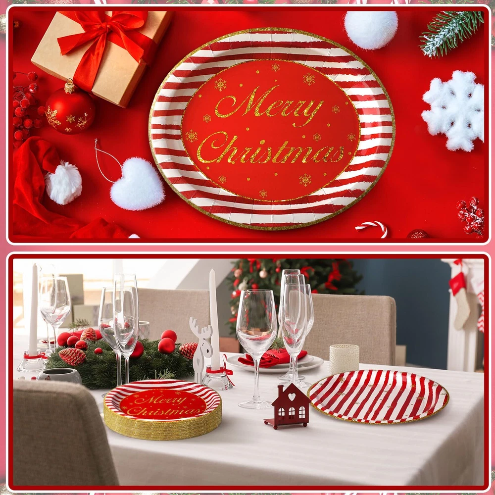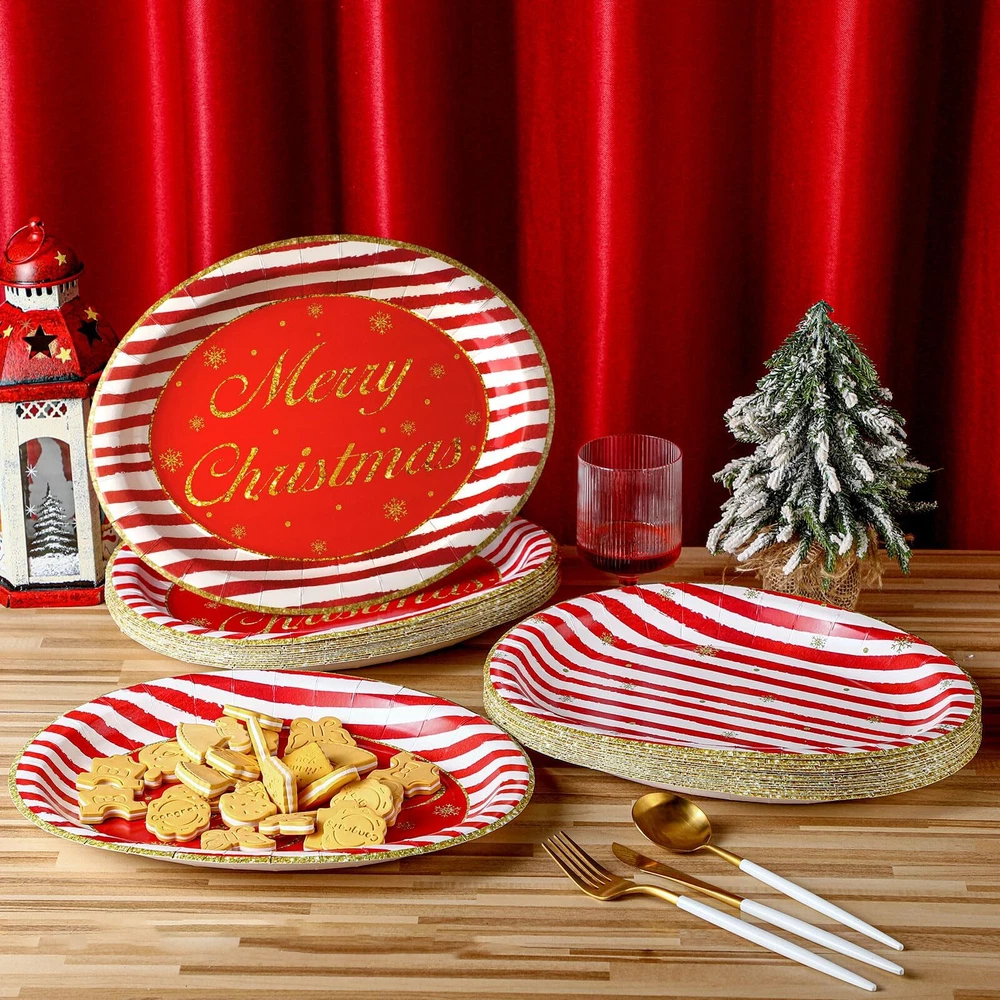 Beautifully Designed Christmas Patterns: the red and gold oval paper plates feature classic Christmas designs such as candy cane and striped patterns, these eye catching patterns instantly create a festive and inviting atmosphere for your Christmas celebration and add a touch of elegance to your table setting Abundant Quantity for Convenience: you will receive 100 paper plates, giving you plenty of plates to cater to your gathering, the large quantities ensure that all your guests can enjoy their meals without interruptions or clean up hassles Wide Range of Applications: the Christmas paper plates are suitable for various occasions, such as Christmas parties, picnics, birthdays, weddings, and more; The versatile designs and practicality of these plates allow you to indulge in their charm all year round, making every event special and memorable Reliable and Serviceable: crafted from 350g white cardboard, the plates are sturdy and reliable, and they are designed to withstand the weight of your favorite dishes without bending or breaking, ensuring a hassle free dining experience for you and your guests Proper Size: with a size of about 10 x 12 inches, the paper plates provide ample space for serving your delicious meals, you no longer have to worry about overcrowding your plates or spilling food over the edges; Serve your culinary creations with confidence and style