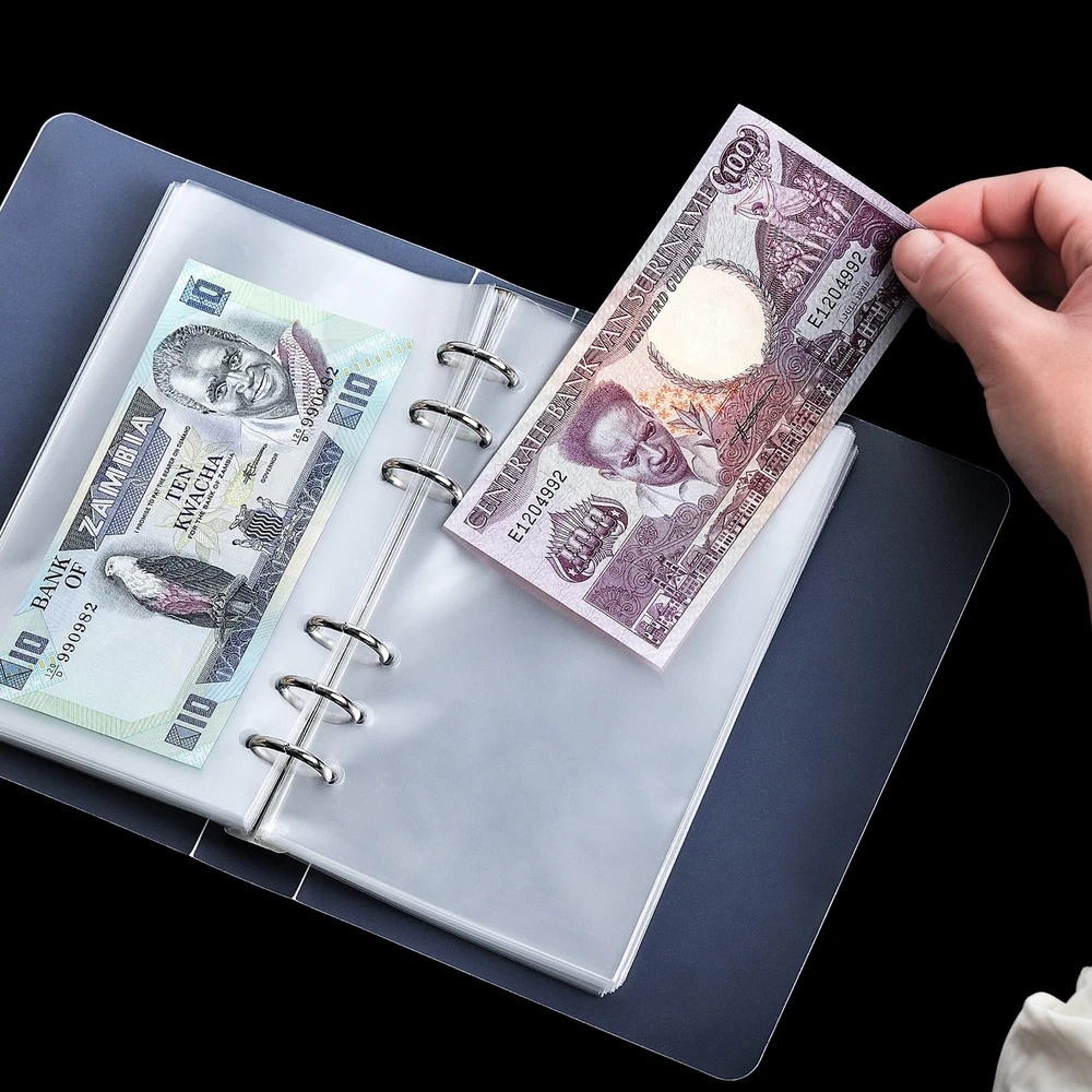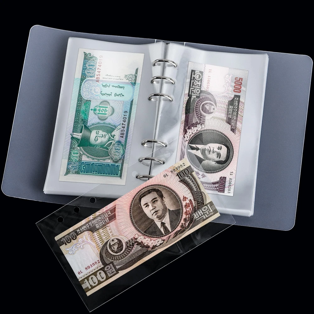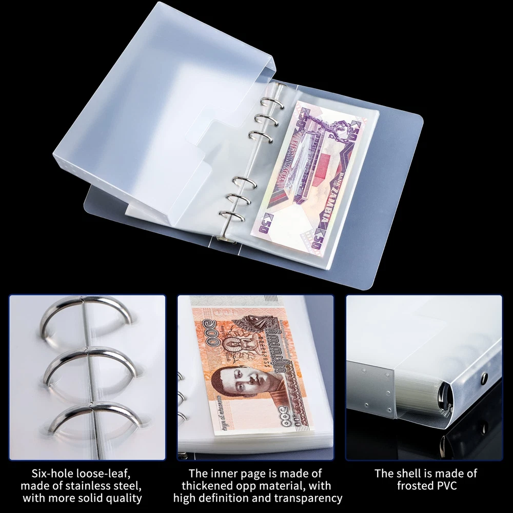 Each collecting process is a romantic journey. Paper currency album can help you protect your precious collection. Moisture-proof, water-proof, stain-proof and corrosion-proof to provide your treasures a safe harbor. It is easy to use and clean, and only needs to be wiped with a wet rag. If you have any questions after receiving the product, please contact us in time. We will serve you wholeheartedly. Features Material: acid-free PVC, OPP Color: transparent Capacity: 100 sheets Dimensions: 17.3 x 10.4 cm /6.8 x 4.1 inches (inner page) 19.2 x 13.0 cm /7.5 x 5.1 inches (cover) 19.8 x 13.8 cm /7.8 x 5.4 inches (protective case) Applicability: Accommodate paper collectibles smaller than 17.0 x 9.4 cm /6.7 x 3.7 inches. Generally applicable to all US dollars, euros, Canadian dollars and A, B, C, D, E, F, G series pounds sterling. Packing: 1 x Currency Album (100 pages, protective case, elastic strap included) 【PRODUCT SIZE】- 17.3 x 10.4 cm /6.8 x 4.1 inch loose-leaf inner pages/pockets, 19.2 x 13.0 cm /7.5 x 5.1 inch cover with 19.8 x 13.8 cm /7.8 x 5.4 inch protective case. 【LARGE CAPACITY】- 100 ultrahigh-transparency pockets can accommodate paper currency, bills, tickets, documents, invoices, etc. less than 17.0 x 9.4 cm /6.7 x 3.7 inches. 【6-RING BINDER】- Metal 6-ring binder similar to a Filofax Personal, with 4 holes of 0.75 inches apart and a hole of 2.0 inches apart, suitable for corresponding hole-spacing binders. 【MULTI-PROTECTION】- Quality OPP inner pages, acid-free PVC cover and protective case effectively provide triple protection. Keep banknotes free of dust, moisture and scratches. 【BONUS DESIGN】- Fully transparent design ensures the visibility of your collection, which can be displayed and appreciated anytime and anywhere. Equipped with a 30cm elastic strap to prevent the album from sliding sideways.