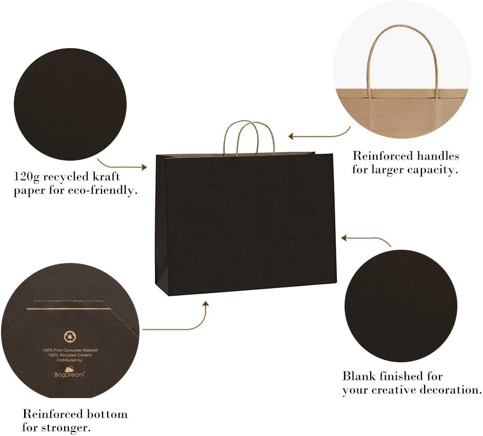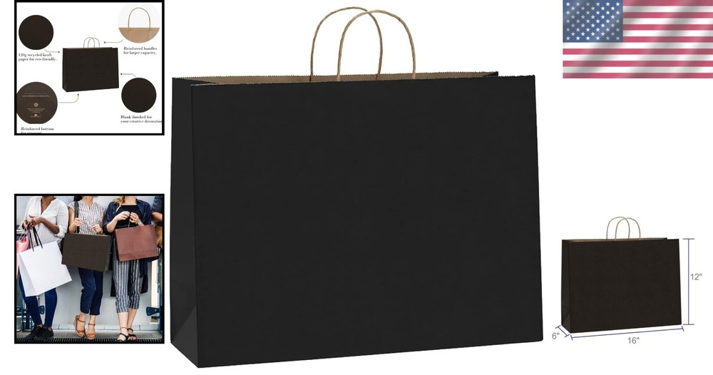 100 Recycled Black Kraft Paper Bags with Handles ‹ › ‹ › ‹ › ‹ › ‹ › ‹ › ‹ › 100 Recycled Black Kraft Paper Bags with Handles Eco-Friendly Elegance Introducing our collection of Recycled Black Paper Bags, designed to elevate your packaging experience while being kind to the planet. Made from high-quality 120g basis weight kraft paper, these bags feature a serrated top edge for a polished finish. FSC compliant, it’s time to green your life with these stylish yet sustainable alternatives. Unmatched Quality Sturdy and reliable: Holds up to 13 lbs with solid bottoms that allow them to stand alone with ease. No stray glue – expertly constructed for a clean, professional appearance. Black paper shopping bags come with elegant paper twist handles for easy carrying. Recyclable and Chic Opt for our recyclable kraft paper bags and bid farewell to unattractive plastic. With no peculiar smells, these bags emanate sophistication, making them the perfect choice for any occasion or business need. Creative Freedom These undecorated kraft gift bags allow for endless creativity! Let your kids personalize them with drawings, or enhance your brand by attaching your business card or stamping your logo on the exterior. The possibilities are endless. Versatile Uses Perfect for clothing, jewelry, retail merchandise, gift items, and craft shows. Ideal as shopping bags, gift bags, or standard paper bags for all occasions. Why Choose Our Recycled Black Kraft Paper Bags? By choosing our recycled paper bags, you are not only making a statement of style and elegance but also contributing to a sustainable future. Whether it’s for retail, gifting, or special events, our bags provide the perfect blend of functionality and sophistication. Elevate your packaging game today! Shipping Free & Fast Shipping - We offer free shipping to most of the USA with a normal delivery time of 3-10 business days. However, due to various situations, additional delivery time (up to 3 weeks) may be required for some items. Alternative Carriers - We may use alternative carriers (e.g. USPS, FedEx, UPS, etc.) to ensure your package arrives safely and on time. Due to the use of multiple carriers, we are unable to provide a tracking number automatically. Handling Time - Orders are processed and shipped within 1-5 business days of receiving cleared payment. Shipping Restrictions - Shipping to Alaska, Hawaii, Puerto Rico, Guam, and other US territories may incur shipping charges or delivery restrictions. Please contact us before ordering, or your order can be refunded/cancelled. State Restrictions - There may be restrictions based on your state of purchase. For example, certain items may not be shipped to California due to state regulations. Contact for Tracking Updates - If you require tracking updates or have any concerns about the delivery of your order, please feel free to contact us, and we will be happy to assist you. Return 30-Day Hassle-Free Returns - We want you to be completely satisfied with your purchase. If you are not, you can return the item within 30 days of receiving it for a full refund or exchange. Easy Return Process - To start a return, simply contact us and we will provide you with a prepaid return shipping label and detailed instructions. Restocking Fee - There are no restocking fees for returns. However, the buyer is responsible for return shipping costs if the return is not due to a seller's error. Refund Processing Time - Refunds will be processed within 5 business days of receiving the returned item in its condition. Payment We accept all major credit cards, PayPal, and Apple Pay for your convenience. Your payment information is secure and encrypted to ensure a safe and seamless transaction. Please complete your payment within 3 days of purchase to avoid any delays in shipping. Feedback Your feedback is extremely important to us. We strive to provide the best products and customer service possible. If you are satisfied with your purchase, please take a moment to leave us a positive review. If you have any concerns or issues with your order, please contact us before leaving negative feedback. We are committed to resolving any problems and ensuring your satisfaction. Contact Us If you have any questions or concerns, please feel free to out to our customer support team. You can contact us through the eBay messaging system. We are available Monday to Friday, 9:00 am to 5:00 pm EST, and we will do our best to respond to your inquiry within 24 hours. Buy it now and enjoy a pleasant shopping experience! Unit Quantity: 100.0 count Material: Paper,Recycled Paper,Kraft Paper Type: Bags Occasion: All Occasions Size: Large Color: Black Theme: 16x6x12 Paper Bags Black Pattern: Solid Recipient: Multipurpose Style: Solid