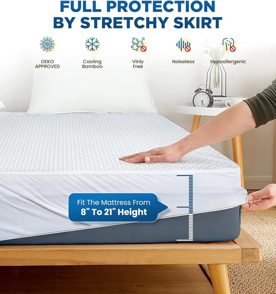 100% Waterproof Queen Mattress Protector Breathable Cooling 3D Queen, White Product Details Brand: BOSANE Color: White Size: Queen Fabric Type: 38% Rayon Derived from Bamboo + 62% Polyester Special Feature: 2X Waterproof, Hypoallergenic, Deep Pocket, Noiseless, Breathable Closure Type: Pull On Product Care Instructions: Machine Wash Water Resistance Level: Waterproof Age Range (Description): All Ages Material: Surface: 38% Rayon derived from Bamboo + 62% Polyester Model Name: BSN-01 Number of Items: 1 Manufacturer: BOSANE Product Dimensions: 80 x 60 x 18 inches Item Weight: 3.92 pounds Item model number: BSN-01 100% WATERPROOF - Made with 30% THICKER waterproof layer than others in the market, BOSANE super waterproof mattress protector will protect your treasured mattress from every last drop and make it stay fresh and clean for decades! 100% HYPOALLERGENIC & SAFE MATTRESS COVER PROVED BY OEKO-TEX STANDARD 100 CERTIFICATE! - You can rest assured that you can sleep directly on our mattress protector queen which is made of 38% bamboo rayon, 62% polyester with NO chemical bleach and 0 harmful substances like vinyl and benzene. The bamboo fiber gives you ultra soft comfort and is great at sweat and odor wicking, the polyester meanwhile offers the flexibility and durability against the wear and tear to make it last for years. 100% QUIET & BREATHABLE - Featuring advanced 3D air mesh design and breathable membrane, BOSANE queen size mattress protector allows air to come out and flow through the thousands of holes on the surface to carry out the heat without a hinch. Fitting all kinds of mattress tightly from 8" to 21" height, our 18" stretchy pocket ensures this bed cover queen won't slide around and make noise when you toss and turn. 100% MACHINE WASH FRIENDLY, SUPPORT TUMBLE DRY - Need clean it regularly? Just toss it into the machine and wash it in the cold water. The US PATENTED compound adhesive enables our queen mattress cover to keep waterproof after over 500 machine wash cycles(about 10 Years) and support low-temp tumble dry below 122℉. Easy Clean, Easy Life! 100% HASSLE-FREE AFTER-SALE SERVICE - We always hold the belief that our queen waterproof mattress protector will save your life from avoidable problems and keep you from every little frustration. That also applies to our service. Each mattress protector from us is backed with the 10-year after sale servce and we promise the hassle-free replacement or refund without the need to RETURN if you are unsatisfied with the product!