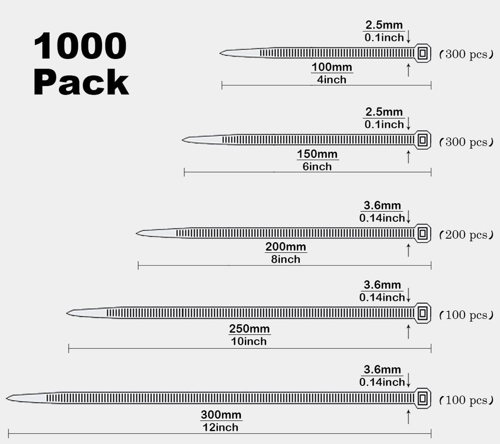 OKSD-CBT-A03 Package Contains: 1000 Pcs Nylon Cable Ties Size: Length 100/150/200/250/300mm 4/6/8/10/12 Inch Width 2.5/3.6mm 0.1/0.14 Inch(Tensile Strength: 18-40 Pounds) Color: Black Material: Durable, UV-Resistant Nylon 6/6 Perfect for: Commercial Purposes, Home DIY, Cable Management, Special Events, Workshop, Office, Packaging, or in the Garden
