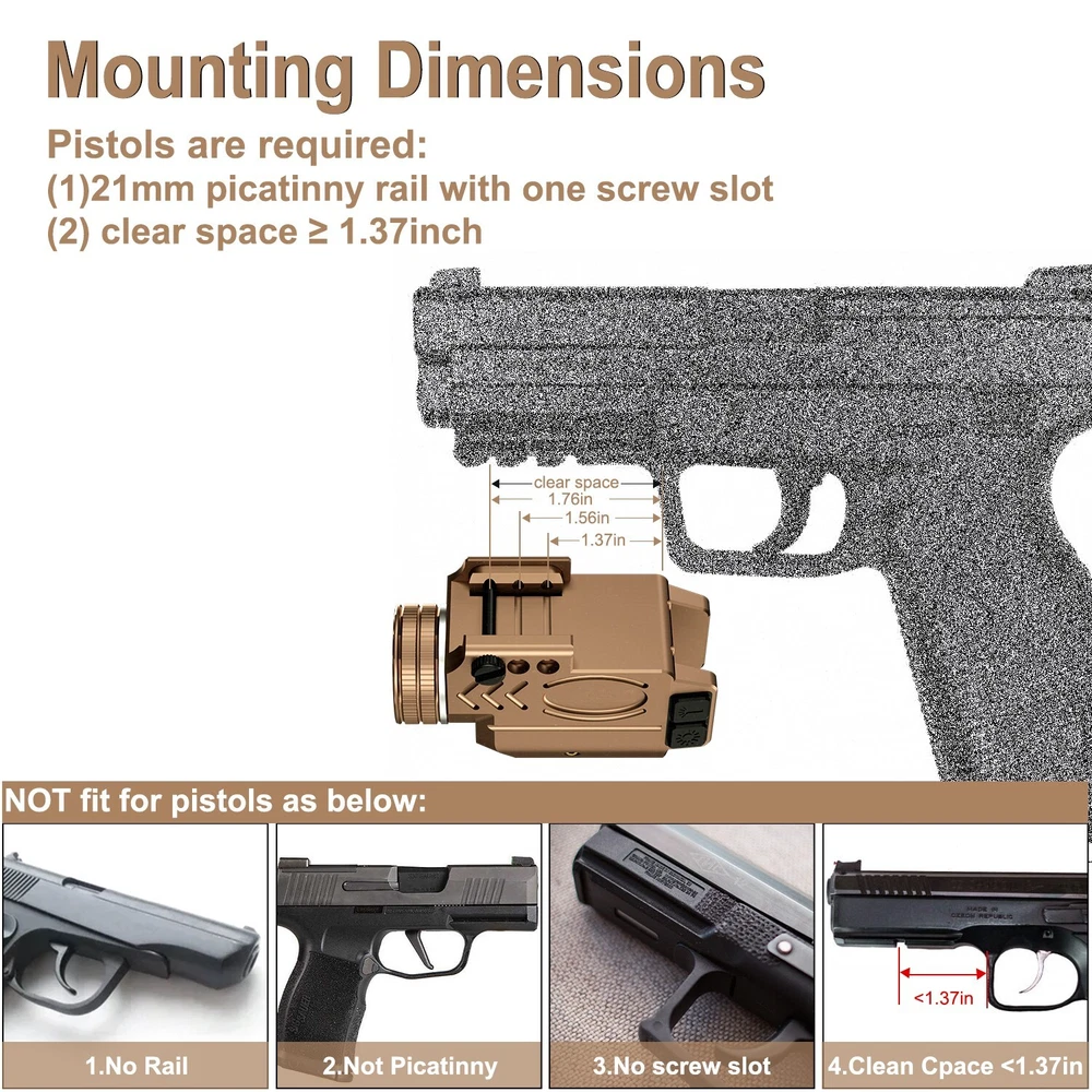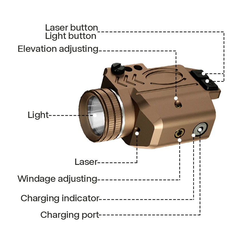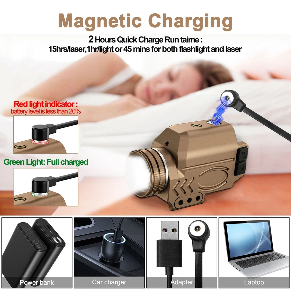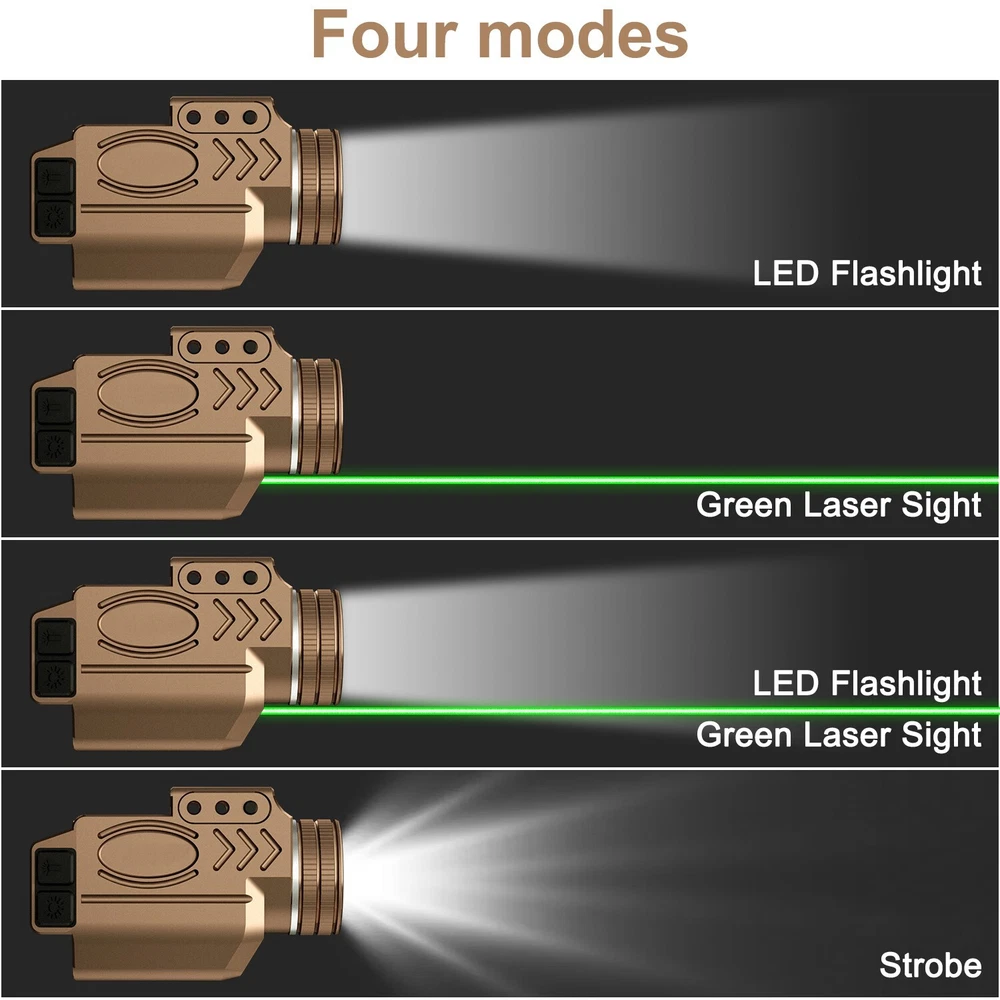 1000 Lumens Compact Rail Mount Weaponlight with Green Beam and White LED Combo, Magnetic USB Rechargeable Tactical Flashlight Green Laser Light Combo Built-in Magnetic Rechargeable Battery Detailed Parameters Item Name Green Laser Sight with 1000 Lumens Tactical Flashlight Model GL50-G Green Laser 515-520nm, Class IIIA, ≤5mW LED Light Max Output 1000 Lumens Light Source CREE 12 watts LED Continuous Laser Runtime 17 Hours Continuous LED Light Runtime 75 minutes Laser Light Combo Runtime 50 minutes Charging Voltage 4.2v - 7v Operating Temperature -10℃-- +50℃ Charging Time 2 Hours Waterproof Rate IPX6 waterproof Material Hard-oxidized aluminum alloy Weight 3.12 OZ
