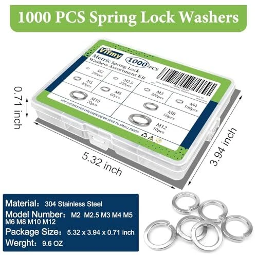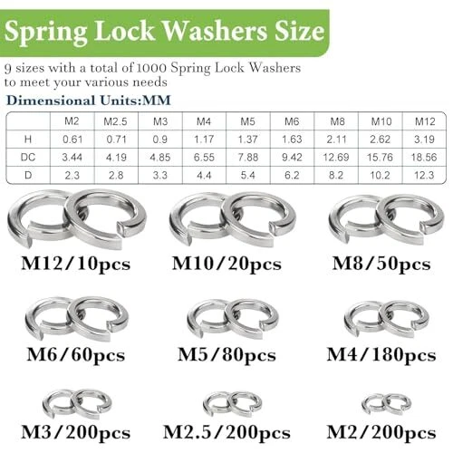 1000 Pcs Spring Lock Washers Assortment Kit M2-M12 Metric Split Set Screws Bolts Spring Lock Washers: The metric spring lock washers assortment kit contains 9 sizes 1000 pcs, which are m2(200 pcs),m2.5(200 pcs),m3(200 pcs),m4(180 pcs),m5(80 pcs),m6(60 pcs),m8(50 pcs),m10(20 pcs),m12(10 pcs) ,9 different sizes of lock washers From furniture DIY to building construction, help you get the job done 304 Stainless Steel: 304 Stainless steel split lock washer are made of high-strength materials with good corrosion resistance and long service life. Compared to galvanised materials, the oxidation resistance, corrosion resistance and rust resistance are stronger, thus increasing the service life of the product Split Lock Washer Function: Split washer are mainly used for nuts, bolts and screws from rotating and loosening due to vibration and friction, and play a role in preventing loosening and fixing objects to ensure the stability of machines Convenient Storage: Each of the 9 different sizes of spring lock washers are individually stowed by type in an easy to carry clear case.Easy to store and use,so that the rivnut will not be lost or mixed up during use Wide Application: Spring washers are highly compatible with screws, nuts and bolts of the same size and can be used to connect moving parts or to prevent loose connections, such as in furniture repair, outdoor construction, and electrical maintenance Shipping We offer FREE shipping on all orders! We ship within Three business days of payment, usually sooner. We use a selection of shipping services such as UPS, FedEx, USPS etc. We only ship to the lower 48 states, no APO/FPO addresses or PO Boxes allowed. Local pickups and combined shipping options are not provided at this time. Return You can return a product for up to 30 days from the date you purchased it. Any product you return must be in the same condition you received it and in the original packaging. Please keep the receipt. Payment We accept payment by any of the following methods: PayPal Please pay as soon as possible after winning an auction, as that will allow us to post your item to you sooner! Feedback Customer satisfaction is very important to us. If you have any problem with your order, please contact us and we will do our best to make you satisfied. Contact Us If you have any queries, please contact us via ebay. We usually respond within 24 hours on weekdays. Please visit our eBay store to check out other items for sale! Thank you for shopping at our store.