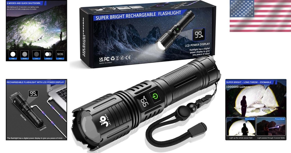 1000000 Lumen Zoomable Rechargeable Flashlight with Digital Power Display ‹ › ‹ › ‹ › ‹ › ‹ › ‹ › ‹ › ‹ › ‹ › ‹ › ‹ › 1000000 Lumen Zoomable Rechargeable Flashlight Illuminate your surroundings with unmatched brilliance and versatility. This extraordinary flashlight offers a staggering 1,000,000 lumens, providing both a penetrating spotlight that can beam over 1,800 meters on the darkest of nights, and a wide floodlight designed to effortlessly light up a campsite of up to 280 square meters. Key Features: High Brightness: Super bright LED technology for ultimate visibility. Rechargeable & Smart Display: An integrated LCD power display keeps you informed about the battery life in real time, ensuring you’re never caught off guard. Robust Waterproof Design: Engineered from thickened aviation-grade aluminum alloy with an IP67 waterproof rating, this flashlight is built to withstand drops from 10 feet and harsh weather conditions. Extended Battery Life: The upgraded high-capacity battery provides up to 4 hours of powerful illumination on high mode and all night on low mode. 5 Versatile Lighting Modes: Choose from strong, medium, low, strobe, and SOS modes to suit any situation. Quick Shut-Off Feature: Effortlessly turn off the flashlight with a single click after 10 seconds of use, skipping through modes for convenience. USB-C Charging with Power Bank Function: Charge your flashlight easily and use it as a power bank to recharge your mobile device on-the-go. Your Ideal Adventure Companion: Perfect for camping, hiking, and night-time emergencies, this flashlight is both an indispensable tool and a reliable companion for all your outdoor adventures. Customer Assurance: With every purchase, enjoy a 24-month warranty that guarantees quality and satisfaction. Should any questions arise, our dedicated support team is always at your service. Choose the ultimate power and versatility with the 1000000 Lumen Zoomable Rechargeable Flashlight. Illuminate your path, enhance your outdoor experience, and embrace the dark with confidence. Shipping Free & Fast Shipping - We offer free shipping to most of the USA with a normal delivery time of 3-7 days. However, due to the current situation, additional delivery time (up to 3 weeks) may be required for some items. Alternative Carriers - We may use alternative carriers (e.g. USPS, FedEx, UPS, etc.) to ensure your package arrives safely and on time. Due to the use of multiple carriers, we are unable to provide a tracking number automatically. Handling Time - Orders are processed and shipped within 1-2 business days of receiving cleared payment. Shipping Restrictions - Shipping to Alaska, Hawaii, Puerto Rico, Guam, and other US territories may incur shipping charges or delivery restrictions. Please contact us before ordering, or your order can be refunded/cancelled. State Restrictions - There may be restrictions based on your state of purchase. For example, certain items may not be shipped to California due to state regulations. Contact for Tracking Updates - If you require tracking updates or have any concerns about the delivery of your order, please feel free to contact us, and we will be happy to assist you. Return 30-Day Hassle-Free Returns - We want you to be completely satisfied with your purchase. If you are not, you can return the item within 30 days of receiving it for a full refund or exchange. Easy Return Process - To start a return, simply contact us and we will provide you with a prepaid return shipping label and detailed instructions. Restocking Fee - There are no restocking fees for returns. However, the buyer is responsible for return shipping costs if the return is not due to a seller's error. Refund Processing Time - Refunds will be processed within 5 business days of receiving the returned item in its original condition. Payment We accept all major credit cards, PayPal, and Apple Pay for your convenience. Your payment information is secure and encrypted to ensure a safe and seamless transaction. Please complete your payment within 3 days of purchase to avoid any delays in shipping. Feedback Your feedback is extremely important to us. We strive to provide the best products and customer service possible. If you are satisfied with your purchase, please take a moment to leave us a positive review. If you have any concerns or issues with your order, please contact us before leaving negative feedback. We are committed to resolving any problems and ensuring your satisfaction. Contact Us If you have any questions or concerns, please feel free to reach out to our customer support team. You can contact us through the eBay messaging system. We are available Monday to Friday, 9:00 am to 5:00 pm EST, and we will do our best to respond to your inquiry within 24 hours. Thank you for supporting our small family business! UPC: Not Set Voltage: 4.2 volts Item Height: Rechargeable LED Flashlights Item Length: Rechargeable LED Flashlights Item Weight: 0.9 pounds Item Width: Not Set Model: Not Set Lumens: 1000000 lumen Number of LEDs: Not Set Unit Quantity: 1 Features: Rechargeable,Waterproof,Digital Power Display,Zoomable,Multiple Lighting Modes,High Lumen Output Material: Aluminum Brand: Unbranded Type: Flashlight Lighting Technology: LED Power Source: Battery Operating Range: 1800 m MPN: Not Set Battery Technology: Lithium-Ion Number of Batteries: 1 Color: Black Country/Region of Manufacture: Not Set IP Rating: IP67 Operating Time: 4 Hours Number of Lights: 1 Unit Type: lb Personalize: Not Set