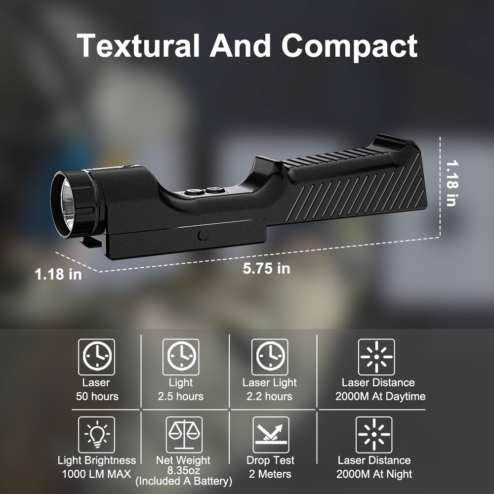 亮度 1000 流明 绿色激光波长:515-532nm 激光功率:3-4.5毫瓦 安装方式:兼容 M-Lok 和皮卡汀尼导轨 制造商 XYH-Win 零件编号 XK76RGB 商品重量:8.4盎司 原产国:中国 商品型号:XK76R 包含组件: 1 个内六角扳手 1 x 1000 流明绿色激光灯, 1 个 M-Lok 导轨适配器, 1 x USB充电线(不含适配器) 操作功能: 按下激光按钮即可立即激活激光。 按下LED灯按钮即可立即激活常亮功能。按住LED灯按钮2秒以上即可激活频闪功能。