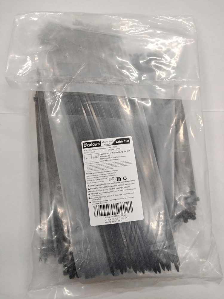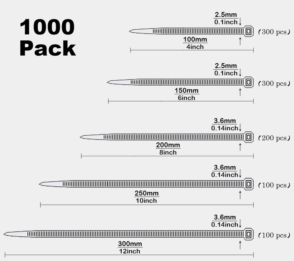 1000 Pcs Black Cable Zip Ties Assorted Sizes 4/6/8/10/12 Inch Heavy Duty Plastic Tie Wraps Mixed Pack Self Locking Nylon Wire Ties Product Details Size: 4+6+8+10+12-Inch(1000PCS Set) Brand: Oksdown MPN: OKSD-CBT-A03 EAN: 8711611191866 UPC: Does not apply Material: Nylon, Plastic Color: Black Brand: Oksdown Item Length: 12 Inches Style: Heavy Duty Material: Nylon, Plastic Color: Black Brand: Oksdown Item Length: 12 Inches Style: Heavy Duty Maximum Diameter: 12 Inches Number of Pieces: 1000 Tensile Strength: 40 Pounds Manufacturer: Oksdown Part Number: OKSD-CBT-A03 Item Weight: 1.28 pounds Country of Origin: China Item model number: LT-OKSD-CBT-A03-DE Size: 4+6+8+10+12-Inch(1000PCS Set) Power Source: Hand Powered Item Package Quantity: 1 Included Components: Bag Batteries Included?: No Batteries Required?: No Date First Available: February 10, 2022 Package Contains: 1000 Pcs Nylon Cable Ties Size: Length 100/150/200/250/300mm 4/6/8/10/12 Inch Width 2.5/3.6mm 0.1/0.14 Inch(Tensile Strength: 18-40 Pounds) Color: Black Material: Durable, UV-Resistant Nylon 6/6 Perfect for: Commercial Purposes, Home DIY, Cable Management, Special Events, Workshop, Office, Packaging, or in the Garden