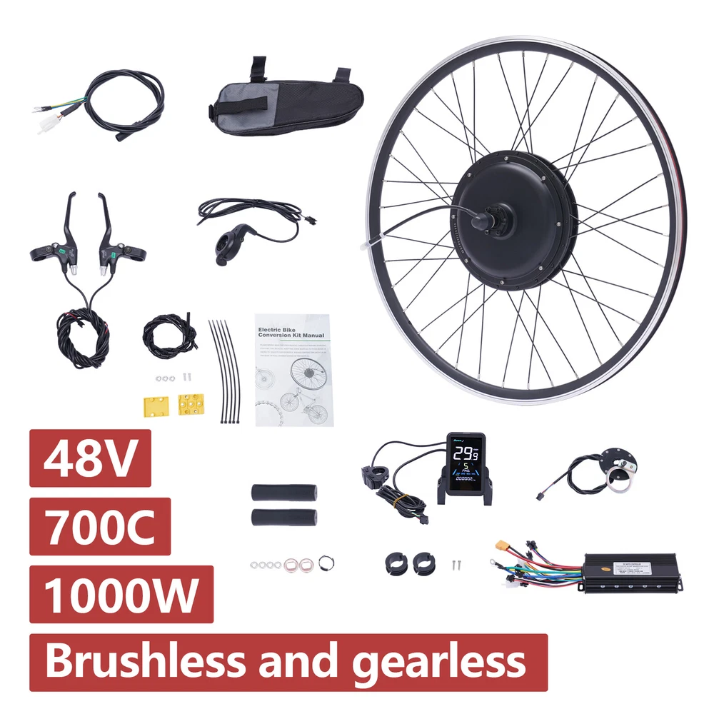 Specifications Material: Aluminum Alloy Color: Black Suspension Type: Front/Rear Special Feature: Electric Assembly Requirement: Yes Brake Type: Power-off Brake Lever (Applicable to V Brake, Disc Brake) Motor Type: Brushless Gearless Motor Gear Adjustment: 5 Gears Recommended Battery: 48V 13AH or Higher Capacity Battery(Not Included) Output Voltage: 48V Power: 1000W Minimum Flat Fork Distance: 100mm/3.94in Speed: 45-55km/h Display Size: 6.8*9.6cm/2.67*3.77in Packing Size: 65*65*22cm/25.59*25.59*8.66in Suitable Wheel Diameter: 28-inch, 29-inch, 700C Gross Weight: 11kg/24.25lbs Net Weight: 10kg/22lbs Loading Capacity: 120kg/264lbs 1000W 48V Front Rear Electric Bicycle Motor Conversion Kit Wheel EBike Hub28"29" Description Do you want to convert your favorite bicycle into an electric bicycle to enjoy its power and comfort? Then you can't miss our electric bicycle motor conversion kit. The display and pedal sensor will allow you to quickly switch between throttle control, cruise control and pedal assist sensor (PAS) to enjoy feeling the headwind on the road. It will be ideal for you! Specifications Material: Aluminum Alloy Color: Black Suspension Type: Front/Rear Special Feature: Electric Assembly Requirement: Yes Brake Type: Power-off Brake Lever (Applicable to V Brake, Disc Brake) Motor Type: Brushless Gearless Motor Gear Adjustment: 5 Gears Recommended Battery: 48V 13AH or Higher Capacity Battery(Not Included) Output Voltage: 48V Power: 1000W Minimum Flat Fork Distance: 100mm/3.94in Speed: 45-55km/h Display Size: 6.8*9.6cm/2.67*3.77in Packing Size: 65*65*22cm/25.59*25.59*8.66in Suitable Wheel Diameter: 28-inch, 29-inch, 700C Gross Weight: 11kg/24.25lbs Net Weight: 10kg/22lbs Loading Capacity: 120kg/264lbs Rear Wheel Package Included: 1* Motor Wheel 1* Display 2* Brake Levers 1* Controller 1* Thumb Knob Handle 1* Controller Bag 1* English Instruction Manual All Accessories for Assembly Front Wheel Package Included: 1* Motor Wheel 1* Display 2* Brake Levers 1* Controller 1* Thumb Knob Handle 1* Controller Bag 1* Pedal Assist Sensor 1 * Motor Cord 1 * Winding Pipe 1* English Instruction Manual All Accessories for Assembly Key Features Enjoy Riding: It converts your bike into an e-bike for efficiency and convenience, allowing you to fully enjoy the fun of riding on your commute and short journeys. Complete Set: This kit contains the complete range of accessories needed to convert your bike without you having to buy them separately. The matching kit will provide you with more consistent and stable performance. User-friendly Features : According to different road conditions and personal needs, it allows 5-gear speed adjustment. At the same time, when the riding speed is maintained, pressing the button key for 2-3 seconds will enter the cruise function, making the riding process easier! Powerful Motor : With a 1000w brushless gearless motor, it can reach a maximum speed of 45-55KM/H. Compared to brush motors, it allows for smooth, fast acceleration and low noise operation without replacing the brush, thus making maintenance easier. Safe and Reliable : The brake lever can cut off the power supply of the motor in case of emergency braking, so that the bicycle can stop in time to ensure riding safety. Dual Mode Controller : The motor works under Hall effect and non-Hall effect. If the component fails, the controller will switch to non-Hall effect mode and the motor will continue to work. Robust and Durable : The aluminum alloy wheel frame is very durable, stable, rust-proof and wear-resistant, ensuring long service life and strong load-bearing capacity, up to 264lbs. Customer Service: We aim to provide quality products and services. If you have any problems, please feel free to contact us. We will reply and solve the problem for you as soon as possible. Notes While connecting the controller to the wires, please make sure that you connect the right colors to the controller. Otherwise, the controller may be broken. This kit does not include tires, batteries and chargers, which need to be purchased by customers. Please check the product size and practical voltage before purchasing. It is suitable for the front wheel of a two-wheeled bike. It cannot be used for three-wheelers or multi-wheelers. Please note that the motor can use hydraulic disc brake and wire disc brake, but the brake handle provided is wire disc brake. Please allow the slight color difference caused by the shooting light and 1-3cm error due to manual measurement, and make sure you do not mind before you order. Payment Delivery details Terms of sales About us Contact us Payment We accept ebay payment 。 Fees such as import duties, taxes are not included in the item price or shipping costs. These charges are the buyer's responsibility. Delivery details Shipping: 2-9 working days to: USA Terms of sales We maintain high standards of excellence and strive for hundred percent customer satisfaction. Feedback is very important to us. We hope that you contact us immediately before you give neutral or negative feedback, so that we can address your concerns. It is impossible to address issues if we do not know about them! About us Your satis faction is our ultimate goal. We work hard to earn your trust and future business. Our certified technicians have tested each item before shipping. The unit comes with 1 year limited warranty on all manufacturing defects. a) If you receive a defective item, you may return it or ask for a discount. Please contact us within 14 days after you receive the package. b) What you returned must be intact and in its original packaging as re? u. Customer is responsible for shipping costs of the returned item. c) We will cover the cost of shipping back t with the shipping rate indicated in the registration page. We will send you a new unit or refund the full payment you paid. Thank you. Contact us Business Hour Business Hour: Monday To Friday: 8:30 AM to 5:00 PM (Beijing China time) Due to time zones, our reply to your 