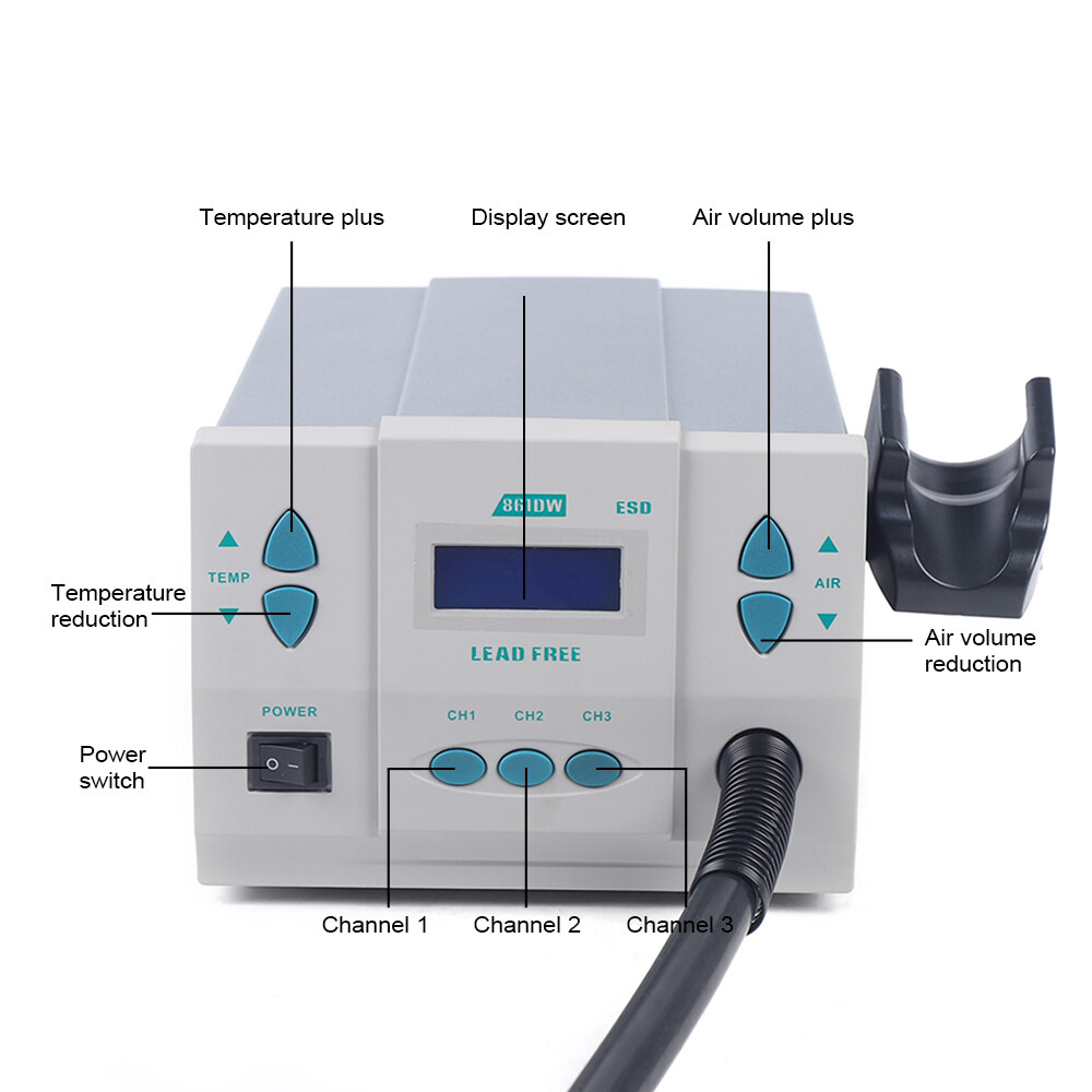 1000W Soldering Hot Air Heat Gun Hot Digital Display Air Rework Station 861DW 1000W Soldering Hot Air Heat Gun Hot Digital Display Air Rework Station 861DW Description: 1000W Hot Air Rework Station Soldering Heat Gun Digital Display Quick Station Specifications: Power: 1000W Voltage: Ac 110V 60Hz Airflow Type: Brushless Turbo Fan Wind Power: ≈250cm/s Temperature Range: 100~500 Temperature Stability: ±1 Display Mode: Digital Display Weights&Dimensions: Net Weight: 4.3kg Gross Weight: 4.9kg Product Size: 24*18.5*13cm(9.44*7.28*5.11inch) Packing Size: 40.5*31*19.5cm(15.94*12.20*7.67inch) Features&Highlights: 1. Temperature Setting, Precise Temperature Control Celsius/Hua Style Temperature Conversion 2. Air Volume Setting Strong Wind Is Heated Evenly, Suitable For All Electrical Circuit Board Maintenance, More Convenient 3. Password Setting Password Protection Key Lock To Prevent The Assembly Line Staff From Adjusting The Temperature At Will, Which Is More Convenient For Operation Management 4. High-Precision Digital Display Sensor Closed Loop Microcomputer Zero Crossing Trigger Temperature Control, 5. Auxiliary Sleep Metal Magnetic Induction Dormancy Bracket, Put The Bracket To Automatically Magnetic Induction Dormancy Standby, Pick Up And Automatically Quickly Return To Temperature 6. Built-In Turbo Blower The Wind Is Softer And More Uniform, And The Life Is Longer 7. Rear Air Outlet Effective Heat Dissipation To Prevent Excessive Temperature Package Included: Digital Display Hot Air Gun + Standard Three Air Nozzles (5mm, 8mm, 10mm) + Air Gun Bracket + Magnetic Dormancy Bracket Payment Delivery details Terms of sales About us Contact us Payment We accept ebay payment 。 Fees such as import duties, taxes are not included in the item price or shipping costs. These charges are the buyer's responsibility. Delivery details Shipping: 2-9 working days to: USA Terms of sales We maintain high standards of excellence and strive for hundred percent customer satisfaction. Feedback is very important to us. We hope that you contact us immediately before you give neutral or negative feedback, so that we can address your concerns. It is impossible to address issues if we do not know about them! About us Your satis faction is our ultimate goal. We work hard to earn your trust and future business. Our certified technicians have tested each item before shipping. The unit comes with 1 year limited warranty on all manufacturing defects. a) If you receive a defective item, you may return it or ask for a discount. Please contact us within 14 days after you receive the package. b) What you returned must be intact and in its original packaging as re? u. Customer is responsible for shipping costs of the returned item. c) We will cover the cost of shipping back t with the shipping rate indicated in the registration page. We will send you a new unit or refund the full payment you paid. Thank you. Contact us Business Hour Business Hour: Monday To Friday: 8:30 AM to 5:00 PM (Beijing China time) Due to time zones, our reply to your questions may not be immediately. But within above working time, we will reply your email within 24 hours. If it's non-workdays, please kindly be patient and wait till Monday. Please contact us with ebay message. Please feel free to contact us if you have any questions. Monday To Friday: 8:30 AM to 5:00 PM (Beijing China time) Due to time zones, our reply to your questions may not be immediately. But within above working time, we will reply your email within 24 hours. If it's non-workdays, please kindly be patient and wait till Monday. Please contact us with ebay message. Please feel free to contact us if you have any questions. Feature^ High Quality with Warranty Service If you have any question, please contact us! * Feature * ❤Beautiful Appearance❤ Country of Origin Unknown Brand Unbranded Item Type Digital Display Hot Air Gun Power 1000W Voltage Ac 110V 60Hz Airflow Type Brushless Turbo Fan Temperature Range 100℃~500℃ Temperature Stability ±1℃ Display Mode Digital Display Wind Power ≈250cm/s Net Weight 4.3kg Product Size 24*18.5*13cm(9.44*7.28*5.11inch) Corded/Cordless Corded On Mar 9, 2026 at 19:42:26 PDT, seller added the following information: On Apr 6, 2026 at 19:18:15 PDT, seller added the following information: