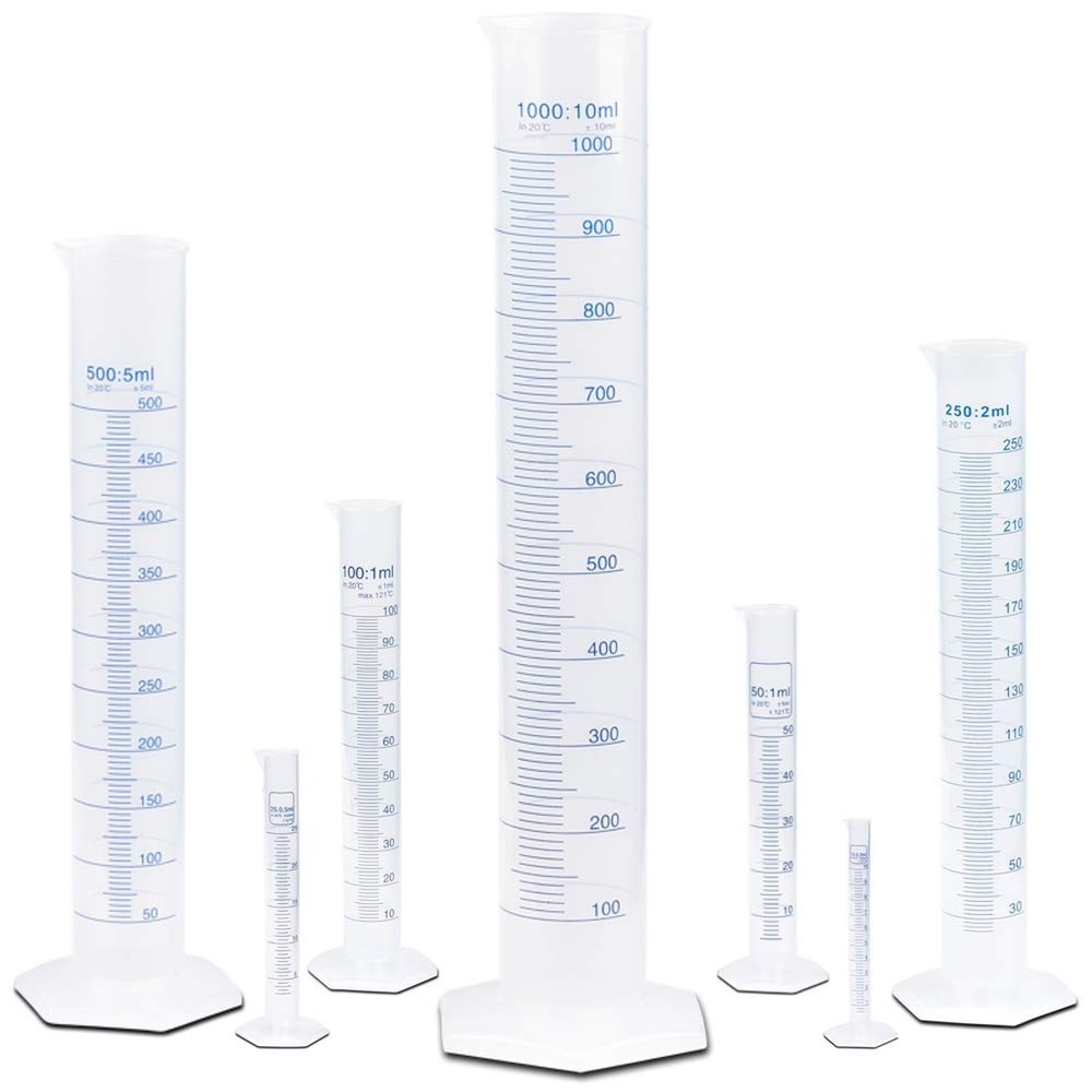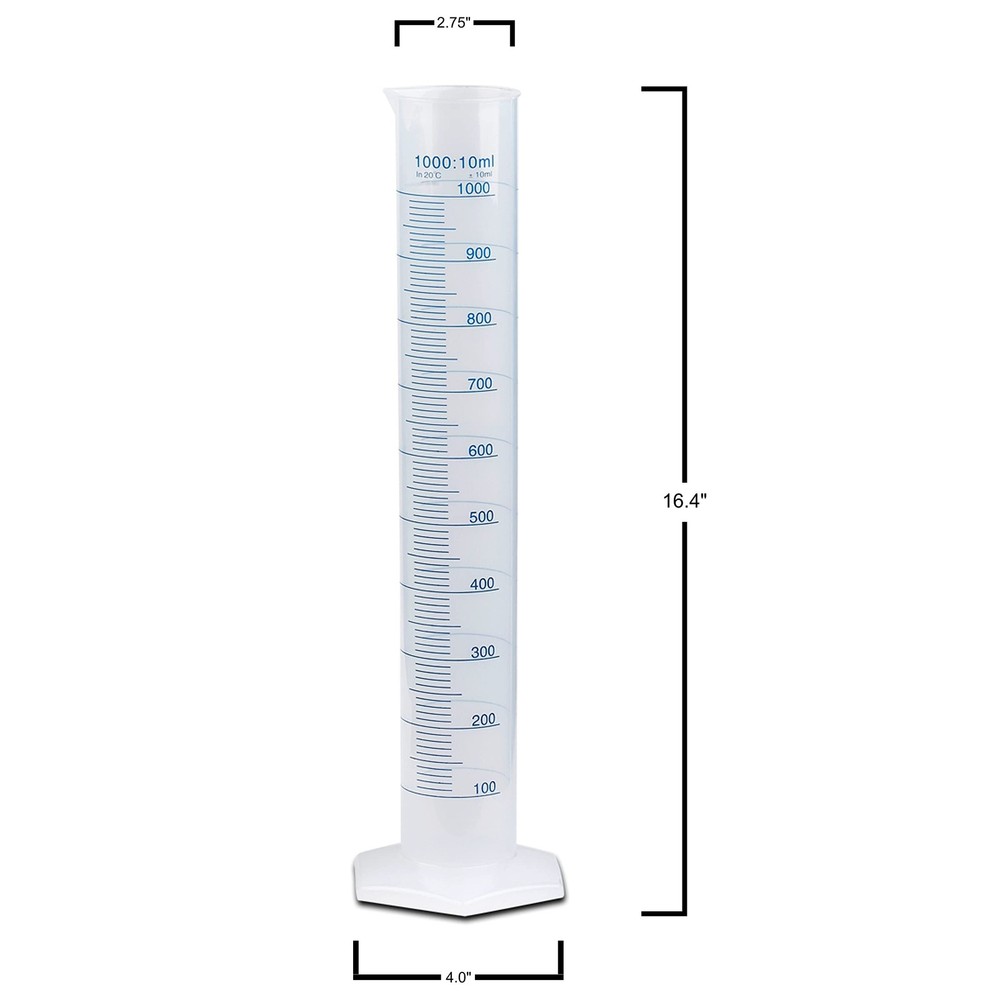 1000ml Plastic Graduated Cylinder, Printed and Molded Graduations, Single Metric Scale, Polypropylene, Karter Scientific 237O2 (Single) Product Details Size: 1000ML Style: PACK OF 1 Brand: Karter Scientific MPN: 237O2 UPC: 812990021176 EAN: 0812990021176 Is Discontinued By Manufacturer : No Package Dimensions : 16.89 x 4.92 x 4.84 inches; 12.63 ounces Item model number : 237O2 Date First Available : September 11, 2017 Manufacturer : Karter Scientific Best Sellers Rank: #12,547 in Industrial & Scientific (See Top 100 in Industrial & Scientific) #9 in Lab Cylinders #9 in Lab Cylinders Customer Reviews: 4.6 4.6 out of 5 stars 864 ratings Cylinder Size : 1000ml Graduations: Blue Printed and Molded Material: Polypropylene Single Metric Scale Autoclavable at 121C (250F) Karter Scientific Plastic Graduated Cylinders are manufactured from roll-proof and easy-to-read polypropylene plastic. Single metric scale has blue printed numerals and graduations with Molded graduations on the opposite side. Flared top and large spout facilitates easy pouring, and hexagonal shaped base prevents tipping and rolling. The 'nonwetting' polypropylene surface eliminates concave meniscus and makes reading easier and more accurate. Chemically resistant and autoclavable at 121°C (250°F). Many sizes and quantities to choose from. Sizes range from 10 - 1000ml.