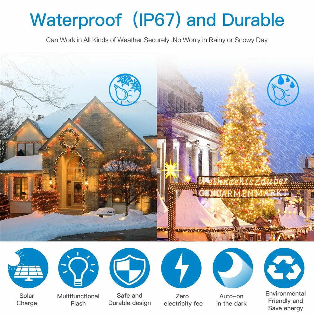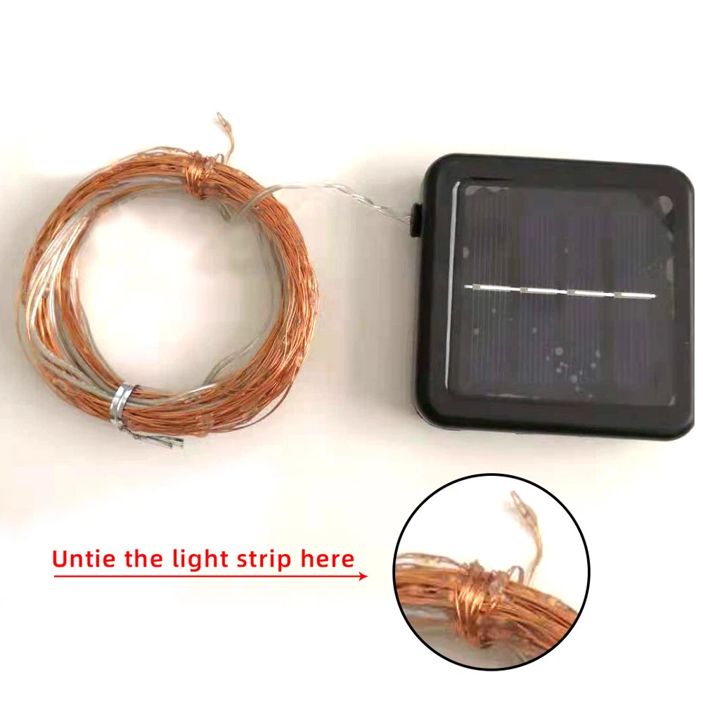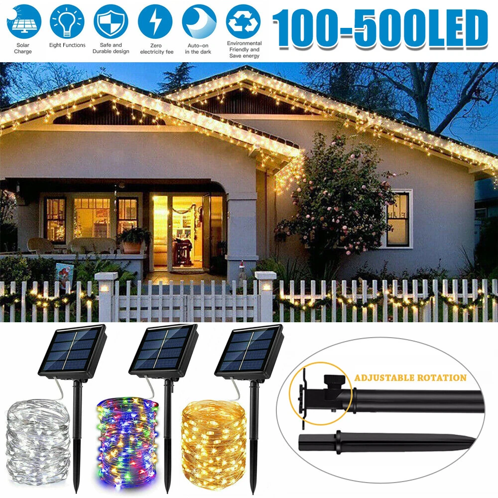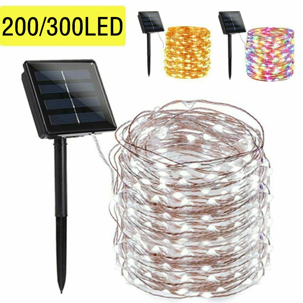 Features: 100% Brand new and high quality Ideal for decorating your gardens, patio, gate, yard, wedding, party etc. High Quality & Flexible Copper Wire - Made with thin and flexible copper wire, coiled with bobbin winder to avoid a mess, the solar powered string lights (low voltage, no transformer included) is easy to storage and ready for the next use. Also, it is environmental- friendly, high energy conversion rate, durable and safe to use. 8 Switch Buttons - ON/OFF&MODE. Auto on at dusk, auto off by day. Waterproof, suitable for indoor and outdoor use Easy to Shape - Flexible Copper wiring can easily build the shapes you want; wrap around tree trunks or gazebos; in the dark, the wire fades to invisible, leaving only the bright lights. Great for Christmas, party or other celebration occasions Specification: LED quantity: 100/200/300/500pcs Solar panel: 1.2v 150mAh Battery: 800mAh Total Length: 10m/33ft 20m/72ft 30m/99ft 50m/166FT Rating Power: 0.6W Voltage: 2V Switch: Power ON/OFF&MODE Switch: 8 Modes: 1-combination, 2-in wave, 3-sequential, 4-slo glo, 5-chasing/flash, 6-slow fade, 7-twinkle/flash, 8-steady Color: Warm White, Multi-color, White Power operated: solar energy(when the solar panel do not face to any light, the LEDs will work.) Notice: Due to the light and monitor difference, the item's color may be slightly different from the pictures. Please allow 1 inch differs due to manual measurement. Package Contents: 1 x LEDs String Light 1 x Solar Panel 1 x English Manual