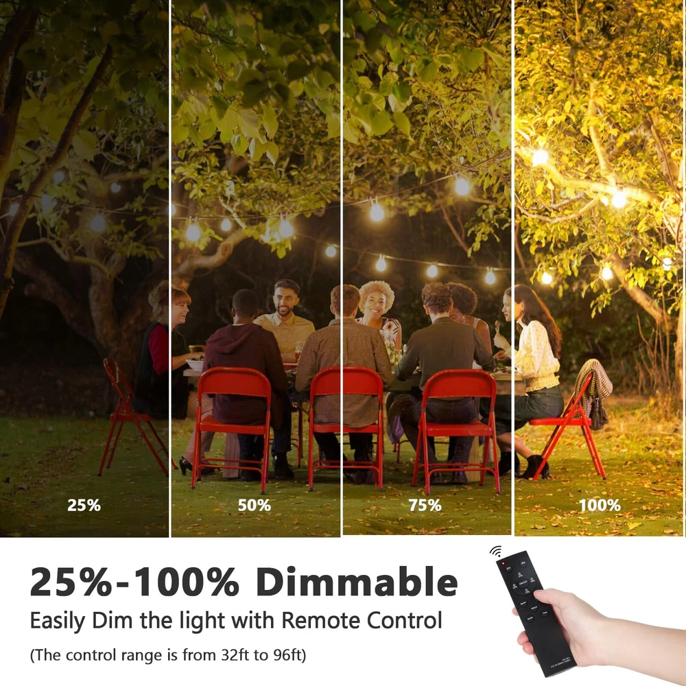 100FT S14 Outdoor Solar String Lights with Remote The LED outdoor string light comes with remote control, which helps you adjust the level of brightness( from 25% to 100%), change the lighting modes ( steady on / breath/flash), as well as set a timer( 6h/8h). IP65 Waterproof & Shatterproof Outdoor String lights Differing from those traditional string lights, commercial-hanging lights are safer and sturdier with shatterproof and durable plastic bulb, withstanding all severe conditions like strong wind, heavy rain, snow, or even sandstorm. 100FT Warm White LED Edison Bulb String Lights These solar-powered patio lights are energy-saving and easy to install. Each bulb consumers only 1W and it can work for 8-12 hours long after fully charged. All bulbs except 1 spare are already in the socket before delivery, so you just need to install the solar panel. Specifications Total string length: 100ft Number of socket: 30 Socket type: E12 Power per bulb: 1W Luminous flux per bulb: 40LM Color temperature: 2700K Charging time: 8-12H Working time:Steady on- 8hrs Breath/Flash 10-12hrs Please note: 1. Please align the the positive(+) pole and negative(-) pole in the connector to correctly connect the solar panel with string lights 2. If single or a few light bulbs do not work, it's probably caused by disconnection between the small copper inside the socket and the bulb base. In this case, please slightly pull out the copper piece to make sure a great with the bulb base. Upgraded Solar String Lights with Remote: S14 solar patio lights with remote is a latest version that caters to all your lighting needs for outdoor spaces. With just a click of the remote, you can effortlessly turn the lights on or off, adjust the brightness and switch between various lighting modes. The added timing function eliminates the need for manual shutdown, saving you valuable time. Don't wait any longer! Get these lights now and transform your surroundings Solar-powered & USB Rechargeable: With a large-capacity and efficient solar panel, the outdoor string lights can work up to 8 hours when fully charged. The 180°adjustable design allows you to effortlessly position the panel for optimal sun exposure. Say goodbye to the hassle of searching for wall outlets and save on your electricity bills. Additionally, the USB rechargeable feature serves as a backup during cloudy or rainy days (the charging cable is not included) Dimming Function & More Lighting Modes: The LED string lights can be dimmed by the included remote controller from 25% to 100% with four different levels. No need to purchase an additional dimmer! Choose from a range of lighting modes, including steady on, breath (speed adjustable), and flash(speed adjustable). These versatile options allow you to create stunning lighting effects tailored to your exact preferences, all at your fingertips Weather-resistant & Shatterproof: Designed with strong rubber strands and fully-sealed sockets, our solar string lights work well in all weather conditions. Crafted with lightweight yet durable plastic bulbs, the waterproof patio lights ensure enhanced safety. They are a perfect choice for various occasions such as barbecues, parties, camping trips, weddings, and all outdoor spaces like patio, yard, pergola, deck, bistro, umbrella, and pool area Easy Installation: This 100FT solar string lights is equipped with 32 S14 bulbs(2 spares), evenly spaced 3FT apart. You have the flexibility to hang the lights using screws, hooks, or cords. The solar panel can be securely fixed with screws or inserted into the ground. Before using the lights, it's important to press the button located at the back of the solar panel to switch it ON. Once activated, you can conveniently control the lights with the remote