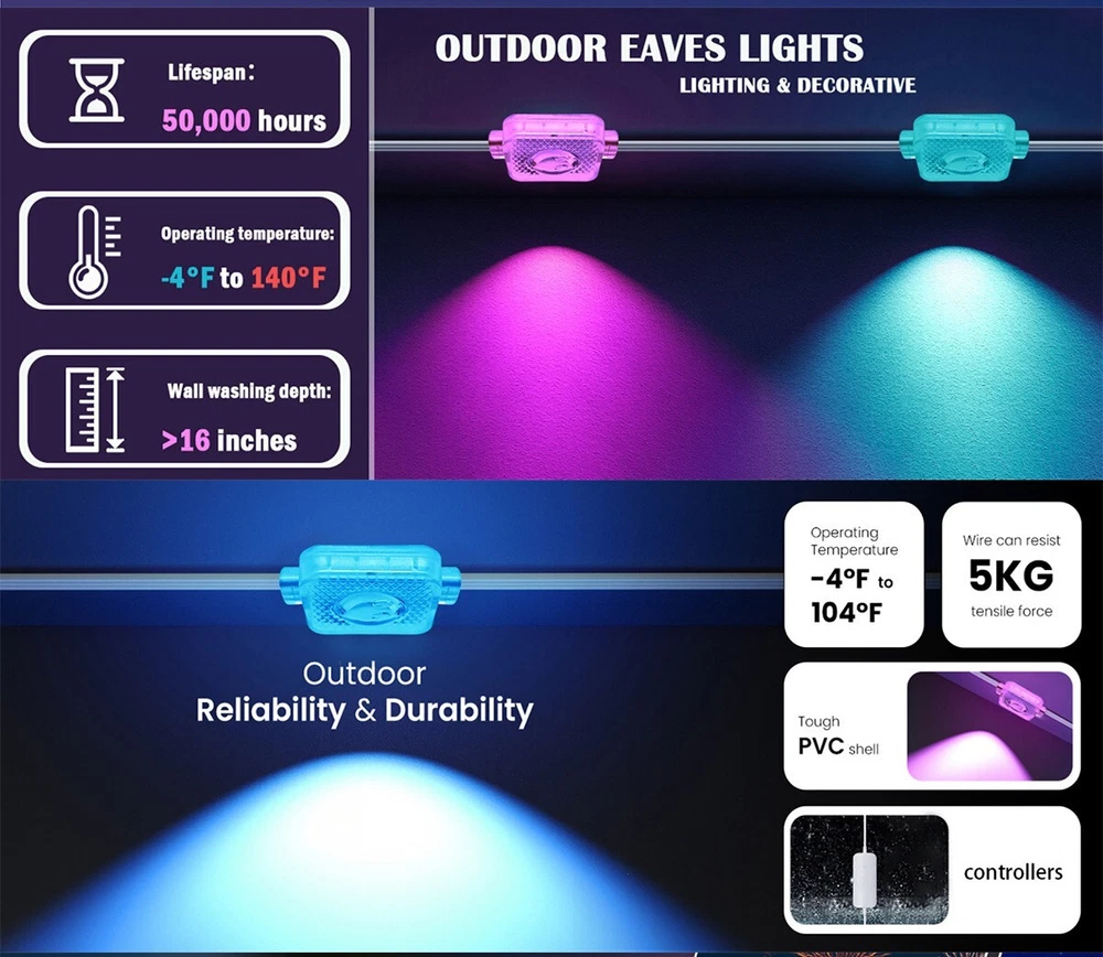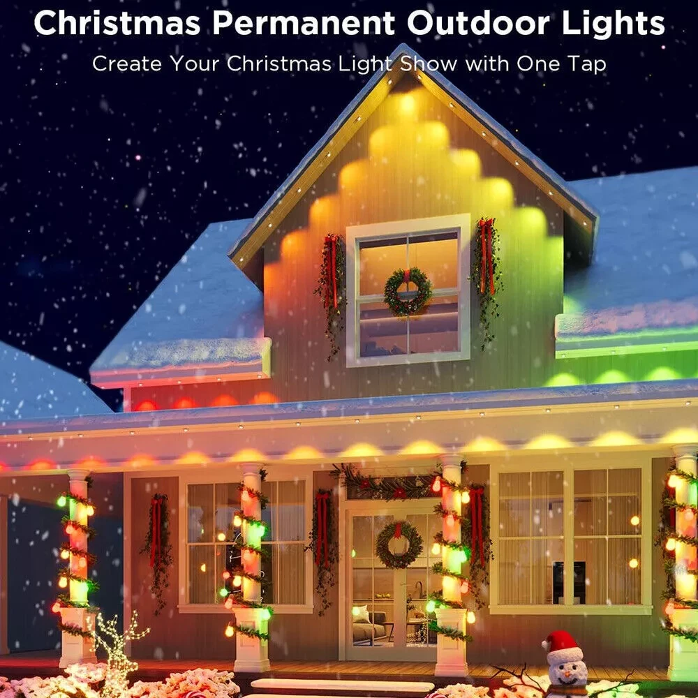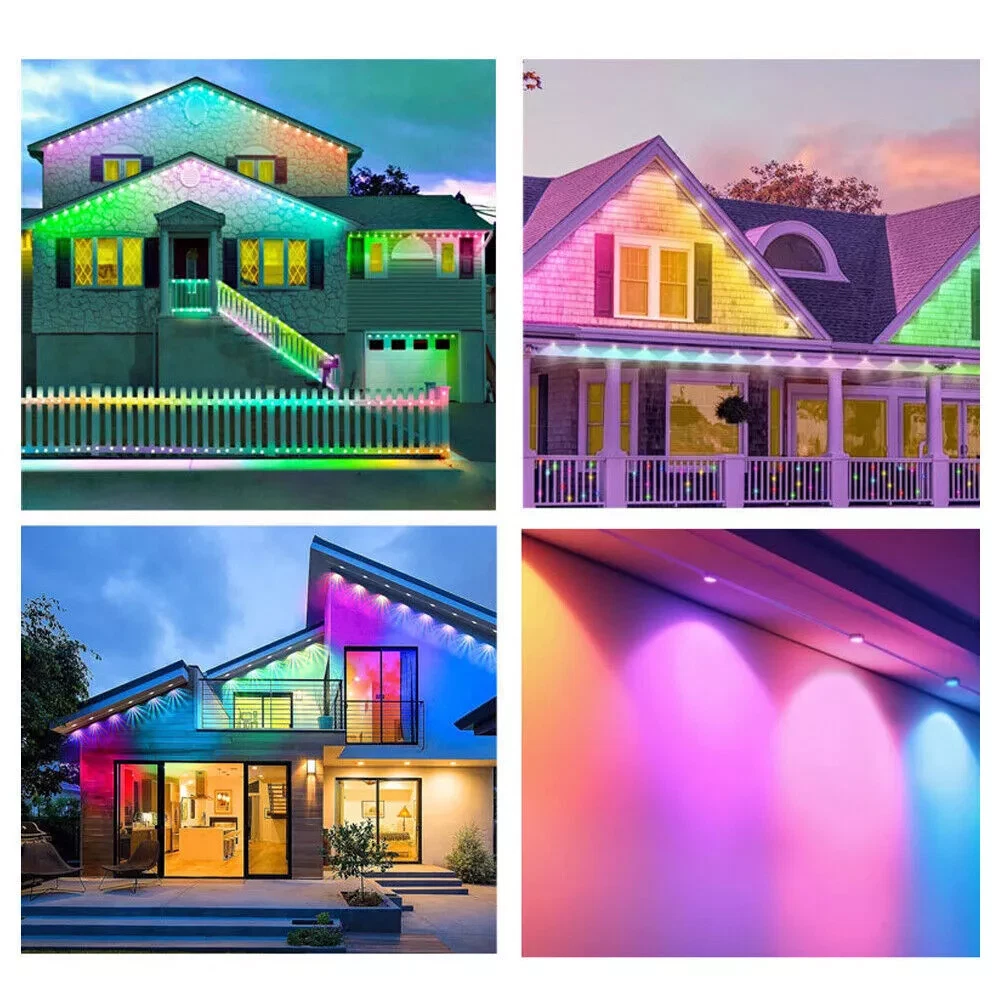 Smart Control Anywhere -- Manage your eternity outdoor lights effortlessly with the included 2.4G remote, providing long-distance control for convenient operation. Bluetooth control -- Unlock a world of color possibilities with endless color chasing modes and solid color options, easily adjustable through the intuitive smartphone app. Year-Round Outdoor Ambiance -- IP68 waterproof design ensures durability in all weather conditions, making these lights perfect for Halloween, Christmas, holidays, and any outdoor party throughout the year. Eye-Catching Triangular Lighting -- Stand out with a unique triangular lighting effect created by the lens design, adding a touch of elegance and flair to your house roof or outdoor space. Expandable Illumination -- With 30 LEDs and a 50ft length or 60LEDs and 100Ft, these lights are extendable to suit various outdoor spaces, providing a stunning visual display for any occasion. Light Source Type: LED Power Sourc: AC/DC Switch Style: alexa Light Direction: Adjustable Controller Type: Voice Control Connectivity Protocol: Bluetooth Average Life: 50000 Hours Material: Plastic Package Dimensions: 17.52 x 10.44 x 6.08 inches Included Components: Light kit inlcuded Bulb Features: Dimmable Light Color: Multicolor Occasion Easter, Christmas, Halloween Special Features Energy Efficient, Dimmable, Waterproof, Color Changing Switch Installation Type: Wall Mount Shade Color: Multicolor Luminous Flux : 26 Lumen Size : 100FT/50FT
