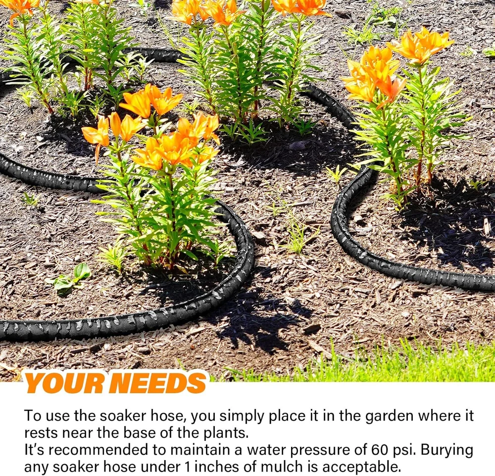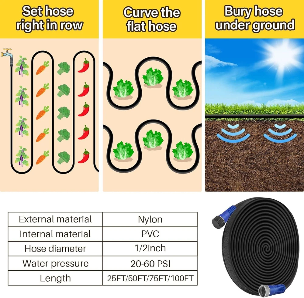 100FT Thickened Flat Garden Soaker Hose - Heavy Duty Double Layer 100FT, Blue Product Details Brand: Winisok Material: Premium PVC Color: Blue Product Dimensions: 2"L x 2"W Maximum Pressure: 60 Pound per Square Inch Item Length: 50 Feet Manufacturer: Winisok Item Weight: 4.4 pounds Country of Origin: China Item model number: Flat Garden Soaker Hose Save 80% Water and Save Time: With the kink-free garden soaker hose, water efficiently reaches plant roots and soil without evaporation, resulting in up to 80% water savings.Also significantly reduces your watering time.Whether positioned above ground or nestled beneath leaves, the hose operates effectively when water pressure remains under 60 PSI. Cloth Cover Upgrade: The soaker hose features an upgraded cloth cover and a durable PVC inner tube, ensuring long-lasting performance even when submerged in water. Easy to DIY: The 3/4" threaded link fittings on the left and right for easy connection to faucets and other hoses. By connecting multiple soaker hoses, you can easily DIY a customized drip irrigation system. Winisok Flat Soaker Hose For GardenAfter our careful selection of materials and strict quality control, this upgraded water-permeable hose will bring you a long-lasting sense of use. It has 10 kinds of lengths to choose from: 15 ft, 25 ft, 30 ft, 45 ft, 50 ft, 60 ft, 75 ft, 100 ft, 150 ft, 200 ft. You can choose the most suitable length according to the actual needs of your courtyard and garden beds.Material: Premium PVC materialSize:15 ft - 1 Pack25 ft - 1 Pack30ft - 1 Pack45ft - 1 Pack50 ft - 1 Pack60 ft - 1 Pack75 ft - 1 Pack100 ft - (50ft 2 Pack)150 ft - (50ft 3 Pack)200 ft - (50ft 4 Pack)Applicable Scenes:Lawn, courtyard, garden bed, raised beds and vegetables or other landscaped areas.Instructions of Use:Easily screw the hose connector to any household hose, starting with a low water pressure to ensure that the hose does not bend or kinks. When the water is working down the hose, slowly increase the best choice for watering: Simply connect it easily and place it in the ideal position to achieve fully automatic continuous deep and uniform:1.The pressure of the soaker hose should not exceed 60 PSI to prevent water pressure can be adjusted with the built-in regulator/restrictor gasket (not included in the package)3.Ensure that the hose is not bent or kinked in use