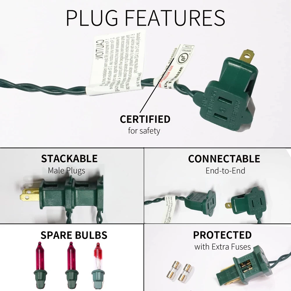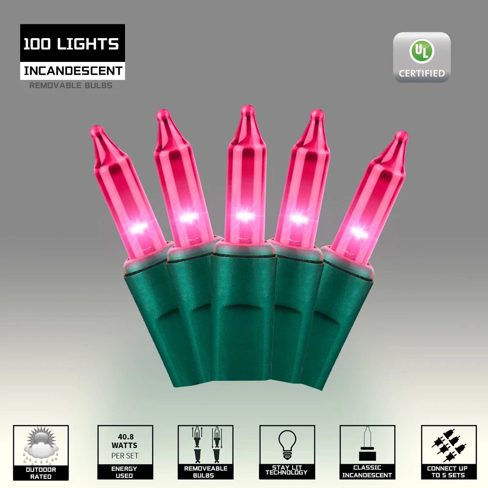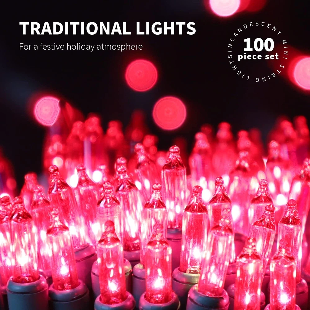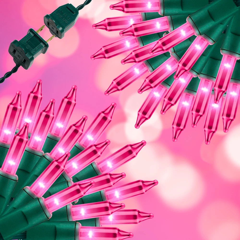 19.6ft Christmas String Light with Green Wire,100 Count Incandescent Mini String Light for Indoor & Outdoor Use - UL Approved - for Christmas Tree Lights, Weddings, and Parties (Pink) Christmas Lights: 100 super bright mini incandescent bulbs string lights, which are enough to fit any indoor and outdoor space, these are the best decoration. Become a warm welcome sign in the evening and make your home a beautiful landscape. Product Nature:Each mini Christmas light set comes with end-to-end plug, can be connectable up to 5 sets (500 lights). Each bulb space 2.5in, 2.5V and 0.425W per bulbs, built-in 3A fuse for safe use. Extra bulbs and fuses are included. Safty and Easily: High quality UL certified products ensure the safety of you and your family, Decorate with 100 pink incandescent mini lights with green wire will give a soft festive feel to your Christmas. More Decoration Scene: Perfect for indoor and outdoor decorations.also great for Various festivals,for example,Christmas, Halloween party, Valentine's Day, wedding and more. REPLACEMENT SERVICE: If there is any quality problem with the 100 pink mini light sets, we will send the new string lights by the fastest way possible.