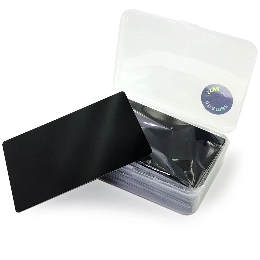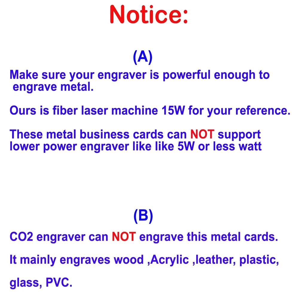 Specifications: Material: Metal aluminum Size: 86X54X0.2mm (about 3.4 X2.13X0.008 inch) Colors: Black/ Blue/ Pink / Golden/ Silver 5 colors options Quantity: Single Color 100pcs per box Package: 100PCS X Single Color per Case 1. Metal aluminum cards , thin type/ 100PCS /3.4 X2.13X0.008 inch. Not so suitable as a high-class Metal business card. If your requirement is high, please buy our thick metal business cards model 2. Blank / round corner / edge not rough / solid perfect packed case, convenient for carry. Engraved effect will be closed to white, and will not be removed. Suit for laser focus point debugging or other industrial usage or promotion gift cards to make it outstanding&unique 3. Except to use it as high-class business card, it is a good choice as Promotion Metal Business Cards / Promotion Card / Metal Plaque / Nameplate / Desk Tag / Lable tag / Name Card / Desk Number Tag / Gift Metal Cards to Personalized your artwork on it 4. Make sure your engraver can engrave metal, ours is fiber laser machine 15W for your reference. Low watt like 5W or less might not come out a good effect 5. Notice: 1.This thin card is NOT suitable for sublimation printing directly. 2. CO2 engraver mainly engraves wood ,Acrylic ,plastic, glass, ...material, but NOT engrave metal material
