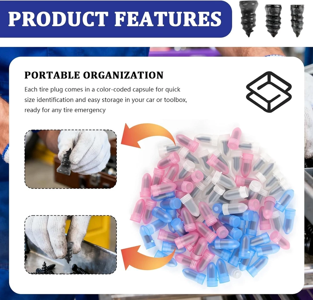 Store New Arrivals Add to Favorite View Feedback Contact 100PCS Tire Repair Screws Kit With Screwdriver 3 Sizes Rubber Plugs Flat Tires Description Item model number Screw Tire Plugs Kits Manufacturer Part Number -Lun Tai Ding Xiu Bu-1104 Item Weight 1 ounces Model Screw in Tires Plugs Product Dimensions 0.5 x 0.27 x 0.27 inches COMPLETE KIT CONTENTS: This tire plug screws kit includes 100pcs with 3 sizes: 33 large (0.52×0.29×0.29") for 3.5-5mm holes, 33 medium (0.5×0.27×0.27") for 2-4mm holes, 33 small (0.46×0.24×0.24") for less than or equal to 3mm hole, plus 1 screwdriver. Please verify the size before placing your order RAPID EMERGENCY REPAIR: Designed specifically for fast roadside assistance, these screw in tire repair plugs feature a simple twist-in installation. They can quickly fix punctures in just minutes, getting you back on the road without having to wait endlessly for a repair crew to arrive SECURE SEAL: Carbon steel cores provide strength while rubber-coated exteriors with threaded designs create secure seals. These tire repair screws feature compatible rubber that supports aging resistance, fitting tire materials without additional damage during installation PORTABLE ORGANIZATION: Each tire screw plug is individually stored in a capsule case for easy organization in your car toolbox or for carrying in your vehicle. The different colors capsules by size allow you to quickly locate the right model during emergencies, lets you handle tire emergencies SIMPLE APPLICATION: Locate puncture with bubble water, clear away foreign object, choose tire plugs screw type by hole size, align with puncture, and tighten clockwise with a screwdriver until fully embedded and flush. Finally, check for air bubbles with bubble water to confirm sealing 3-SIZE RAPID EMERGENCY REPAIR TIRE PLUG KIT WITH UNIVERSAL COMPATIBILITY Product Attributes Colors: Black Sizes: Pink Capsule Medium Tire Repair Screw: 0.5×0.27×0.27 inch (Compatible with 2-4 mm Breaks) Clear Capsule Big Tire Repair Screw: 0.52×0.29×0.29 inch (Compatible with 3.5-5 mm Breaks) Blue Capsule Small Tire Repair Screw: 0.46×0.24×0.24 inch (Compatible with Breaks Less than or Equal to 3 mm) Weight: 7.37 oz Material: Carbon Steel + Rubber Packaging: 33* Large Tire Plugs + 33* Medium Tire Plugs + 33* Small Tire Plugs + 1* Screwdriver Product Feature & Functions 1. Our complete tire plug screws kit contains 100 pieces with 3 sizes: large for 3.5-5mm holes, medium for 2-4mm holes, small for less than or equal to 3mm holes and 1 dedicated screwdriver. The carbon steel cores provide structural strength while rubber-coated exteriors create secure seals, supporting durable performance in various repair scenarios 2. Featuring individual capsule storage with color-coded organization, our tire screw plugs maintain easy accessibility and protection. The straightforward application process requires cleaning the puncture area, selecting the appropriate size, and screwing clockwise until flush with the tire surface for efficient repairs 3. Designed with universal compatibility, our screw in tire repair plugs work with multiple tubeless tires including cars, motorcycles, and trucks. The versatile sizing options accommodate different puncture dimensions across vehicle types, offering comprehensive coverage for diverse automotive repair needs ABOUT US We offer the best prices around on high quality products. Our E-store includes media such as books, movies, music and games while offering electronics, toys, sporting apparel, clothing, tools, general home, garden items and more. SHIPPING We are always working hard to ensure your package arrives as soon as possible. Please understand that some factors like weather, high postal traffic, and the performance of shipping companies are outside of our control. We offer free shipping to the lower 48 states and ship within 2 business days of payment, usually sooner. We do not accept P.O. Boxes. Please provide a physical address. For shipping outside of the continental USA, we only use eBay's Global Shipping Program.The item is shipped to KY and then sent to the rest of the world. International customers are responsible for all duties and taxes. Continue to check out in order to calculate costs for shipping the item to your country. Messages regarding eBay's Global Shipping Program MUST be directed at eBay EXCLUSIVELY. RETURNS We offer a 30-Day Return Policy on items which you are not completely satisfied with. You have the option for a full-refund or an exchange of the item. No returns are available on items shipped outside of the USA. PAYMENT We accept PayPal. CONTACT US This page content is yet to come Please ad us to your favorite seller and visit again later Thank You CUSTOMER SATISFACTION We try our very best to make sure every customer is completely satisfied. If there's a problem, message us! We're happy to help. WE ACCEPT Copyright © 2021 AutoDS. | All Rights Reserved