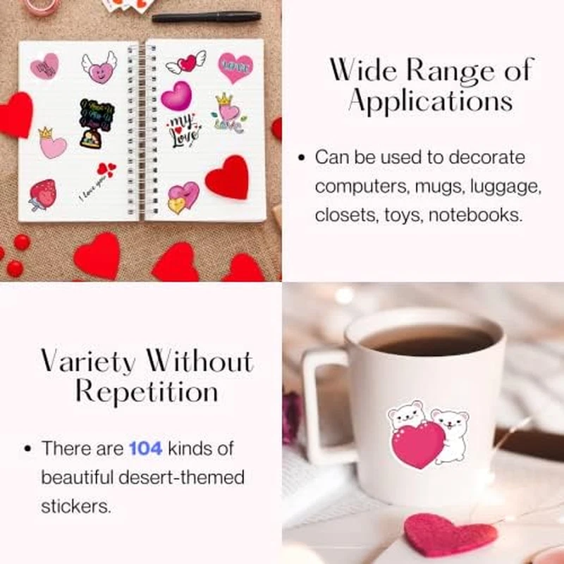 💌 【Quantity & Style】 100PCS I love you vinyl stickers with different styles and no duplicates, enough to decorate various items and add a strong atmosphere to your Valentine's Day. 💖 【Excellent Material】 Personalized graffiti stickers are made of high quality vinyl material, safe and non-toxic, strong adhesive, durable, wrinkle-resistant, waterproof, sun-proof, smooth surface and bright colors. 💟 【Easy to Use】 Valentine's Day decorative stickers are super cute decorations, easy to paste, just simply peel and stick, can be pasted multiple times and will not leave any residue when you take it off. 💕【Wide Application】Valentine's Day stickers can be attached to the surface of luggage, computers, skis, refrigerators, closets, walls, bicycles, notebooks, mirrors, and any other items you want to decorate. 🎁 【Romantic Gift】The perfect gift for weddings, anniversaries and Valentine's Day, a pack of love-themed stickers can bring holiday joy to you and your loved ones, how wonderful it is! Product Description 104PCS unique high definition printed Valentine's Day stickers Gifts Mugs Letter Laptop Notebook bag Product Information Item: Valentine Stickers Weight: 1.5oz Material: Vinyl Quantity:104PCS About Us In this fast-paced age of information technology. The air of paper-based art and culture has been replaced by electronic screens. Holiday wishes have also shifted from greeting cards and letters to electronic screens. We want to come up with products that store our feelings and memories. Use paper art to express the good times of our holidays and wishes for our loved ones. DERFILIN would like to be with you every day of your life!
