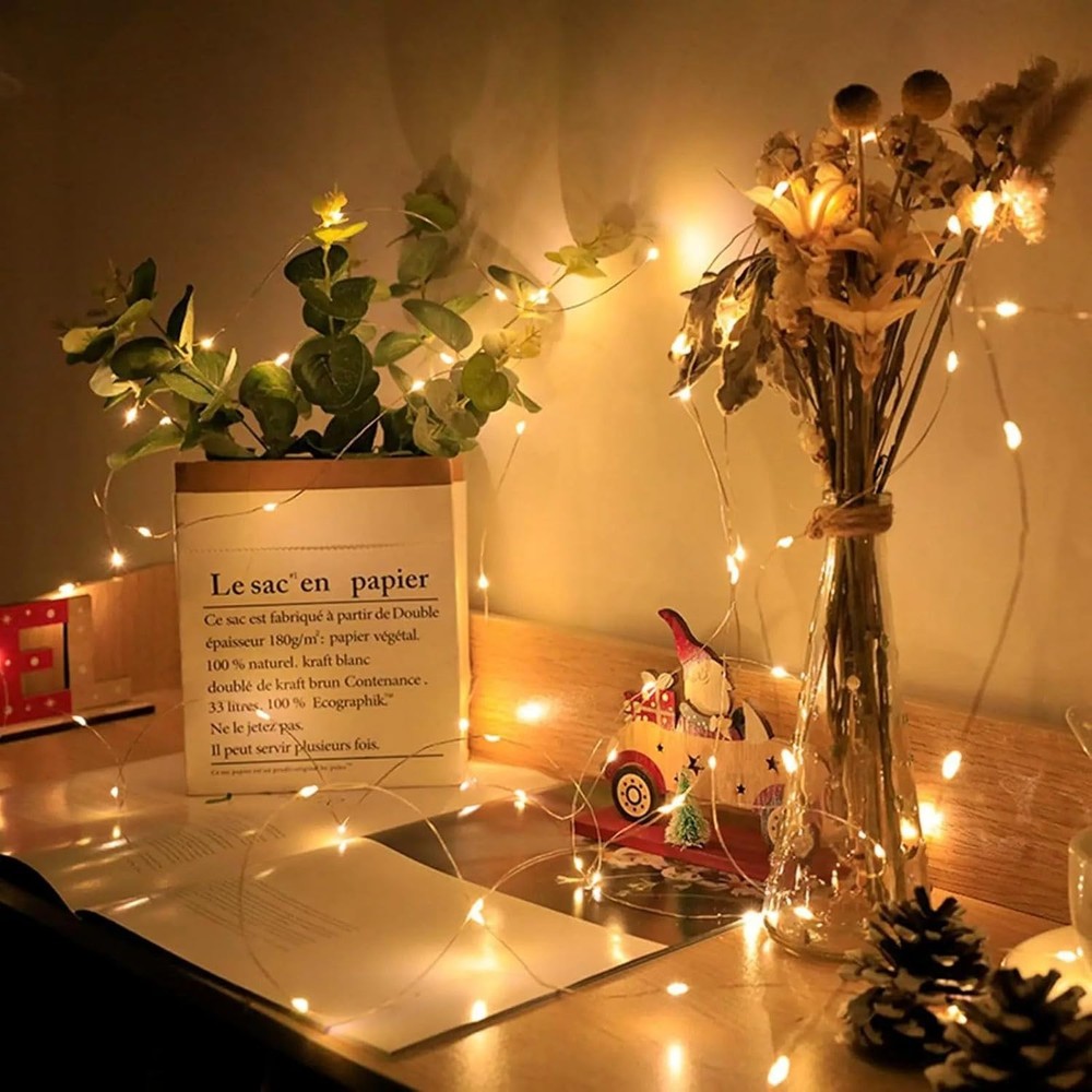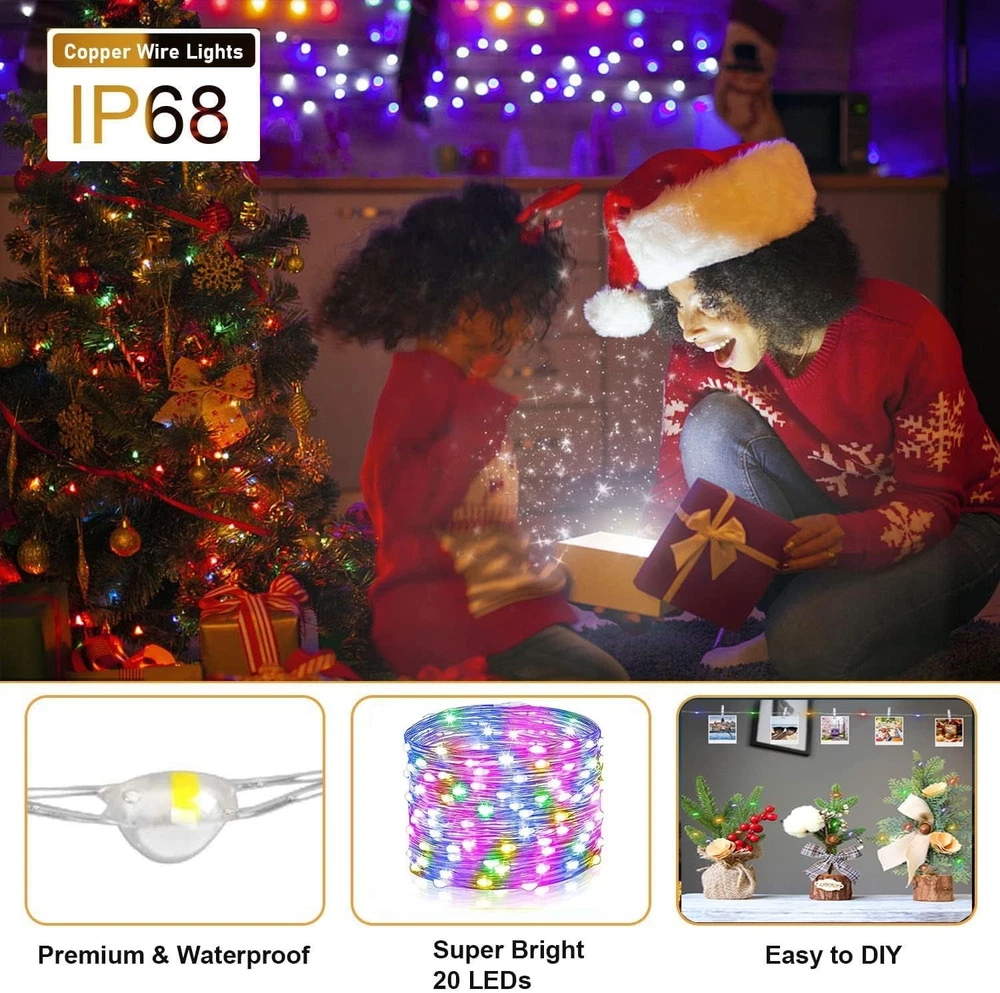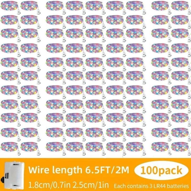 Feature: High brightness, low power consumption Energy-saving and environmentally friendly. Powered by battery (battery included) High flexibility - soft plastic rope, soft and flexible, can be wound around anywhere. Add decoration to your computer, Christmas tree and workbench, easily creating a festive atmosphere. Specification: Cable material: Copper Cable length: 2 meters Number of LEDs: 20 Color: Warm white/Multicolor Function mode: Always on Waterproof rating: IP65 Product quantity: 100 Note: Copper wire has waterproof properties. You can place it wherever you like (but the CR2032 battery compartment is not waterproof, please keep it away from water and damp environments)