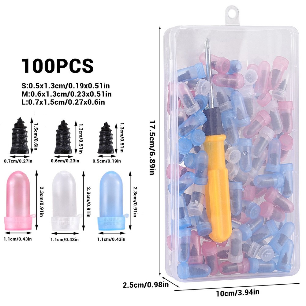 100Pcs Tire Repair Rubber Nails Tyre Puncture Repair Screws Kit with Screwdriver Product Feature ✨Durable Material: Made from rubber materials, these tire repair screws are designed to withstand high temperatures and resist aging, ensuring a long-lasting and reliable solution for your tires. ✨No Need to Remove the Tire: Unlike traditional repairs, you can fix punctures without removing the tire, saving time and making the process more convenient. ✨Great Sealing Effect: These tire repair nails offer excellent sealing properties that firmly adhere to the tire, preventing water from entering the wound and protecting the steel belt from rust and delamination. ✨Optimal Fit: These tire repair screws come in three sizes—Small (0.5 x 1.3cm), Medium (0.6 x 1.3cm), and Large (0.7 x 1.5cm)—allowing you to choose the perfect size based on the puncture size, ensuring a secure and effective repair for different tire damage types. ✨Effortless Installation: With the included screwdriver, repairing your tire is quick and easy. The thick middle thread of the screw enhances its grip, providing a strong connection between the screw and the tire without causing damage. ✨Wide Applications: Ideal for various vehicles including cars, mountain bikes, electric bikes, motorcycles, trucks, buses, and agricultural tires, offering a comprehensive repair solution for all tire types. Package Included 30 x Large Tire Repair Rubber Screws 30 x Medium Tire Repair Rubber Screws 40 x Small Tire Repair Rubber Screws 1 x Screwdriver 1 x Storage Box Product Specification Type Tire Repair Rubber Nails Kit Material Rubber Size (Small) 0.5 x 1.3cm (0.19 x 0.51in) Size (Medium) 0.6 x 1.3cm (0.23 x 0.51in) Size (Large) 0.7 x 1.5cm (0.27 x 0.6in) Repair Method No need to remove the tire to repair Application Cars, Mountain Bikes, Electric Bikes, Motorcycles, Trucks, Buses, Agricultural Tires Delivery details Payment Terms of sales Feedback Contact us Delivery details 1. BUSINESS DAY MONDAY- FRIDAY FAST SHIPPING FROM USA. 2. All orders and payments received before 4PM EST (1PM PST) will be shipped the same business day. 3. No shipping on Saturday,Sunday or USA Public Holidays 4. No responsibility for any custom duty Payment We accept payment by PayPal only. Terms of sales 1. We offer a 60 day money back guarantee or exchange. 2. Buyer pays return shipping and we pay replacement shipping. 3. If you want to initiate a return,please contact us to get a returning address before sending the item back. Feedback 1. We strive to provide the best products and services. 2. Your positive feedback 5 stars DSR help us do better. 3. If anything about your transaction did not meet expectations, please CONTACT US and give us the opportunity to make things right. We are always here to help. Contact us Please do not hesitate to CONTACT US . You can message 24/7 on eBay for all questions and inquiries. We will get back to you within one business days at the latest from Monday- Friday.