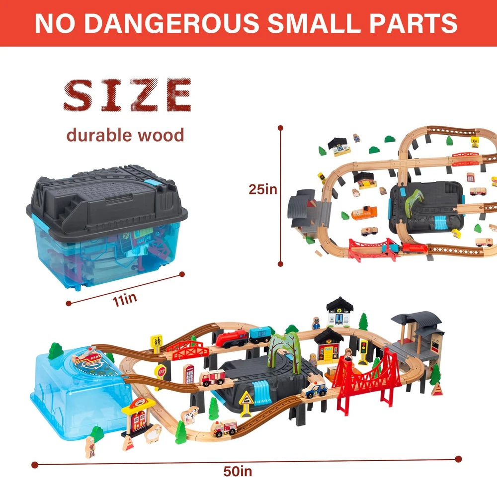 Complete Train Track Set:This 100pcs wood train set for toddlers comes with tracks, heliport, trucks, train, bridge and other accessories. can DIY assorted traffic systems by imagination and spatial logical thinking ability with this train sets for boys 3-8. Perfect for birthday gifts Christmas gifts toys. With Versatile Brands:The train set for 3 year old boys fixes various brands' car sets, such as Thomas, Brio, Melissa & Doug, IKEA, Chuggington, and many more which can be perfectly placed and run on train tracks stably to save more money. Safety: This wooden train track sets are made with beech wood which is sturdier than pine and features hand-sanded edges to better protect children during play. Best Choice: Toy train sets are easy to build and enjoy for young children, making them a smart toy during holidays or birthdays. They also come with a colorful and storage box to make them easier to or for portable play. Service : Buy with confidence. If anything happens to your train tracks for ages 3-8 within the first 12 months of owning it, we will replace them at no charge to you. This includes coverage for any issues or broken parts associated with the set.
