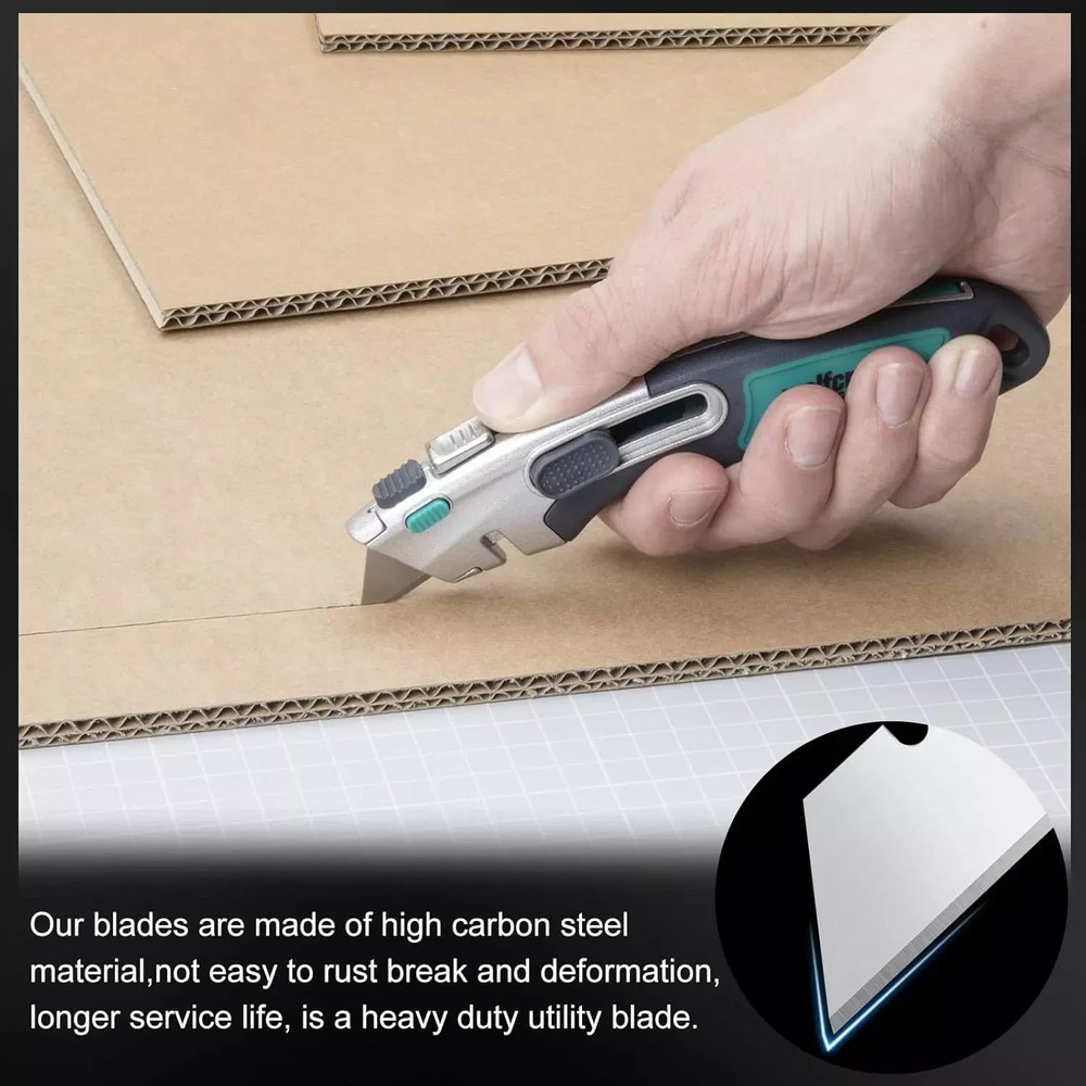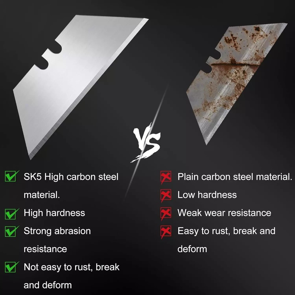 HIGH QUALITY SK5 HIGH CARBON STEEL: SK5 High carbon steel material is chosen to make razor blades utility knife blades refills high hardness and wear resistance. The excellent material makes utility blades for box cutter not easy to rust break and deform, have a longer service life, and are heavy-duty and practical utility knife blades. STANDARD BLADE REPLACEMENT: The razor blades utility knife blades refills are 1.26 inches wide at the top, 2.36 inches wide at the bottom, and 0.75 inches high. Standard size, suitable as a replacement blade for most folding knives, box cutters, and retractable knives, is a commonly used household tool. SHARP AND DURABLE: The razor blades utility knife edges are precisely sanded, polished, sharp, and durable, with good cutting performance. Use box cutter blades refills to cut quickly and the incision is smooth, great for cutting leather, rope, paper, carpet, rubber, cardboard, pipes, and more, and suitable for most DIY projects. PORTABLE PACKAGING: 100 pieces of box cutter blades refills are packed in 10 plastic storage boxes, 10 pieces in each box, convenient for daily use and carrying—enough quantity, perfect for sharing with family and friends to start your handmade creations. WARM TIP: If you encounter any problem using utility blades for box cutter, please get in touch with us immediately. We will solve the problem for you as fast as possible. In daily life, for the safety of your children, please put the razor knife blades where your children can't touch.