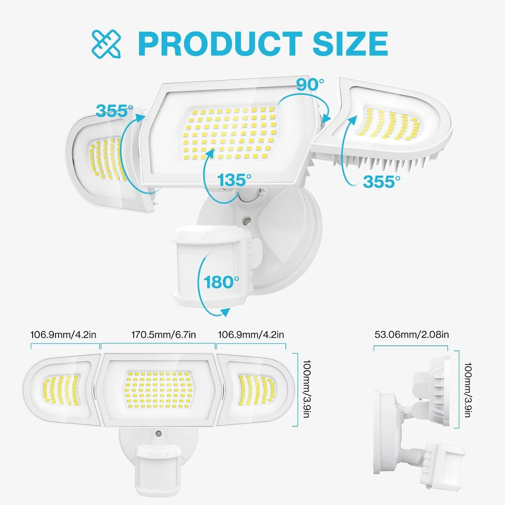Enhanced Motion Sensor: Motion sensor outdoor lights offer convenience with up to 72 ft detection range and 180° coverage. It automatically turns on for up to 10 mins when motion is detected; illuminate the pathway as you approach without manual switches Dusk to Dawn Mode: This mode allows dusk to dawn outdoor light automatically turn on at dusk and off at dawn, giving you peace of mind Versatile Lighting Modes: In addition to motion-activated and dusk to dawn modes, this flood light also offer a test mode. A Test Mode lets you confirm the light is working properly upon receipt. This mode activates the outdoor light for 5 seconds when motion is detected, both day and night Light Up Wide Coverage: This 9,000 lm motion lights for outside lights up yards, garages, driveways, and more. Its 3-headed adjustable design provides 270-degree coverage, illuminating up to 1350 square feet to enhance home security at night Easy Installation and IP65 Waterproof: This exterior motion sensor light is easy to install on ceilings and walls with simple wiring steps. Its IP65 rating makes it reliable even in rain, sleet, and snow Product Description Olafus 100W Outdoor Motion Sensor LED Flood Light Adjustable Head Lights The maximum rotatable, left and right light head 355 °, the maximum middle light head 135 °. Super Bright LED Lamp Beads 6500k super bright LED beads can illuminate 1350sq.ft, 100W ultra-low energy consumption. Heat Dissipation Die-cast aluminum for effective heat dissipation. How to Install Olafus 100W LED Security Lights Two Mount Ways 1. Mount on wall or eave/soffit. 2. Recommended Install Height: Approximate to 8.2-16.4ft. 3. Suggested Motion Sensor Head Angle: 45 degree. (PS: 90 degree will make this motion sensor flood light too sensitive. Please adjust the motion sensor head to suitable angle.) IP65 Waterproof Please note: The sensor head is IP44 and the light body is IP65. Please do not expose the sensor head to the rain to prevent the sensor head from failing. 1 Garage 2 Pathway 3 Front Yard 4 Backyard Olafus Flood Lights Brighten and Safeguard Your Home Add to Cart Add to Cart Add to Cart Add to Cart Add to Cart Add to Cart Add to Cart Customer Reviews 4.2 out of 5 stars 160 4.6 out of 5 stars 132 4.4 out of 5 stars 621 4.4 out of 5 stars 142 4.2 out of 5 stars 64 4.6 out of 5 stars 61 4.4 out of 5 stars 67 Price $79.99 $ 79 . 99 $83.99 $ 83 . 99 $43.99 $ 43 . 99 $79.99 $ 79 . 99 $109.99 $ 109 . 99 $139.99 $ 139 . 99 $46.99 $ 46 . 99 Lumen 9000 lumens 10,000 lumens 7000 lumens 6000 lumens 9000 lumens 10,000 lumens 5500 lumens Wattage 100 watts 100 watts 75 watts 65 watts 100 watts 100 watts 55 watts Light Coverage 1350 ft² 1977 ft² 1150 ft² 1150 ft² 1350 ft² 1977 ft² 1150 ft² Control Ways Motion Sensor&Dusk to Dawn Motion Sensor&Dusk to Dawn Motion Sensor&Dusk to Dawn Motion Sensor Motion Sensor&Dusk to Dawn Motion Sensor&Dusk to Dawn Motion Sensor&Remote Control Waterproof Rating IP65 IP65 IP65 IP65 IP65 IP65 IP65 Color Temperature 6500K 6500K 6500K 6500K 6500K 6500K 6500K Power Source Hard Wired Electric Hard Wired Electric Hard Wired Electric Hard Wired Electric Hard Wired Electric Hard Wired Electric Hard Wired Electric Feature 3 Adjustable Heads 5 Adjustable Heads 3 Adjustable Heads 3 Adjustable Heads 3 Adjustable Heads 5 Adjustable Heads 3 Adjustable Heads&Remote