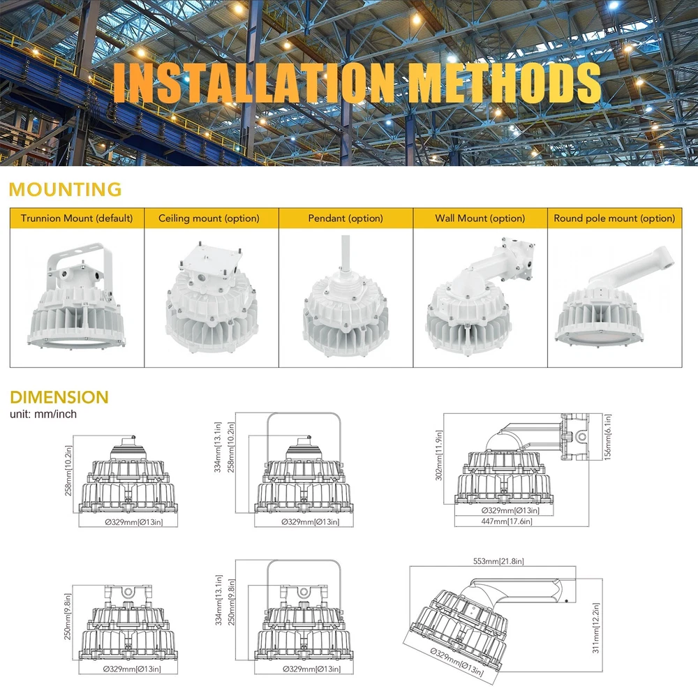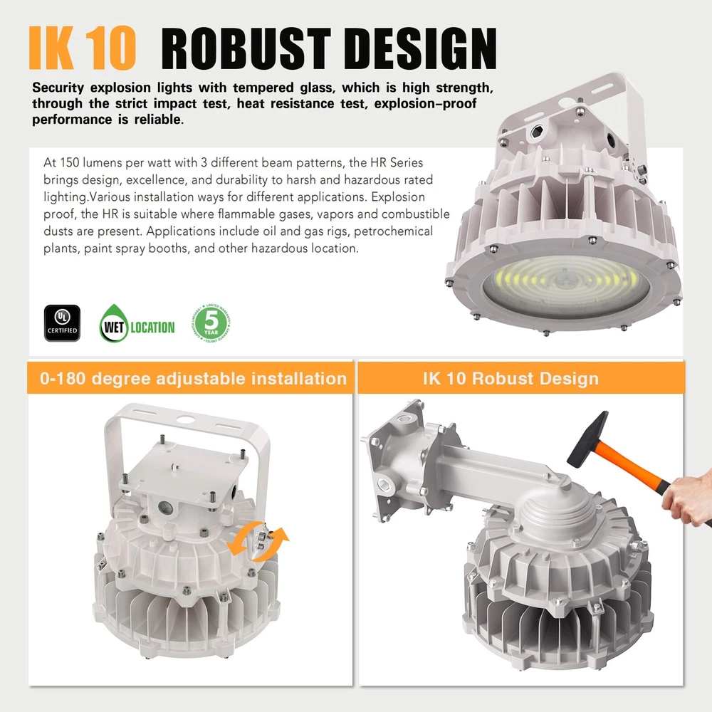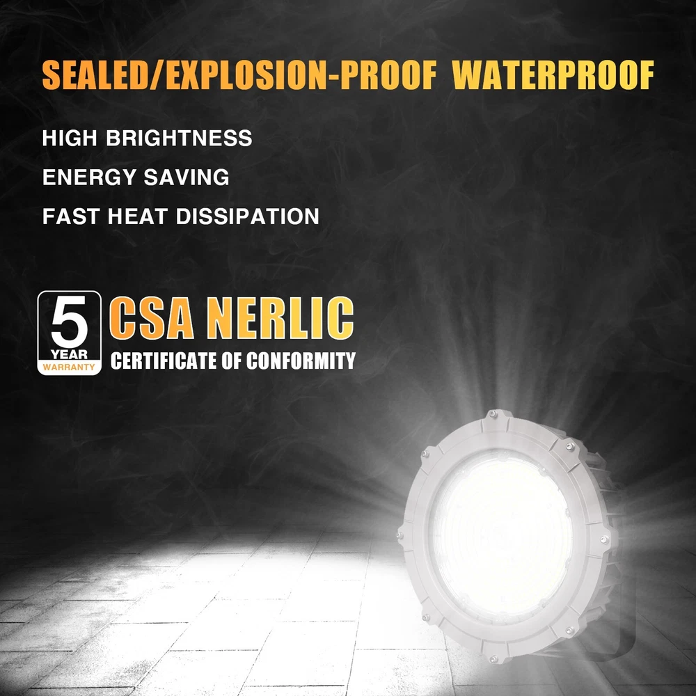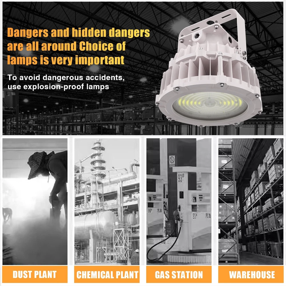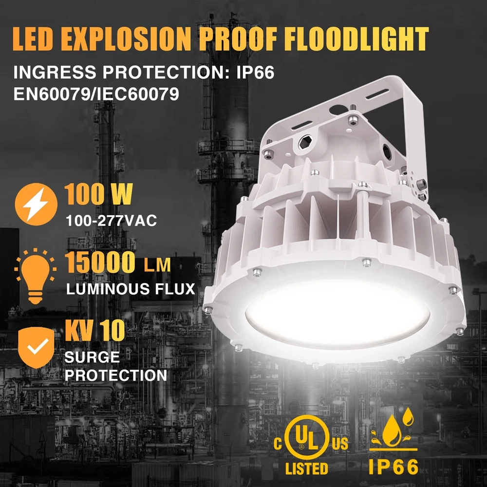 Led Explosion Proof Light Fixture 100W 15000 Lumens AC110-277V 5000K IP66 C1D2 ETL UL Listed Description: Feature: ● High Quality and Durable: Robust cast aluminum housing with low copper, content with stands harsh or hostile environments. Resistant to shock and vibration, withstand higher impacts and vibrations, with strong durability ● Efficient Heat Dissipation: Precise number of fins dissipate maximum amount of heat. ● Long Lifespan: Estimated 50,000-hour LED lifespan based on IES LM-80 results and TM-21calculations. Rugged construction ensures long-life and safe operation. ● Wider Applicability: Led Ex Proof Lighting is suitable for various dangerous places, such as oil fields, refineries, chemical plants, etc. ● Warranty: We provide 5 years warranty. Optics: ●Three distributions available to maximize versatility:60°,90°,120° ●Scalable Lumen Packages from 10,000 to 30,000 Lumens. ●Lenses made of pc will not discolor or shatter, chip or break. ●Highly engineered LED system ensures superior uniformity and maximizes spacing. ●Optics is precisely designed to shape the distribution,maximizing eficiency and application spacing. LED Module: ●Single CCT 3000K, 4000K,5000K,5700K are available for standard version. Electrical: ●Universal 120-277 VAC or 347-480 VAC input voltage. ●0-10V/PWM/Rx 3-in-1 Dimming ●Both drivers have a power factor >90%, THD <20%. ●Operating Temperature Range:-40℃-+65℃ Installation: ●Trunnion mount (default) Certifications: ●UL Listed to US and Canadian Standards. ●Suitable for use in hazardous locations. Widely Applications: This luminaire can be used as flood light, wall pack and area light which can provide general illumination in hazardous locations, such as: Oil refineries and Gas station, Oil and gasoline loading dock, Distilleries, Painting manufacturing plant, Pumping station, Mine, and Other high humility, high temperature, dusty location. Oil and Gas industry: All petroleum production and refining、Petroleum loading and transportation、Petroleum storage and retail、LNG industry、All mining operations and service Chemical industry: All types of painting facilities、Chemical production and storage Ocean, marine and aerospace field: Ocean platform operation facilities and structure、Aerospace clean room and production、Ocean vessel operations Metal treatment: Steel and aluminum factories、Pumping stations in any environment、Metal smelting, foundry and manufacturing Food and alcohol industry: Flour and fine particle production and storage、Food and distilling production、Alcohol industry Other:Other high humidity, dust, high temperature, vapor locations Note: 1. Actual performance may differ as a result of end-user environment and application. 2. All values are design or typical values, measured under laboratory conditions at 25°℃(±5°C) specifications subject to change without notice. Rating and Certificates: Class l,Division ll Class ll,Division I Materials: ● Housing : Die-Casting Aluminum ● Diffuser: Tempered glass ● Bolts: Stainless Steel ● Mounting Braket: Stainless steel About Okaybulk: Okaybulb Distribution is a very big Distribution and wholesaler in the circle of LED Lamps which are produced in China Factory and sold to End Customer directly online. Okaybulb.com is the bridge between China factory and end user (Customer) and we sell LED Bulb from Factory China directly, without middle man. We are online LED Bulb Shopping distribution. Internet-based Okaybulb.com has seen astounding growth, quickly becoming a force to be reckoned with in the lighting industry, garnering multiple awards and a loyal, satisfied customer base that continues to grow. Beginning with only two employees, the company now employs more than 100 peoples. At Okaybulb.com , customers are our highest priority, and the unwavering commitment we have toward them is evident in our customer testimonials. What truly sets us apart isn’t just the excellent customer service, but the combination of an easy purchasing experience and highly competitive, market driving prices. In addition, our vast inventory of products includes commercial and residential lighting of the highest quality. Whether the situation calls for Christmas lights during the holidays, LED bulbs in your bedside lamp, or even the led corn bulb,led corn light,metal halide led replacement, E40 LED etc .that line your neighborhood, our products and brands are all hand-picked. From the White House to your house, Okaybulb.com is committed to providing simple and efficient lighting solutions to everyone. Have questions about a particular bulb? Rest easy. Our knowledgeable, dedicated team of product specialists have years of lighting experience. From answering questions about lumens, color temperature, or base types, our product specialists are ready to solve your lighting dilemma. We also do have very big Sales team can support Aftersales service. On Nov 11, 2024 at 02:26:16 PST, seller added the following information: On Nov 11, 2024 at 17:38:11 PST, seller added the following information: On Nov 12, 2024 at 05:18:16 PST, seller added the following information: