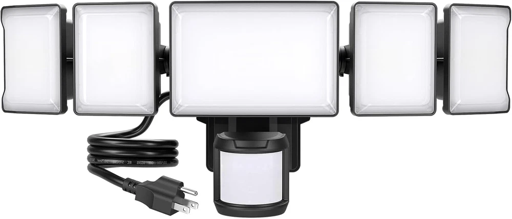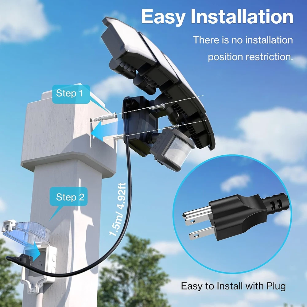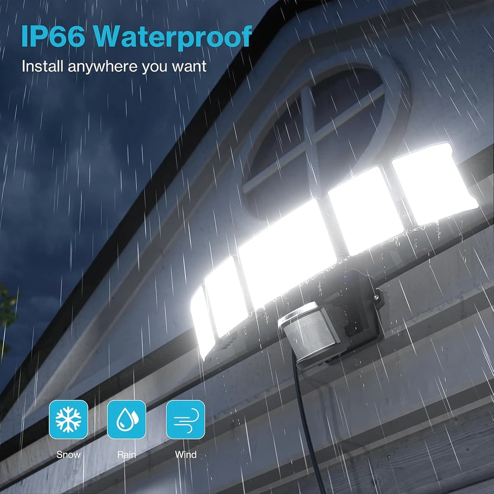Super Bright & Energy Saving: 100 W outdoor LED flood light features 168 high-quality LED units, providing an impressive brightness of 10,000 lumens; It also saves over 80% on your electricity bill compared to a 500 W traditional halogen lights Plug and Play: This plug in motion sensor outdoor light is easy to install and power on with your outlet. No hardwire or junction box needed. It could be mounted on wall or eave with screws(included) Adjustable Motion Sensor: Easily change sensor range, Weak light brightness and time of sensor; The motion security light has up to 72 ft detection range, the stepless adjust timer can be set for tests modes or 10-600 s duration 4 Lighting Modes: Test Mode, Dusk to Dawn mode, Motion Sensor mode and Weak light Mode. Weak light mode allows light turn on at night and stay on 10%-30% brightness, turn to full bright if motion detected; You can freely switch modes to meet your diverse needs by swivel button Wider Illumination Range: Equipped with 5 adjustable heads, this flood light can be angled to suit your specific needs. Customize 360° beam angle, provides a wider lighting coverage, illuminating an area of up to 1977 ft² with ease. Optically designed filter, the light is softer and anti-glare, protecting the eyes of your family IP65 Waterproof: Plug in security light performs well in outdoor environment, like garage, deck, barn, backyard, porch, and front of house; Floodlights are reliable even in rain and snow Product Description More Information about Olafus Plug in Motion Sensor Outdoor Lights High Brightness The motion detector flood light can produce 10000 lumen of bright, cover 1977ft² area 5 Adjustable Lights 355° up and down, 90° side to side, reach 360° no dark gaps. Floodlight is directed to anywhere needed and easy to customize light coverage. Effective Heat dissipation The plug in flood light is made of die-cast aluminum and fin type structure, effective in dissipation. Ip65 Waterproof Plug in security light performs well in outdoor enviromnent and works noramlly even in rainy or snowy day. Easy to Install and No Electrician Needed Easy installation 4.92FT Cord 1 Motion Sensor Mode 2 Dusk to Dawn Modes 3 Weak Light Mode Wall Mount Eave Mount Garage Backyard Yard Swimming Pool Why does the flood light always on during the day? In test mode, turn on the dim mode and the light will stay on (10%~30% brightness) during the day. This function is to test whether each function of the floodlight is working properly. How to make the flood light turn off during the day? Please exit the test mode. (Turn button 1 counterclockwise to exit test mode)