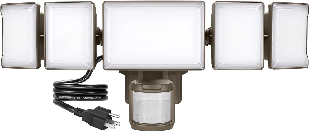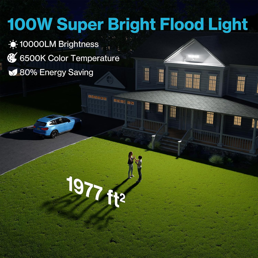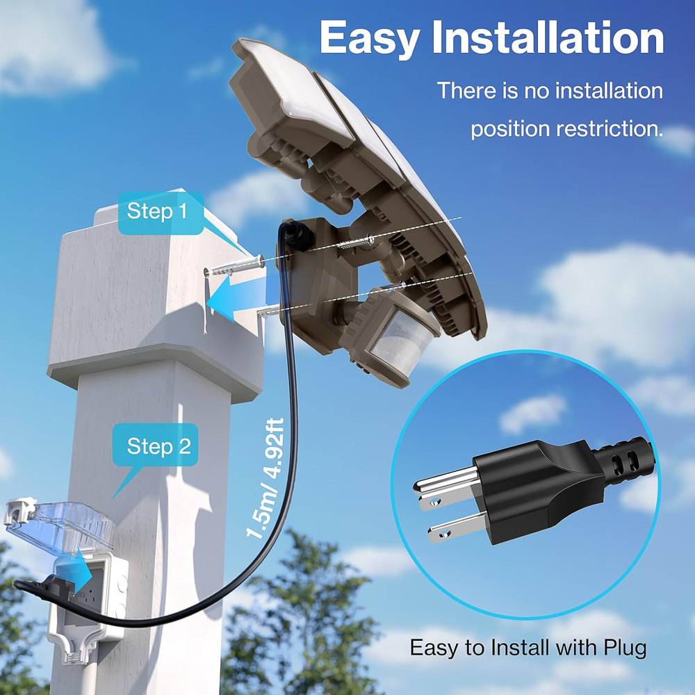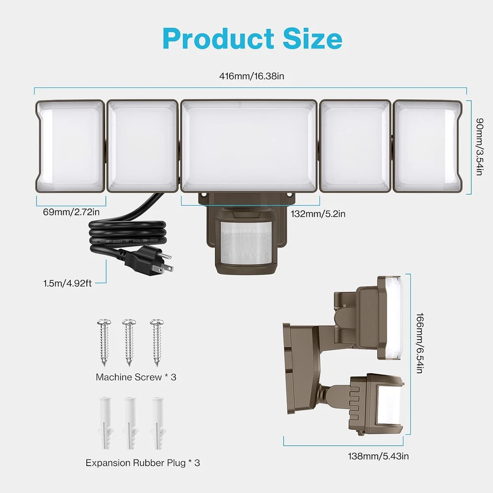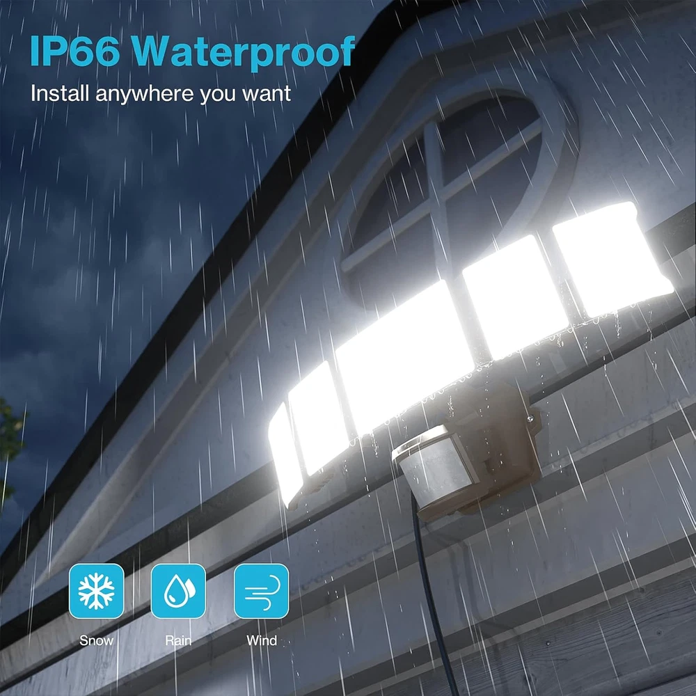 Super Bright & Energy Saving: 100 W outdoor LED flood light features 168 high-quality LED units, providing an impressive brightness of 10,000 lumens; It also saves over 80% on your electricity bill compared to a 500 W traditional halogen lights Plug and Play: This plug in motion sensor outdoor light is easy to install and power on with your outlet. No hardwire or junction box needed. It could be mounted on wall or eave with screws(included) Adjustable Motion Sensor: Easily change sensor range, Weak light brightness and time of sensor; The motion security light has up to 72 ft detection range, the stepless adjust timer can be set for tests modes or 10-600 s duration 4 Lighting Modes: Test Mode, Dusk to Dawn mode, Motion Sensor mode and Weak light Mode. Weak light mode allows light turn on at night and stay on 10%-30% brightness, turn to full bright if motion detected; You can freely switch modes to meet your diverse needs by swivel button Wider Illumination Range: Equipped with 5 adjustable heads, this flood light can be angled to suit your specific needs. Customize 360° beam angle, provides a wider lighting coverage, illuminating an area of up to 1977 ft² with ease. Optically designed filter, the light is softer and anti-glare, protecting the eyes of your family IP65 Waterproof: Plug in security light performs well in outdoor environment, like garage, deck, barn, backyard, porch, and front of house; Floodlights are reliable even in rain and snow Product Description More Information about Plug in Motion Sensor Outdoor Lights High Brightness The motion detector flood light can produce 10000 lumen of bright, cover 1977ft² area 5 Adjustable Lights 355° up and down, 90° side to side, reach 360° no dark gaps. Floodlight is directed to anywhere needed and easy to customize light coverage. Effective Heat dissipation The plug in flood light is made of die-cast aluminum and fin type structure, effective in dissipation. IP65 Waterproof Plug in security light performs well in outdoor enviromnent and works noramlly even in rainy or snowy day Easy to Install & No Electrician Needed Easy installation 4.92FT Cord 1 Motion Sensor Mode 2 Dusk to Dawn Modes 3 Weak Light Mode Wall Mount Eave Mount Garage Backyard Yard Swimming Pool