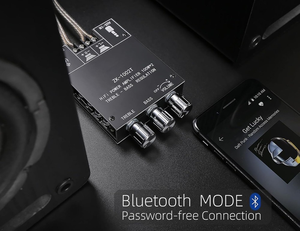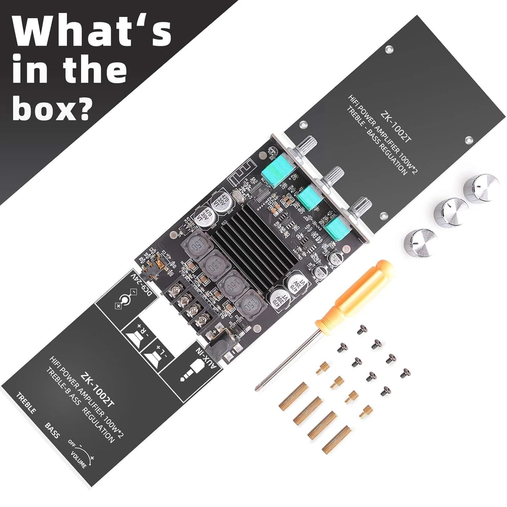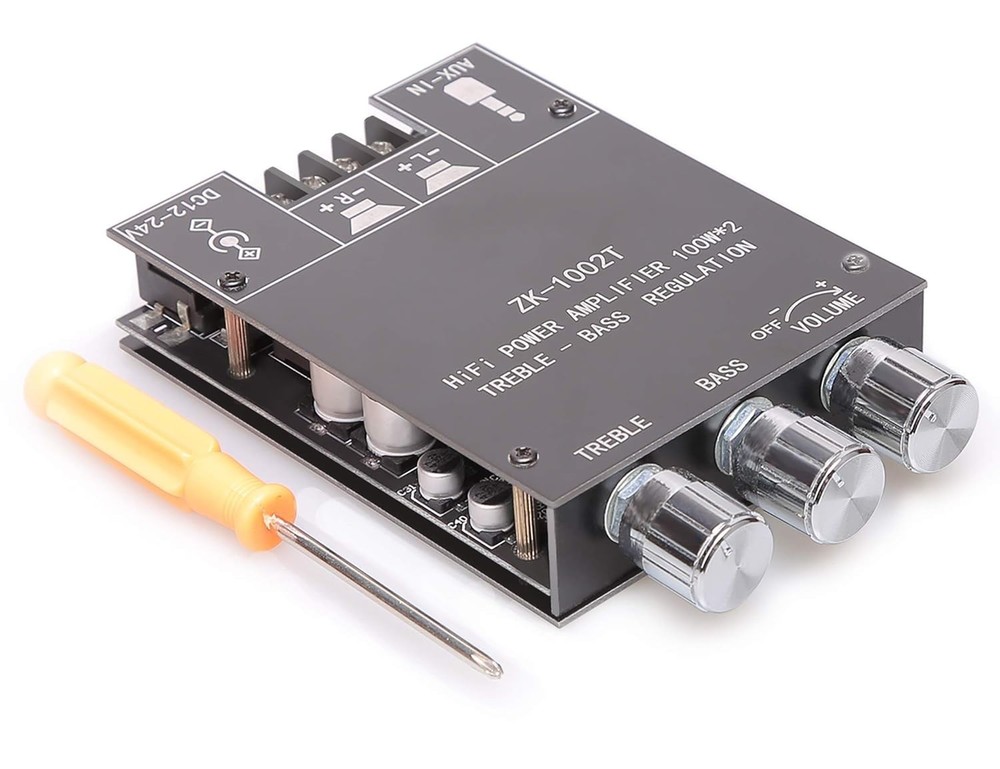 100W+100W Bluetooth Amplifier Board with Treble & Bass Control for DIY Speakers ‹ › ‹ › ‹ › ‹ › ‹ › ‹ › ‹ › ‹ › ‹ › ‹ › 100W + 100W Bluetooth Amplifier Board Elevate your audio experience with our cutting-edge 100W + 100W Amplifier Board, designed for DIY enthusiasts looking to create wireless speakers that deliver rich, immersive sound. Product Features: Treble & Bass Control: Tailor your soundscape! Adjust high and low frequencies to create a theater-like atmosphere for movies or music. BT and AUX Functionality: Enjoy seamless connectivity with Bluetooth 5.0, offering a transmission distance of up to 49 feet in open spaces. Additionally, connect via AUX with a 3.5mm headphone plug if your device lacks Bluetooth. Robust Safety Features: Equipped with overheat protection, circuit protection, and mechanisms to guard against over-voltage and under-voltage scenarios, ensuring safe and reliable operation. Outstanding After-sales Service: Customer satisfaction is our priority! Our dedicated service team is available 24/7 for any inquiries or quality concerns, ensuring you receive the support you deserve. Power Adapter Included: Comes with a 19V 4.74A power adapter for easy setup and operation. Specifications: Input Mode: AUX/Bluetooth Max Power Output Per Channel: 100W + 100W Recommended Speaker Parameters: 20-200W (4-8Ω) Working Voltage: DC 12-24V Heat Sink Dimensions: 36 * 25 * 10 mm Why Choose Our Amplifier Board? Transform your audio setup with a seamless blend of power and precision. Whether for movie nights or music sessions, the adjustable treble and bass controls let you mold sound to perfection. Its robust safety features add peace of mind while enjoying your favorite tunes. With convenient Bluetooth connectivity and the option for wired input, this amplifier board epitomizes versatility and quality. Ready to amplify your sound experience? Order your 100W + 100W Bluetooth Amplifier Board today and embark on a journey of audio excellence! Shipping Free & Fast Shipping - We offer free shipping to most of the USA with a normal delivery time of 3-7 days. However, due to the current situation, additional delivery time (up to 3 weeks) may be required for some items. Alternative Carriers - We may use alternative carriers (e.g. USPS, FedEx, UPS, etc.) to ensure your package arrives safely and on time. Due to the use of multiple carriers, we are unable to provide a tracking number automatically. Handling Time - Orders are processed and shipped within 1-2 business days of receiving cleared payment. Shipping Restrictions - Shipping to Alaska, Hawaii, Puerto Rico, Guam, and other US territories may incur shipping charges or delivery restrictions. Please contact us before ordering, or your order can be refunded/cancelled. State Restrictions - There may be restrictions based on your state of purchase. For example, certain items may not be shipped to California due to state regulations. Contact for Tracking Updates - If you require tracking updates or have any concerns about the delivery of your order, please feel free to contact us, and we will be happy to assist you. Return 30-Day Hassle-Free Returns - We want you to be completely satisfied with your purchase. If you are not, you can return the item within 30 days of receiving it for a full refund or exchange. Easy Return Process - To start a return, simply contact us and we will provide you with a prepaid return shipping label and detailed instructions. Restocking Fee - There are no restocking fees for returns. However, the buyer is responsible for return shipping costs if the return is not due to a seller's error. Refund Processing Time - Refunds will be processed within 5 business days of receiving the returned item in its condition. Payment We accept all major credit cards, PayPal, and Apple Pay for your convenience. Your payment information is secure and encrypted to ensure a safe and seamless transaction. Please complete your payment within 3 days of purchase to avoid any delays in shipping. Feedback Your feedback is extremely important to us. We strive to provide the best products and customer service possible. If you are satisfied with your purchase, please take a moment to leave us a positive review. If you have any concerns or issues with your order, please contact us before leaving negative feedback. We are committed to resolving any problems and ensuring your satisfaction. Contact Us If you have any questions or concerns, please feel free to out to our customer support team. You can contact us through the eBay messaging system. We are available Monday to Friday, 9:00 am to 5:00 pm EST, and we will do our best to respond to your inquiry within 24 hours. Buy it now and enjoy a pleasant shopping experience! Unit Quantity: 100 Compatible Brand: Amplifier Board Features: Amplifier,Bluetooth,AUX,Treble Control,Bass Control,Overheat Protection,Circuit Protection,Over-voltage Protection,Under-voltage Protection,Heat Dissipation,After-sales Service,Bluetooth 5.0,AUX Input Compatible Model: ZK-1002T Type: DIY Amplifier Kit Color: Black Unit Type: Unit Amplifier Class: AB