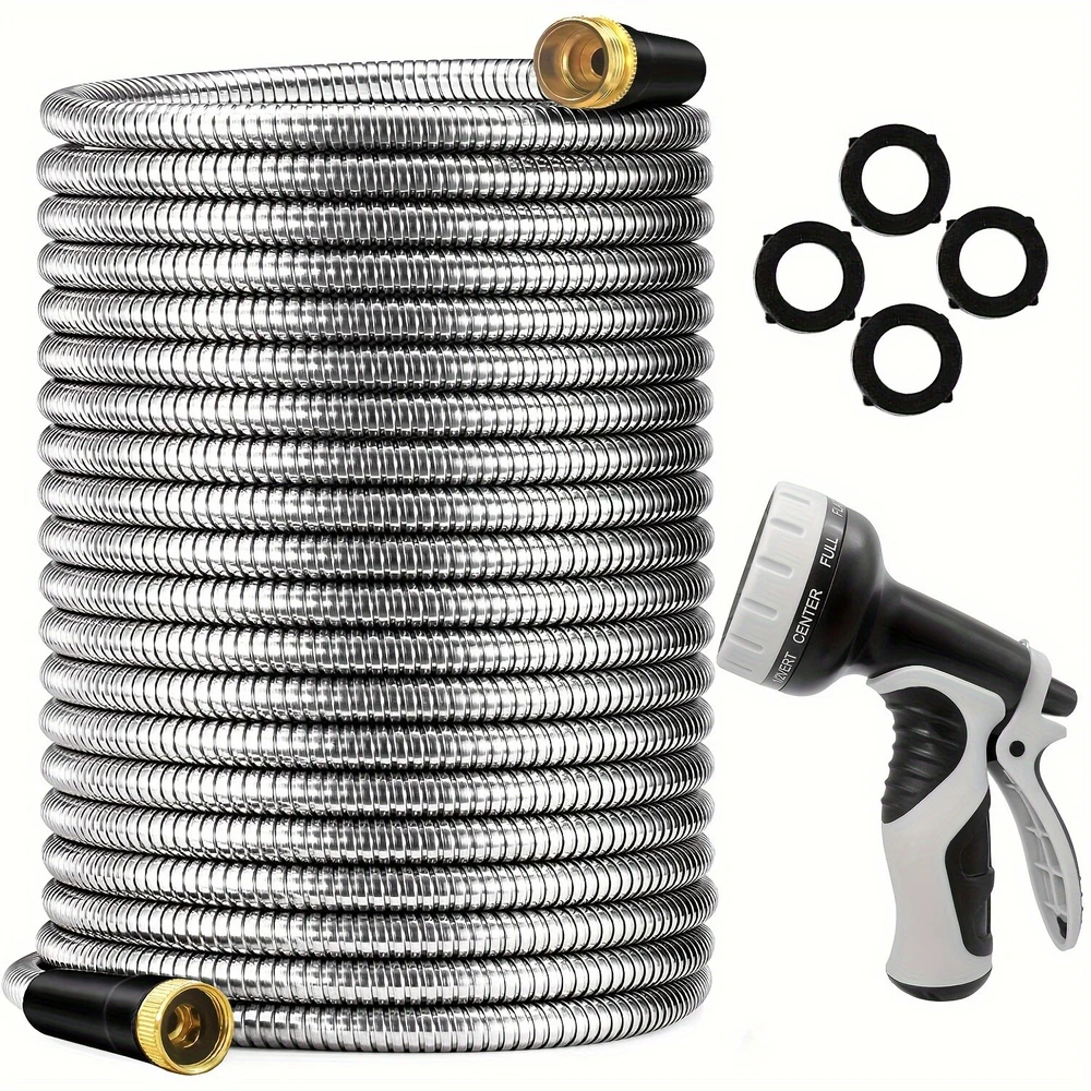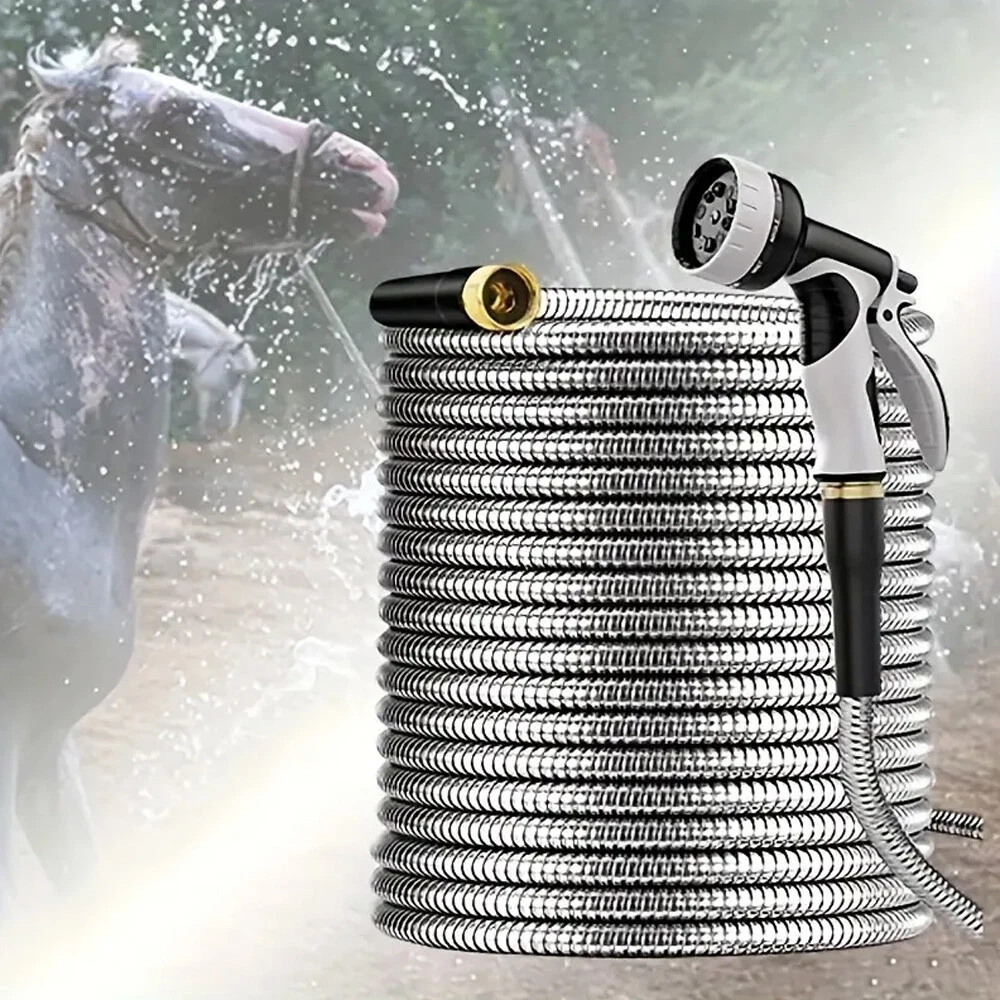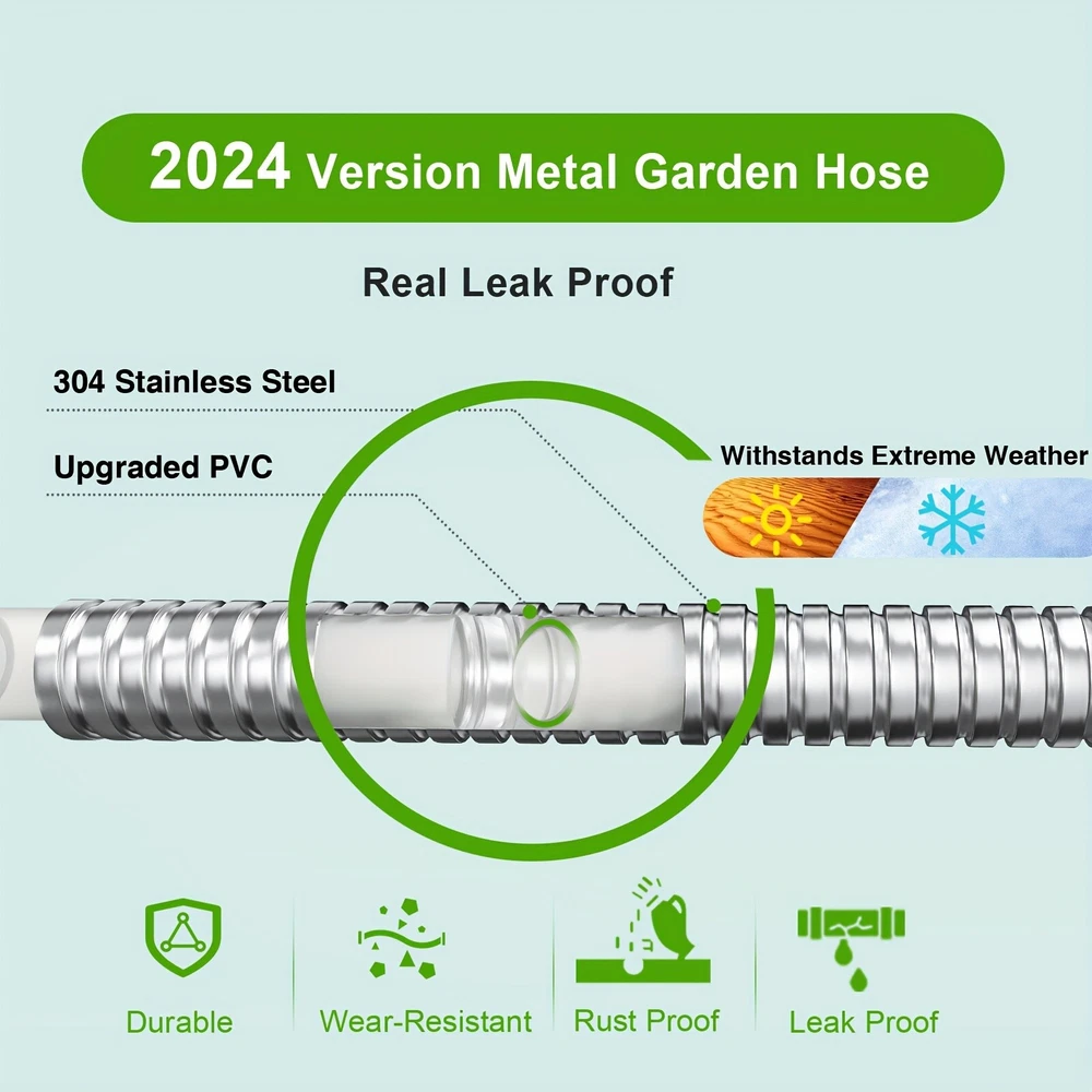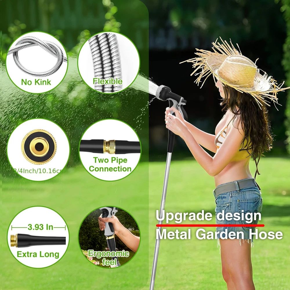 ✨Specification: Material: Stainless Steel Type: Water Gun Characteristics: outdoor metal hose items length Color: silver Item length:100 ft Item weight: 3.87 pounds ✨Features: 【Metal Garden Hose 100FT】- The 100ft metal water hose is encased in 304 stainless steel, providing effective protection against punctures from sharp objects or bites from pets. The metal water hose can also operate efficiently in both high and low temperatures, ensuring a longer service life for the water hose. Bid farewell to the annual ritual of water hose shopping and say hello to savings. 【Real Leak Proof】 - Featuring a dependable brass connector, built-in leak-proof rubber ring, this metal garden hose ensures a secure, leak-free connection to your water source.The 3/4-inch Anti-leak Connector is designed to fit typical outdoor garden taps in the US. It not only connects different joints but also allows you to join two hoses together to extend the hose's length. 【Flexible and Maneuverable】 - Our Metal Garden Hose 100ft is crafted to be lightweight and exceptionally flexible, Can be used for watering gardens and cleaning houses, cars, yards, pet bathrooms, and so on. Additionally, 100ft hose is the most popular size option and can easily cover your entire yard. 【Water Saving and Plant Friendly】- The 100ftmetal hose comes with a 10-pattern hose nozzle. You can freely control the spray mode to adjust the water flow size. The gentle water flow won't harm plants. 📦Package Includes: 1X Hose With Nozzle Set On Sep 20, 2024 at 23:01:17 PDT, seller added the following information: On Sep 23, 2024 at 07:20:55 PDT, seller added the following information:
