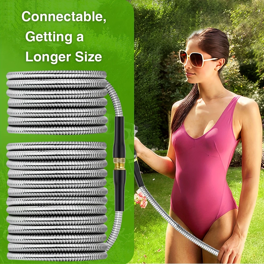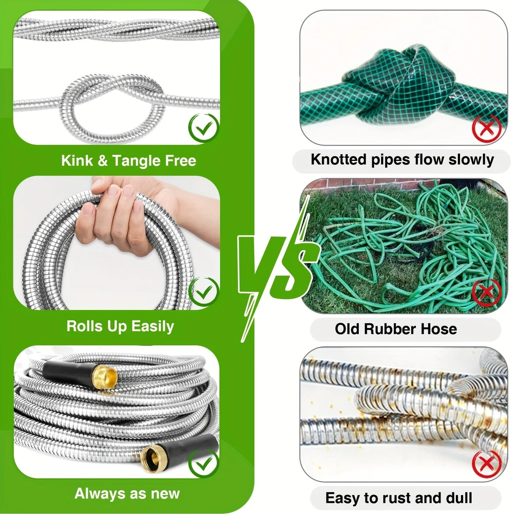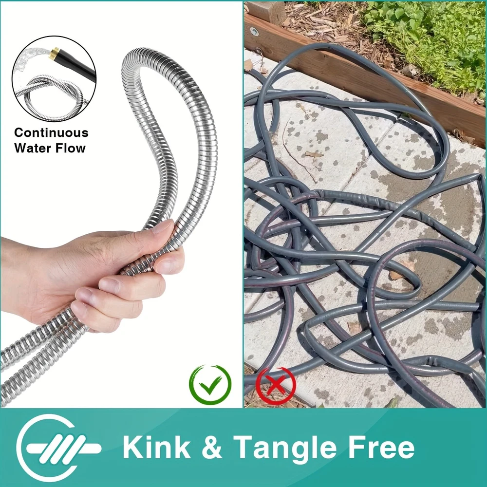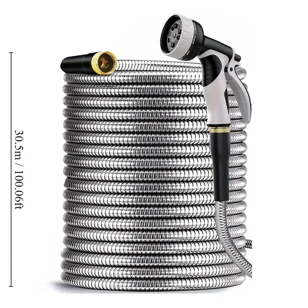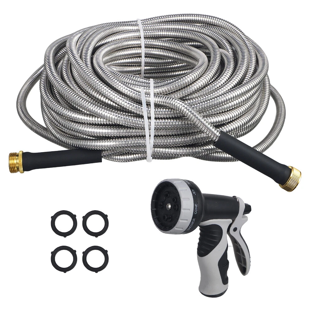 ✨Specification: Material: Stainless Steel Type: Water Gun Characteristics: outdoor metal hose items length Color: silver Item length:100 ft Item weight: 3.87 pounds ✨Features: 【Metal Garden Hose 100FT】- The 100ft metal water hose is encased in 304 stainless steel, providing effective protection against punctures from sharp objects or bites from pets. The metal water hose can also operate efficiently in both high and low temperatures, ensuring a longer service life for the water hose. Bid farewell to the annual ritual of water hose shopping and say hello to savings. 【Real Leak Proof】 - Featuring a dependable brass connector, built-in leak-proof rubber ring, this metal garden hose ensures a secure, leak-free connection to your water source.The 3/4-inch Anti-leak Connector is designed to fit typical outdoor garden taps in the US. It not only connects different joints but also allows you to join two hoses together to extend the hose's length. 【Flexible and Maneuverable】 - Our Metal Garden Hose 100ft is crafted to be lightweight and exceptionally flexible, Can be used for watering gardens and cleaning houses, cars, yards, pet bathrooms, and so on. Additionally, 100ft hose is the most popular size option and can easily cover your entire yard. 【Water Saving and Plant Friendly】- The 100ftmetal hose comes with a 10-pattern hose nozzle. You can freely control the spray mode to adjust the water flow size. The gentle water flow won't harm plants. 📦Package Includes: 1X Hose With Nozzle Set On Sep 20, 2024 at 23:01:17 PDT, seller added the following information: On Sep 23, 2024 at 07:20:55 PDT, seller added the following information: