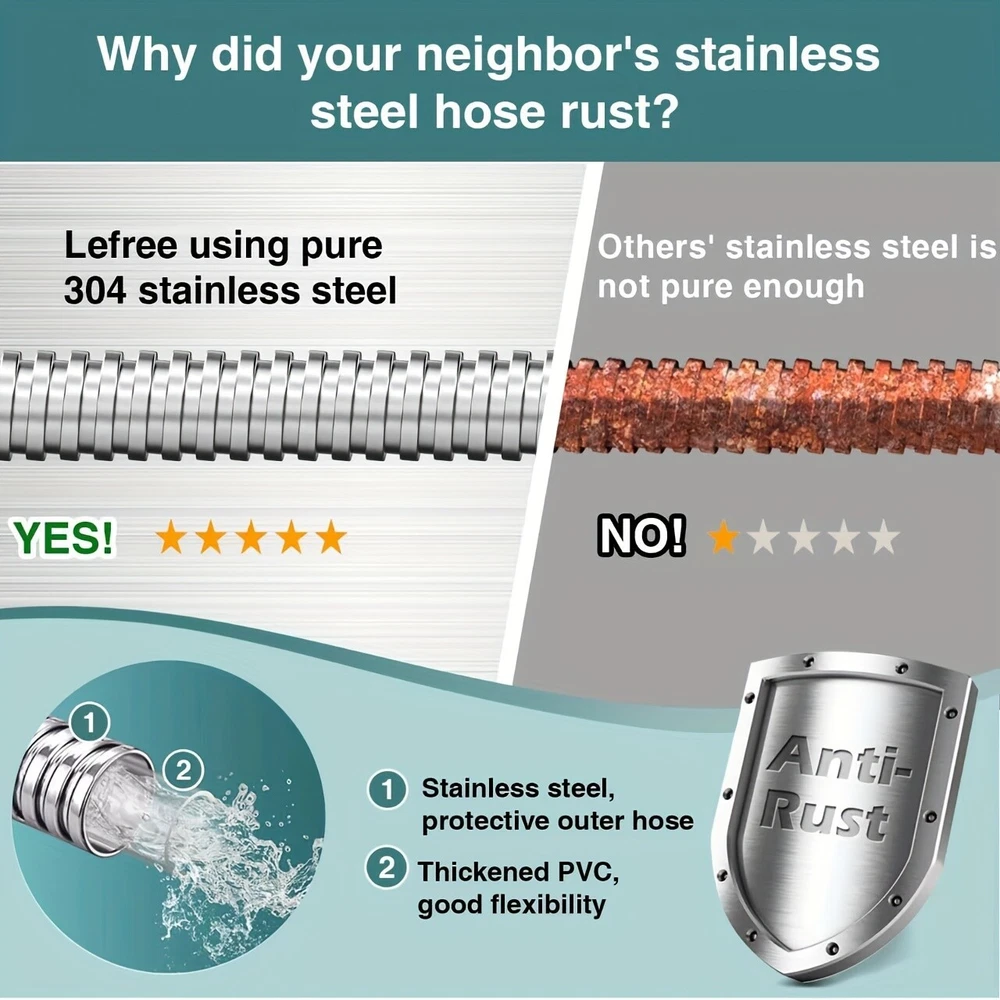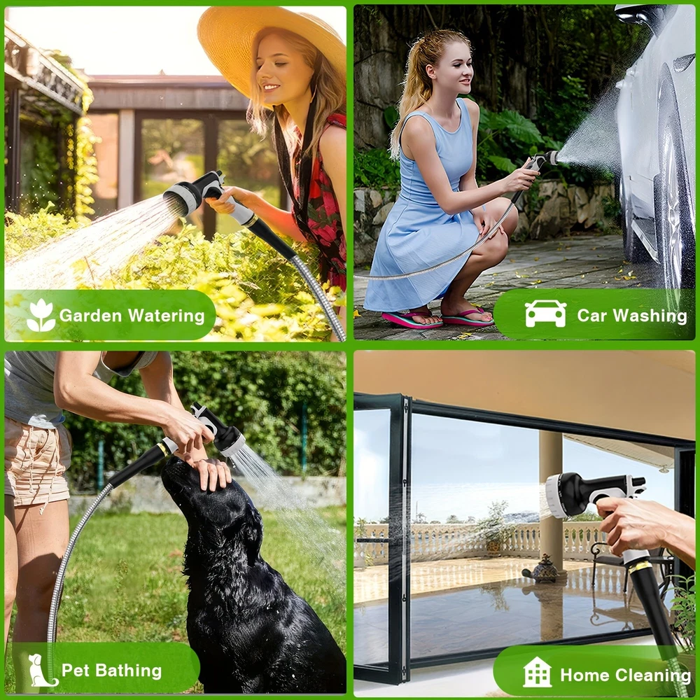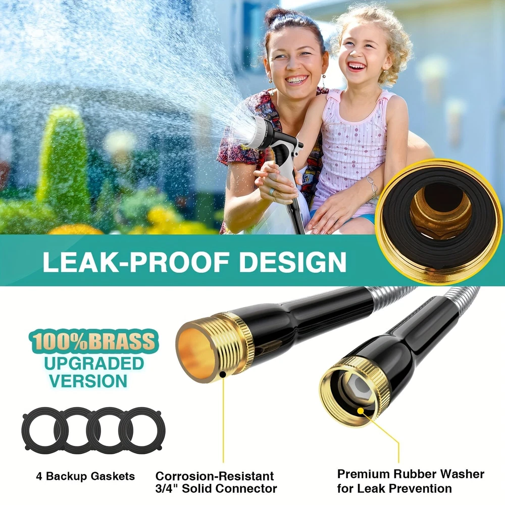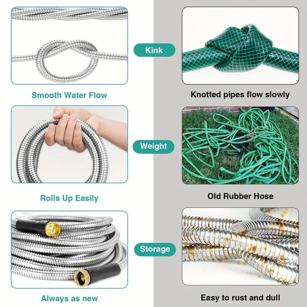 ✨Specification: Material: Stainless Steel Type: Water Gun Characteristics: outdoor metal hose items length Color: silver Item length:100 ft Item weight: 3.87 pounds ✨Features: 【Metal Garden Hose 100FT】- The 100ft metal water hose is encased in 304 stainless steel, providing effective protection against punctures from sharp objects or bites from pets. The metal water hose can also operate efficiently in both high and low temperatures, ensuring a longer service life for the water hose. Bid farewell to the annual ritual of water hose shopping and say hello to savings. 【Real Leak Proof】 - Featuring a dependable brass connector, built-in leak-proof rubber ring, this metal garden hose ensures a secure, leak-free connection to your water source.The 3/4-inch Anti-leak Connector is designed to fit typical outdoor garden taps in the US. It not only connects different joints but also allows you to join two hoses together to extend the hose's length. 【Flexible and Maneuverable】 - Our Metal Garden Hose 100ft is crafted to be lightweight and exceptionally flexible, Can be used for watering gardens and cleaning houses, cars, yards, pet bathrooms, and so on. Additionally, 100ft hose is the most popular size option and can easily cover your entire yard. 【Water Saving and Plant Friendly】- The 100ftmetal hose comes with a 10-pattern hose nozzle. You can freely control the spray mode to adjust the water flow size. The gentle water flow won't harm plants. 📦Package Includes: 1X Hose With Nozzle Set On Sep 20, 2024 at 23:01:17 PDT, seller added the following information: On Sep 23, 2024 at 07:20:55 PDT, seller added the following information:
