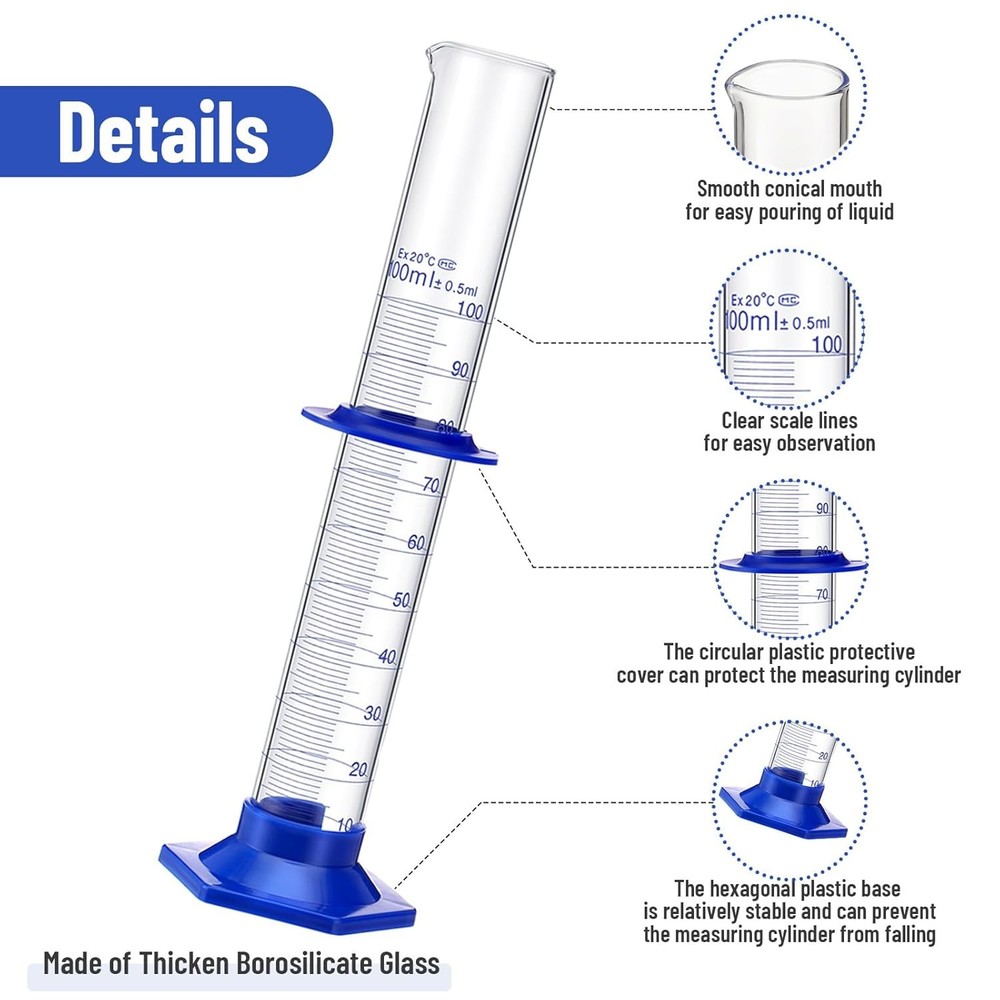 DESCRIPTION PAYMENT SHIPPING RETURN POLICY CONTACT US Shop Category Store Home Other Hot Item Lab Manual Hand Vacuum Pump Lab Hand-held Vacuum Pump Pressure Suction Pumps USD 23.99 10Pcs 60mm Glass Petri Dishes with Lids Autoclavable Lab Petri Plates Reusable USD 18.99 buchner funnel filtering kit vacuum filter flask set with 1000ml filter bott USD 42.99 50Pcs Microscope Slides Concave, Single concave Glass Slide for Wet Specimen US USD 13.99 Microscope Stage Micrometer Calibration Slide 0.01mm with 4 Scales USD 12.99 Delivery New List Item 12xWide Mouth Liquid Culture Lids,Plastic Mason Jar Lid with 0.22Um PTFE Syringe USD 18.99 Mushroom Liquid Culture Lids w/ Rings Rust-Resistant Stainless Steel, Wide Mouth USD 21.99 5x100ml Glass Measuring Cylinder Set Chemistry Lab Graduated Measure Tools+Brush USD 25.99 100pcs 250ul Vial Inserts Glass Conical Base Micro-Insert for 2ml 9-425 Vials USD 16.99 5Ml Clear Glass Vials-1-1/2 Dram Amber Glass Headspace Vials with Plastic-Alumin USD 24.99 Help & Info Payment Policy Shipping Policy Return Policy FAQ About Us 100ml 3.3 Borosilicate Glass Graduated Cylinder, Round Base Measuring Cylinder Feature: This Glass Measuring Cylinder with Perfect design,shatter-proof:Different from other glass cylinder, this lab cylinder with plastic base and bumper guards which can anti-falling at maximum extent. The Measuring Cylinders are Made From Thicken 3.3 borosilicate glass: 2mm thick glass cylinder wall,which with better heat resistance and longer use time. The Gratuated Cylinder with Excellent chemical resistance: Can be used as a reaction container for strong acid and alkali. The Lab Cylinders with Clear reading lines: Molded-in graduation lines on the back of the cylinders ensure easier, more accurate fluid level readings. The Glass Cylinders Come with one cylinder brush: the package come with one cylinder brush, the cylinder can be used again after clean up. Package Included: 5x Measuring Cylinder+1x Brush Item Specifics Brand : Creahub Intended Use/Discipline : Biological Laboratory Material : Borosilicate Glass Model : 100ml Measuring Cylinder Feature 1 : Heat resistance Feature 2 : Widely applicable Feature 3 : Accurate measurement Feature 4 : Easy to Use Volume : Volume Custom Bundle : No Diameter : 2.8cm/1.linch High : 24cm/9.45inch Package included : 5pcs Measuring Cylinder, 1pc Brush Payment A dditional shipping fee may be charged for buyers from Puerto Rico, Hawaii, Alaska, Guam, and the U.S. military address of the United States or other remote area (zone 8-10). Most of the items come with a 30-day warranty covering manufacturing defect. High value products would get a longer warranty, some of them up to 2 year or 5 years or lifetime warranty, excluding any damage by the user. Shipping Ship from: California USA or KY Warehouse Or IL warehouse Or NY Warehouse. US: about 1-6 business days; Note:Please leave us your detailed valid street address because big package is not allowed to be stored in PO.BOX. Returns 1)Buyers are responsible for the item return shipping fee. 2) Please note that all return must be pre-approved by our co-worker,and it have a return merchandise anthorization(RMA)number.Unauthorzed return will not be accepted. Contact Us 1) We greatly appreciate your Five Stars Positive feedback. It means a lot to us. Thanks for your support. 2) You can bookmark our store for your next purchase All right reserved.