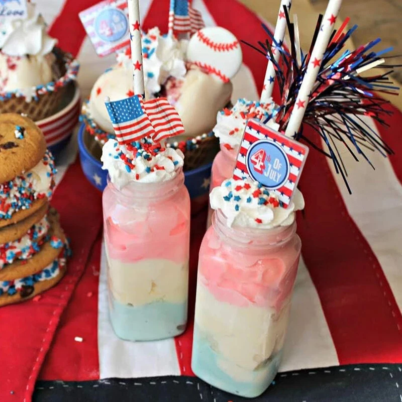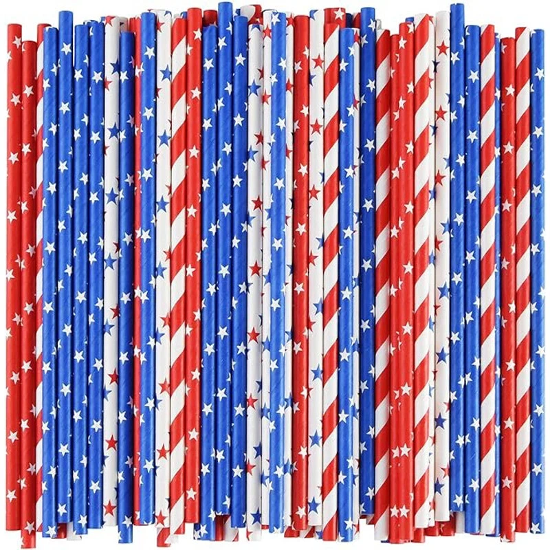 100pc American Flag Red Blue White Paper Straws Stripe/Star Biodegradable Straws