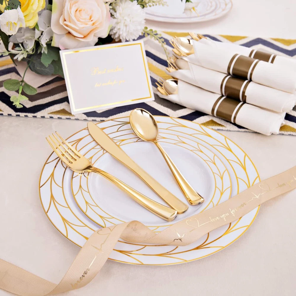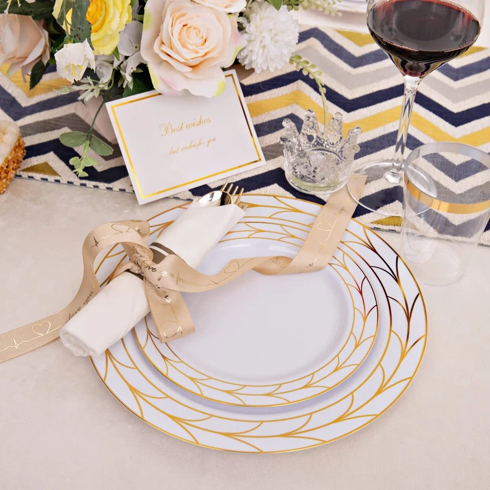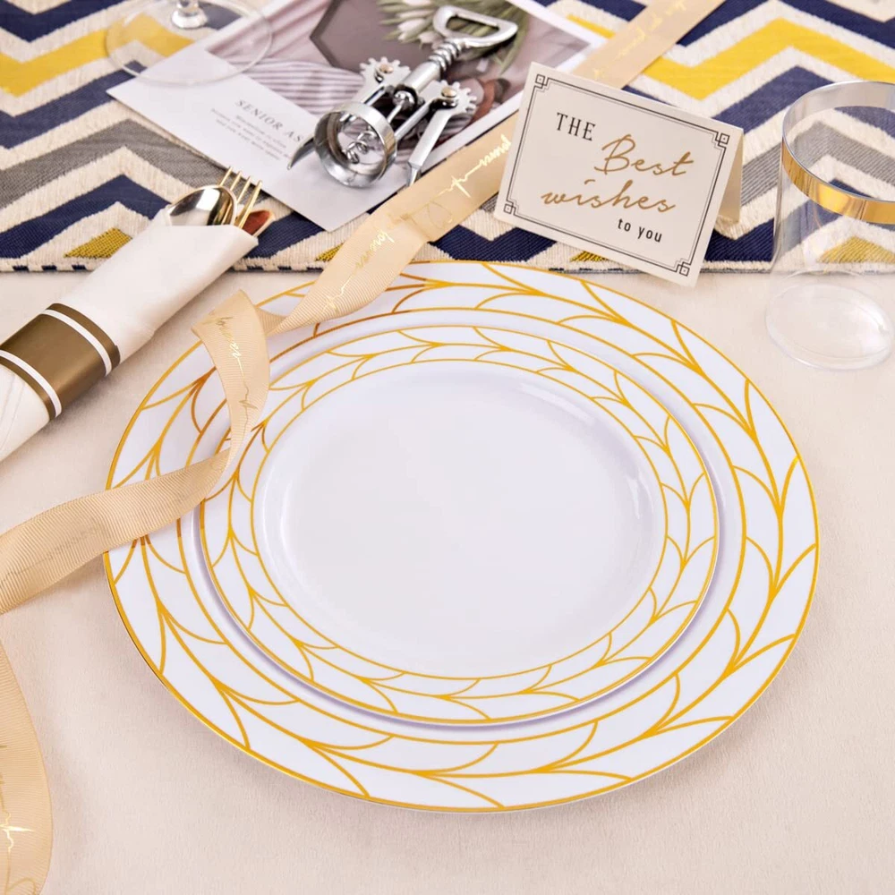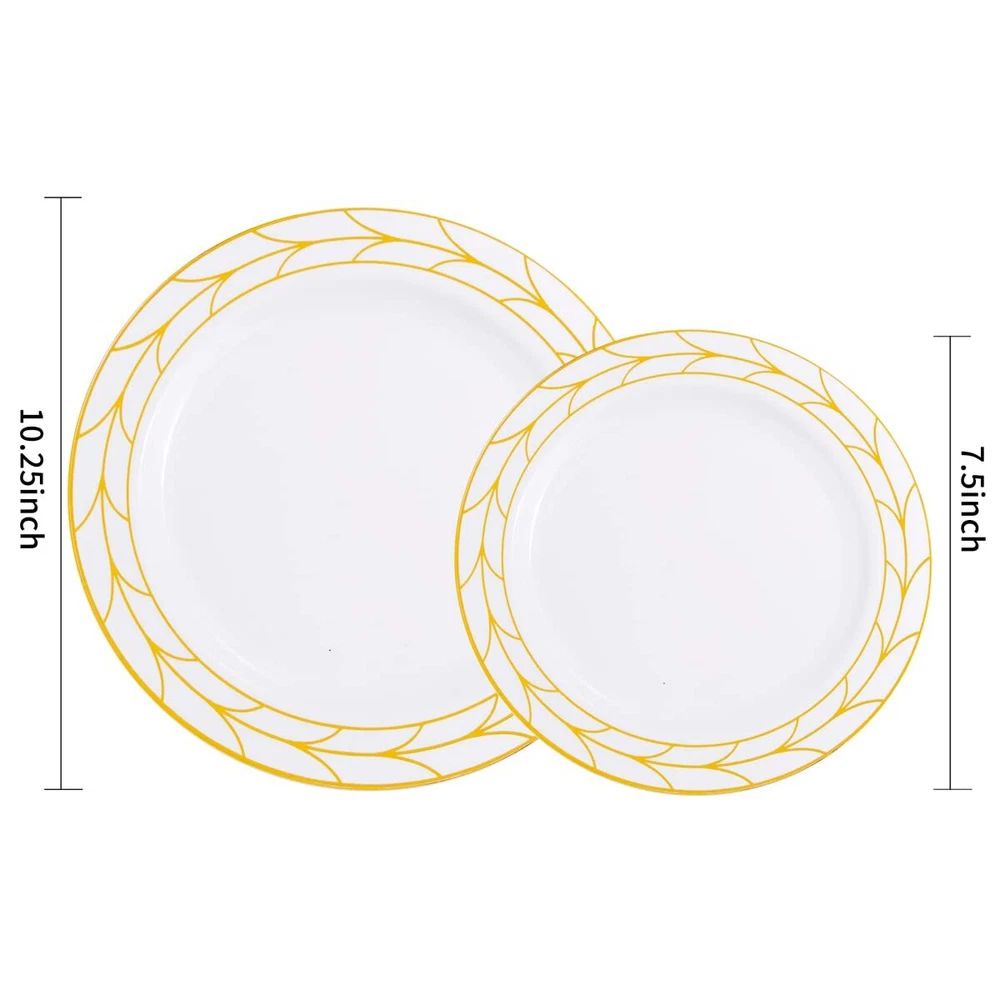 PLASTIC THANKSGIVING PLATES: Disposable Plastic Thanksgiving party plates set Including 50 10.25" dinner plates and 50 7.5" dessert plates, which can serve 50 guests. Disposable Gold plastic plates make your party clean easy! ELEGANT DESIGN: There Simple Gold line in white plastic plates like a China Plate looks elegant Classical . Impress your guests a unforgettable party. Matches with 50pcs pre-rolled Napkin gold silverware set will be Perfecty. HIGN QUALITY:The gold plastic plates is make by food grade plastic that is non-toxic and BPA-free. Important attention The plastic plates are only suite for handle wash and no microware. PERFECT FOR ANY OCCASIONS: This gold plastic plates can meet any request. great for Thsngiving, Christmas, Wedding, Self-service areas, Party, Home, Event, Patio, Poolside, Picnic, and other outdoor use. It is the ideal choice for any party. SERVE: We value our customers. If you are not 100% satisfied with our products, please feel free to contact our customer service, We will provide the best solution for you in 24 hours. Your satisfaction is paramount!